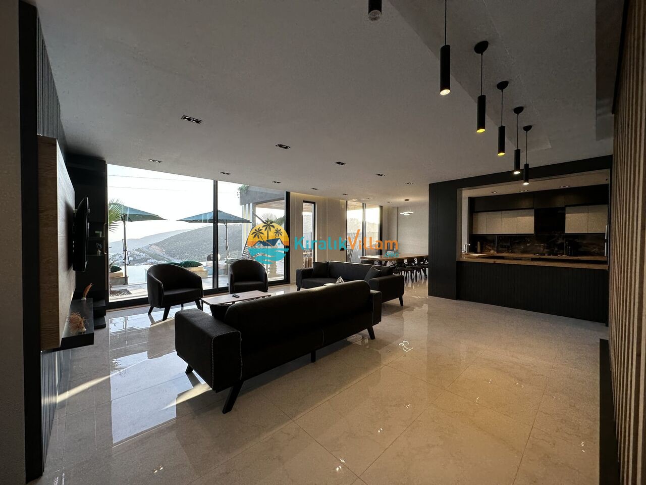 Manzaralı salon içerisinde konforlu oturma grubu, TV, klima bulunmaktadır. Salondan havuz terasına geçiş vardır.