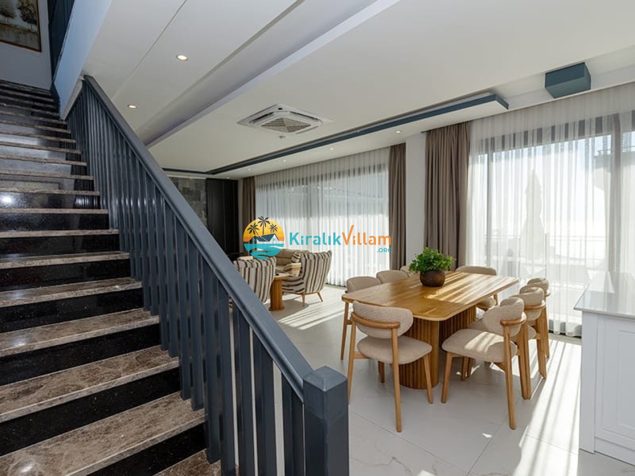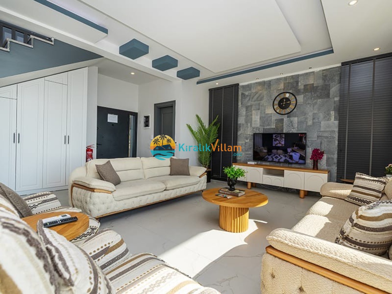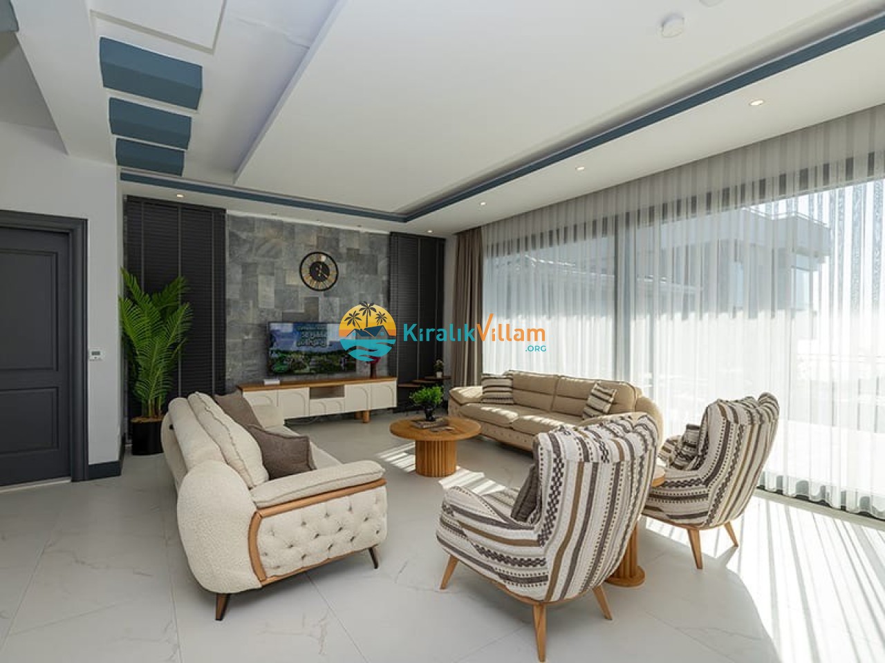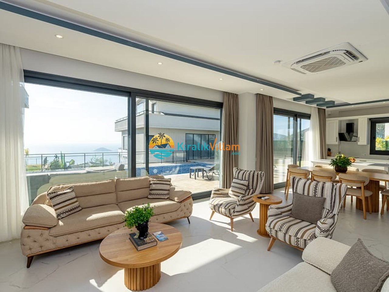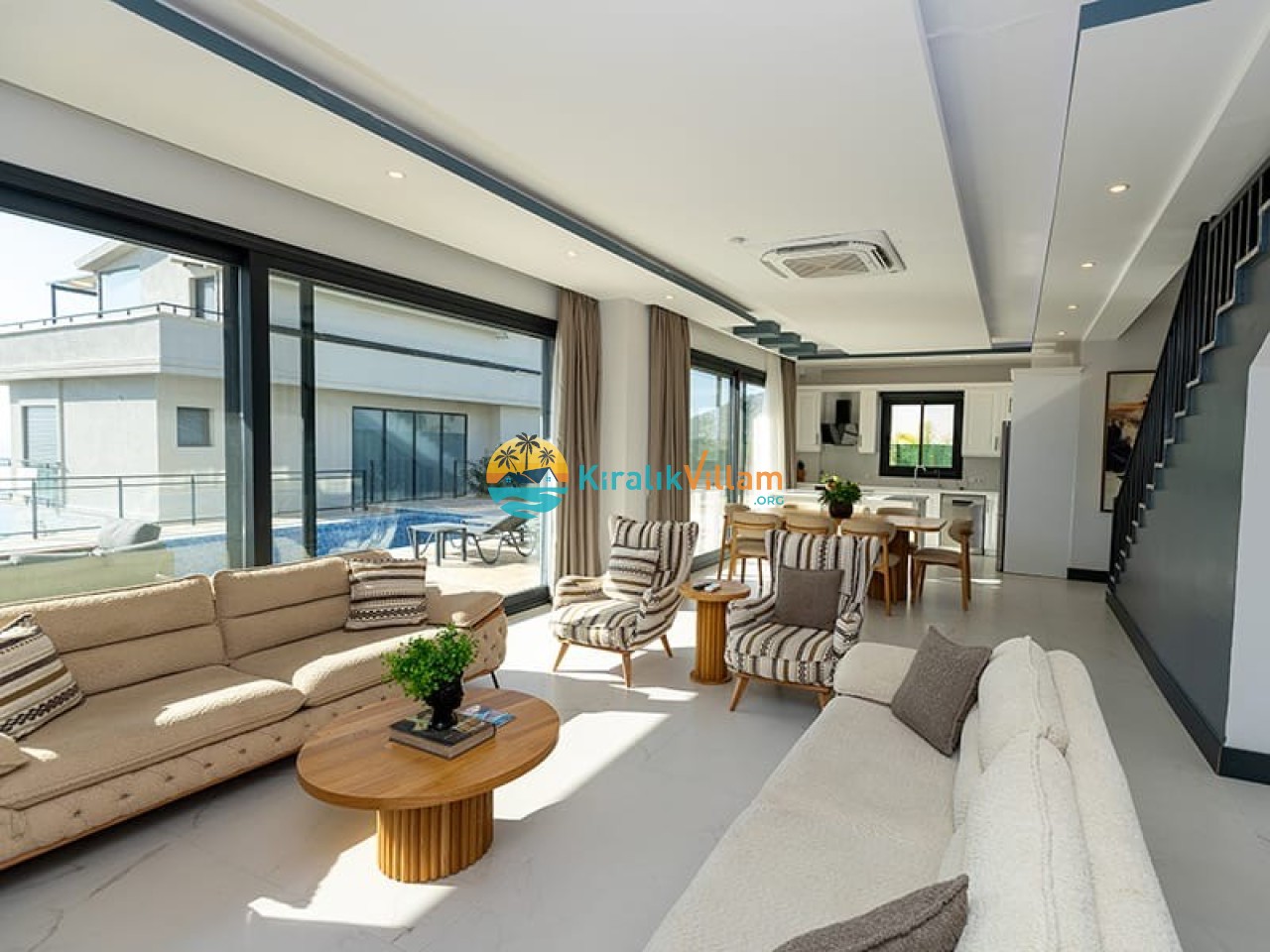 Salon: Modern oturma grubu, televizyon, klima, uydu alıcısı, orta sehpa, yemek masası, sandalyeler ve havuz terasına çıkış bulunmaktadır.