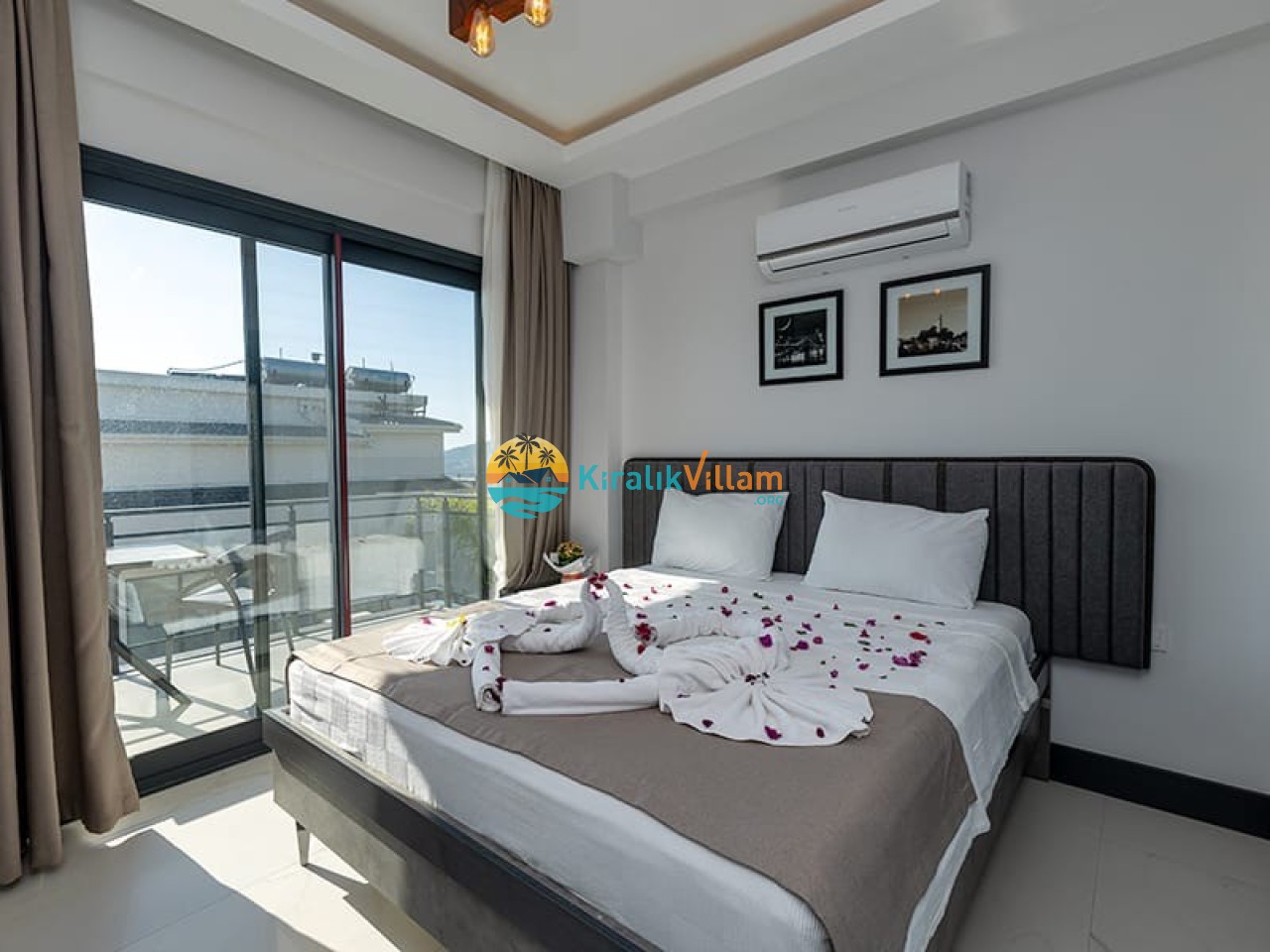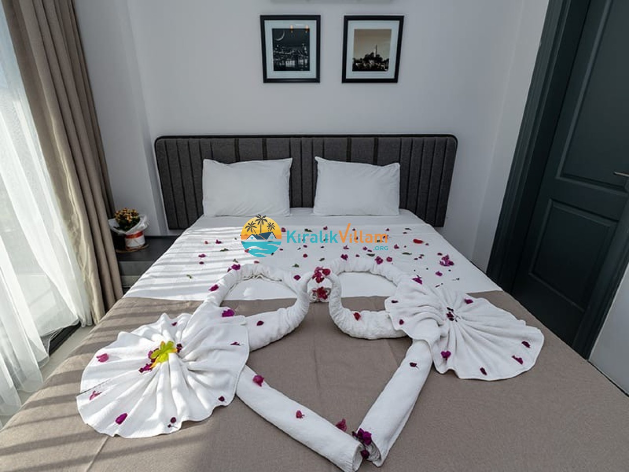 2.Yatak Odası: 1 adet çift kişilik yatak, klima, elbise dolabı, komodin, makyaj masası ve banyo-wc bulunmaktadır.