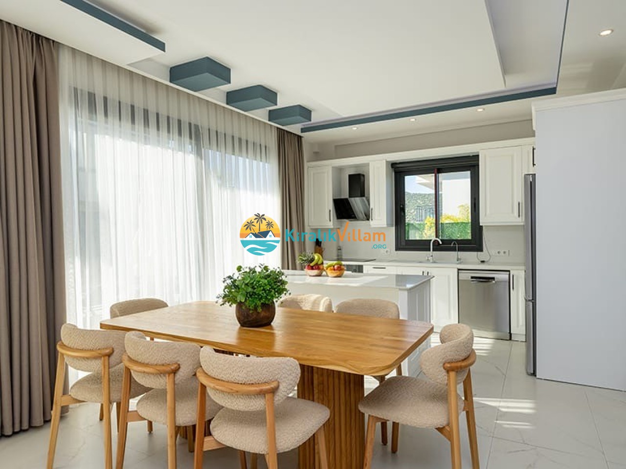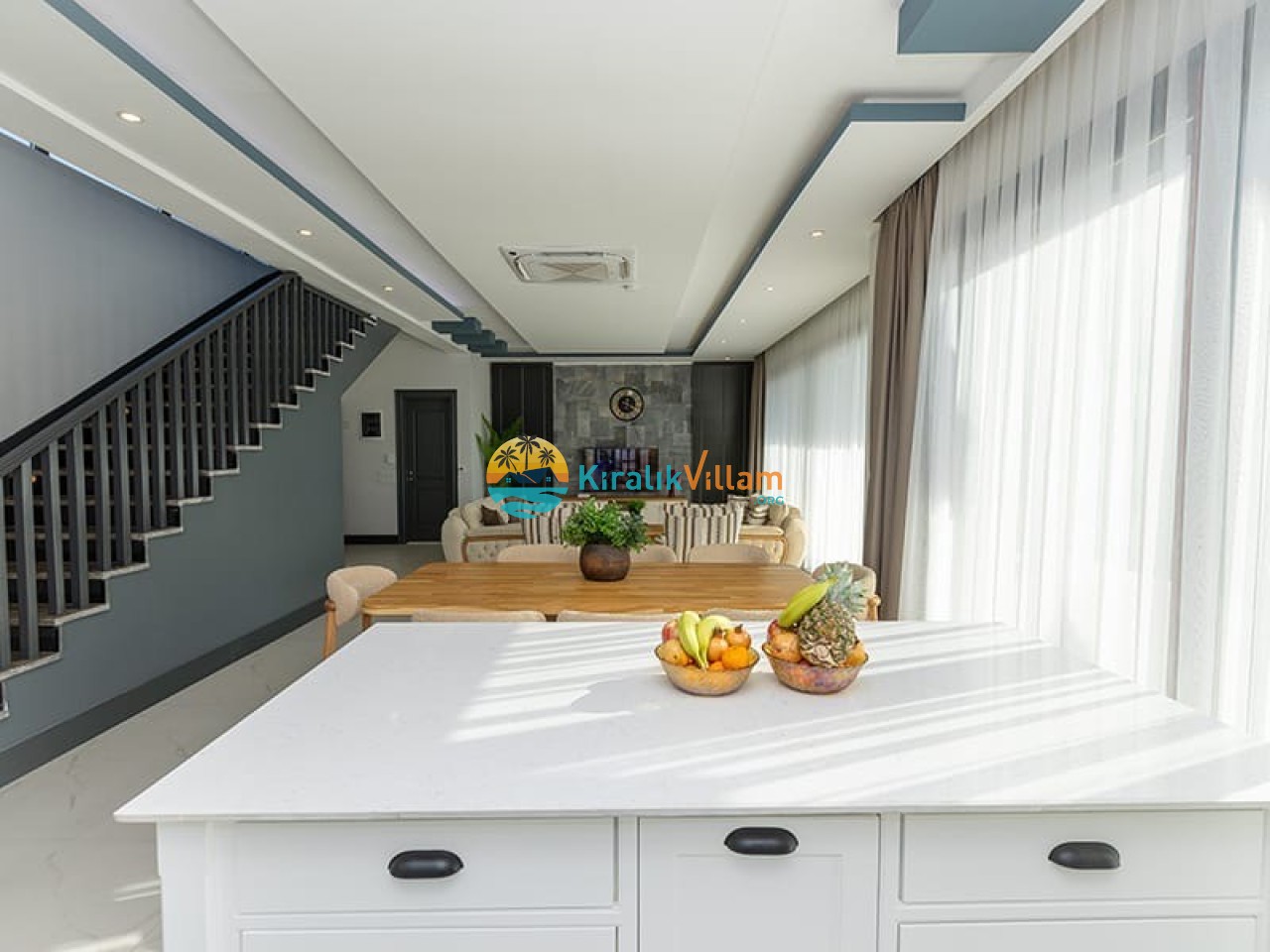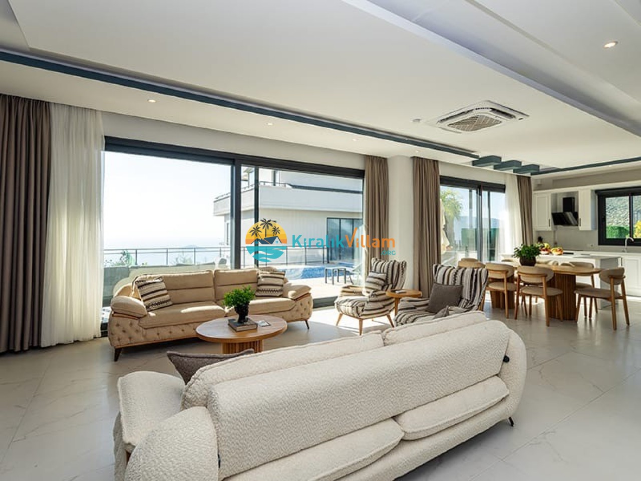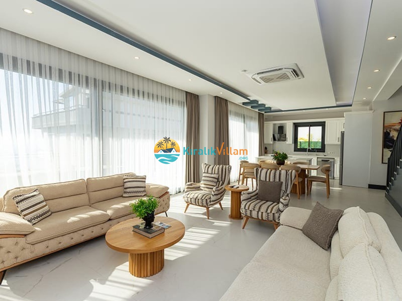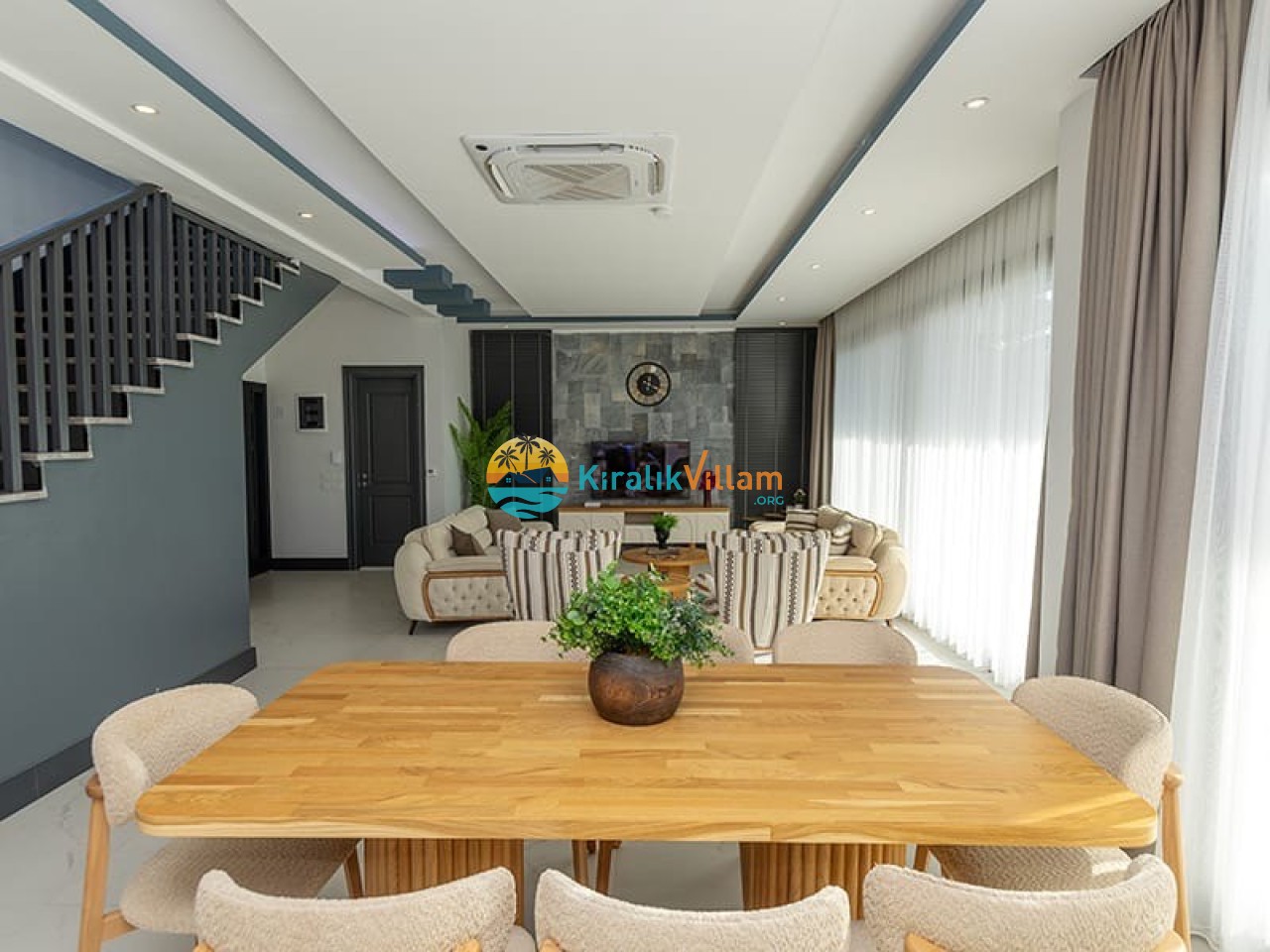 Modern oturma grubu, televizyon, klima, uydu alıcısı, orta sehpa, yemek masası, sandalyeler ve havuz terasına çıkış bulunmaktadır.