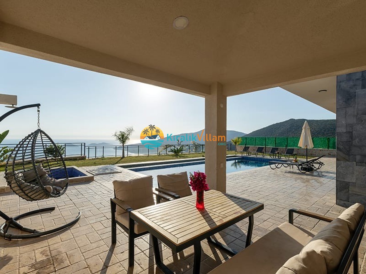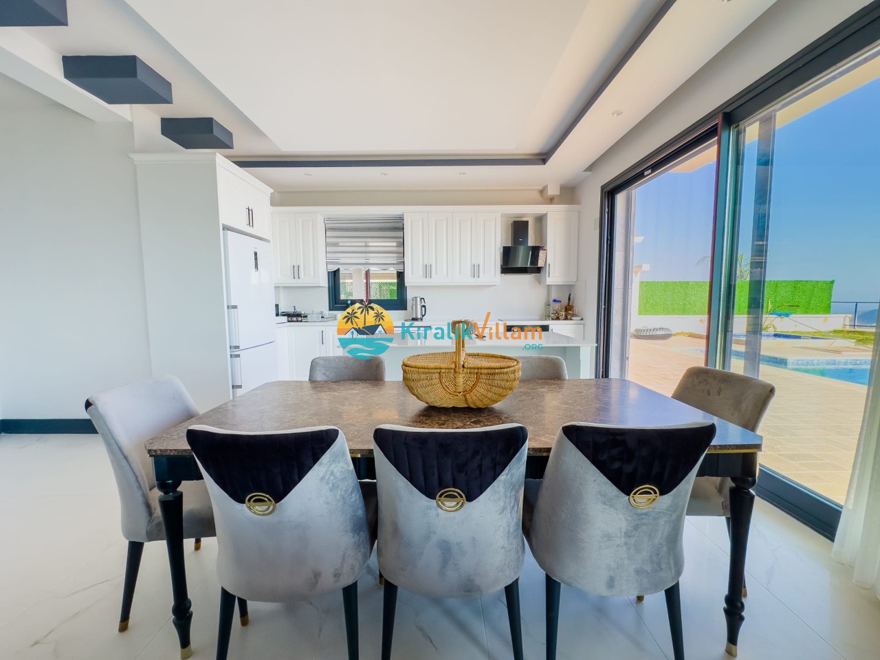 Modern oturma grubu, televizyon, klima, uydu alıcısı, orta sehpa, yemek masası, sandalyeler ve havuz terasına çıkış bulunmaktadır.