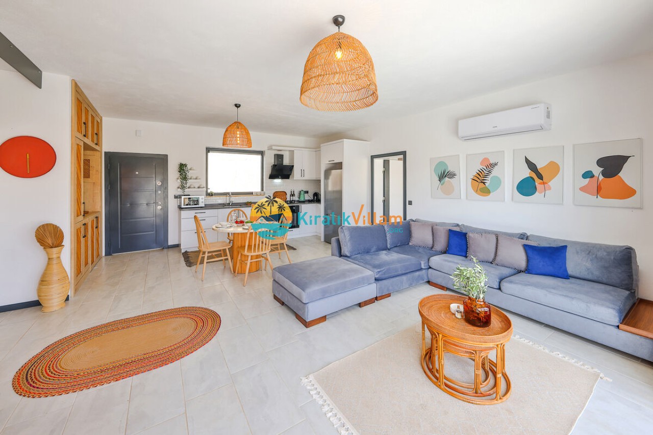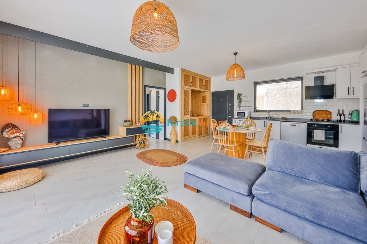 Salon: Doğa manzaralı salon içerisinde, koltuk takımı, orta sehpa, TV, TV ünitesi, klima, uydu alıcısı, yemek masası yer almaktadır.