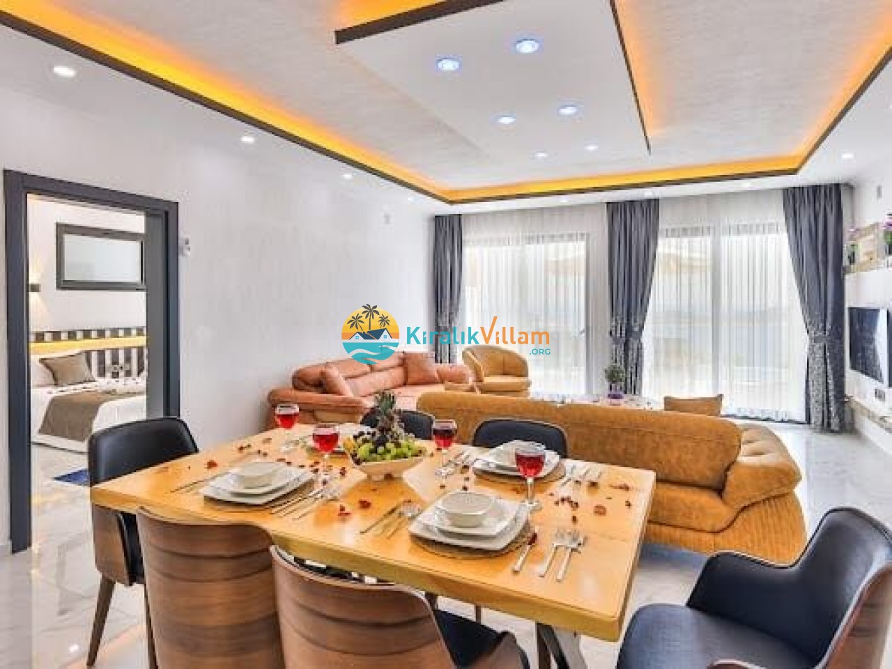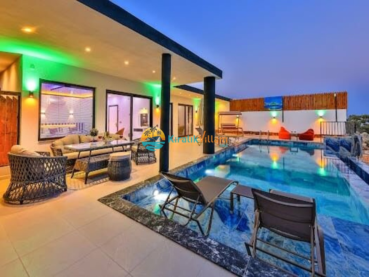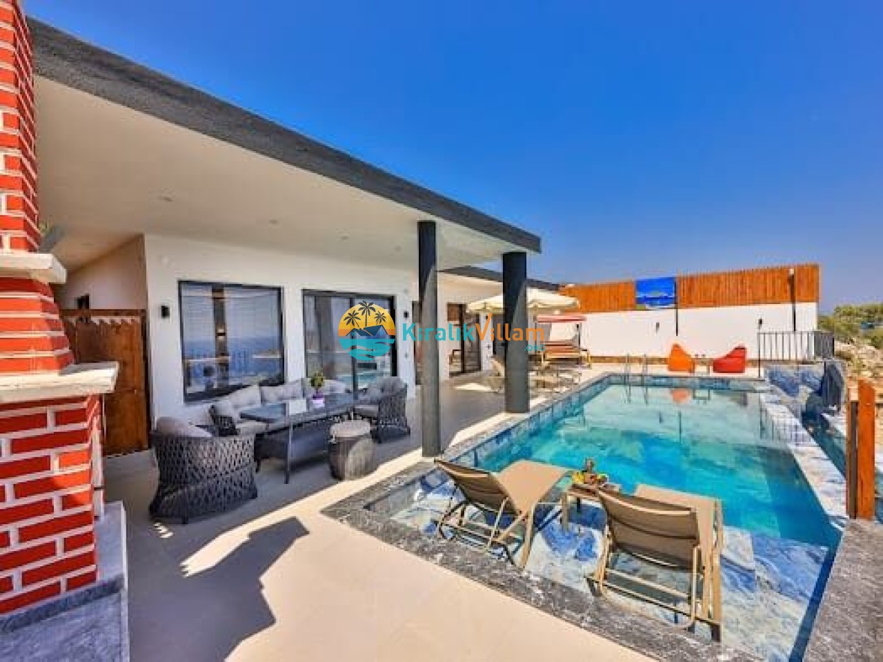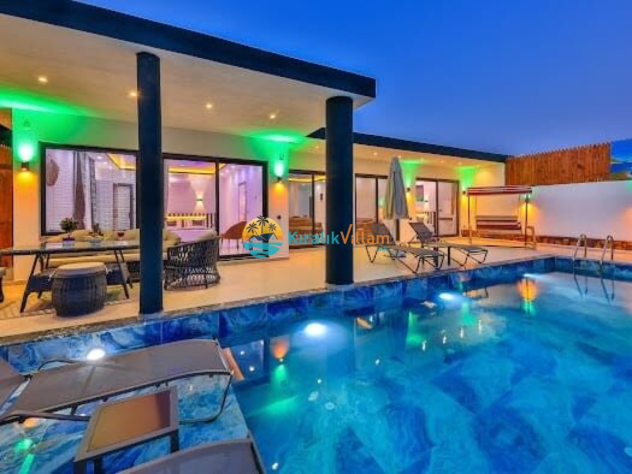 Salon: Modern ve lüks dizayna sahip salon içerisinde konforlu oturma grubu, TV, DVD oynatıcı, klima ve internet yer almaktadır. Salondan havuz terasına geçiş vardır.