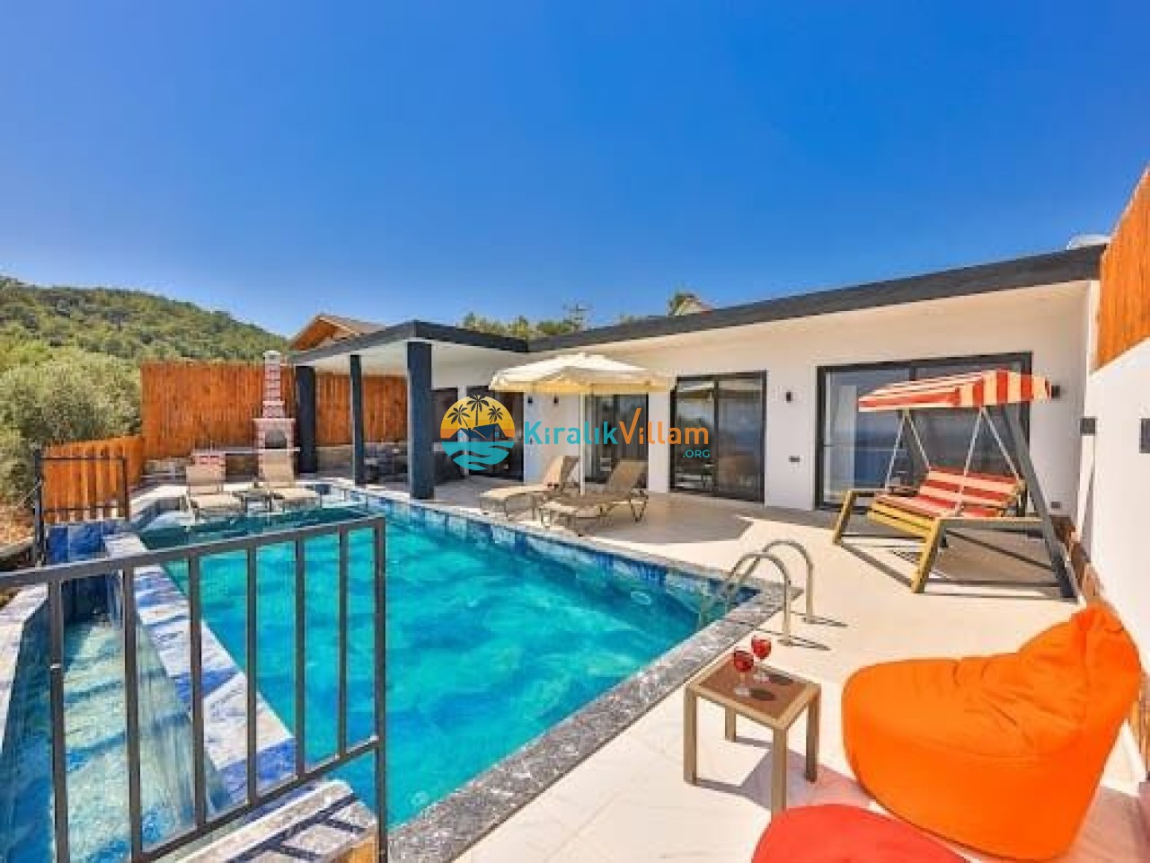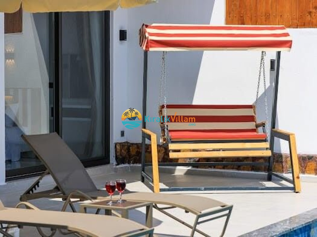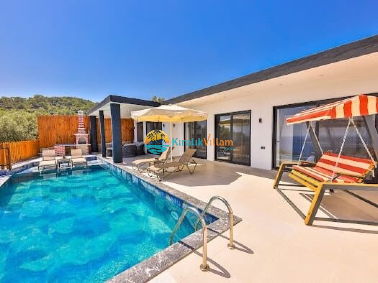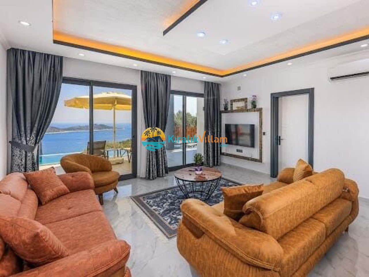 Salon: Modern ve lüks dizayna sahip salon içerisinde konforlu oturma grubu, TV, DVD oynatıcı, klima ve internet yer almaktadır. Salondan havuz terasına geçiş vardır.