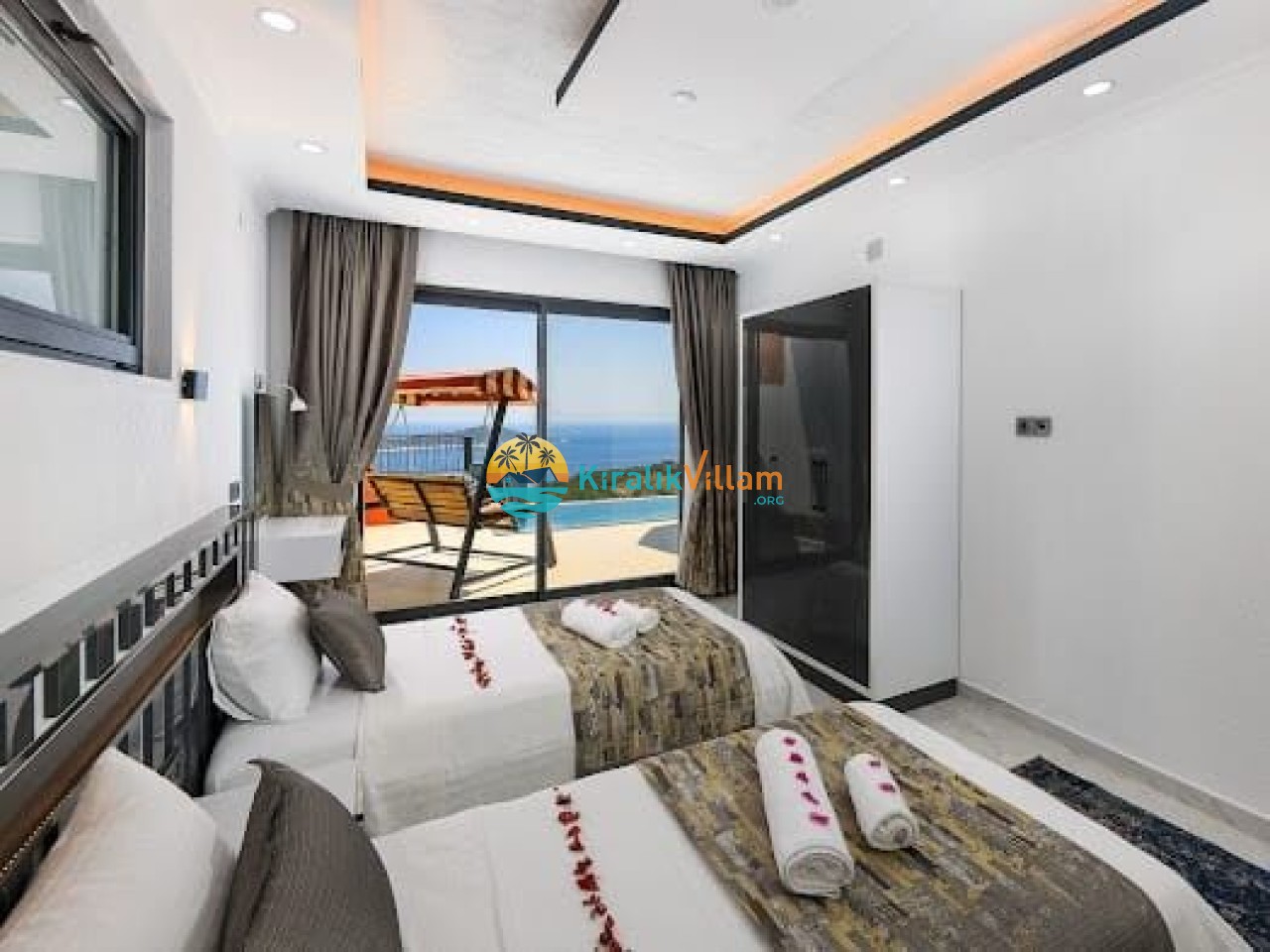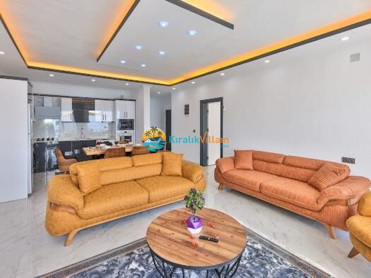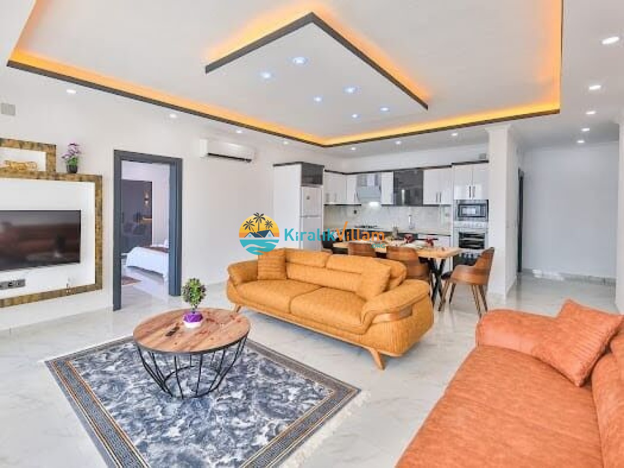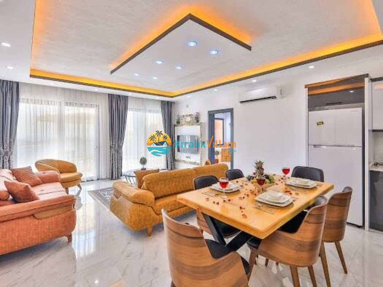 Salon: Modern ve lüks dizayna sahip salon içerisinde konforlu oturma grubu, TV, DVD oynatıcı, klima ve internet yer almaktadır. Salondan havuz terasına geçiş vardır.