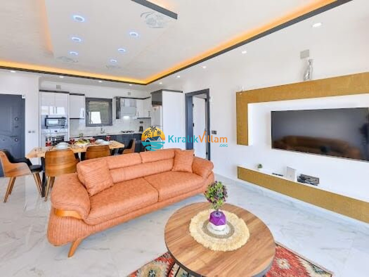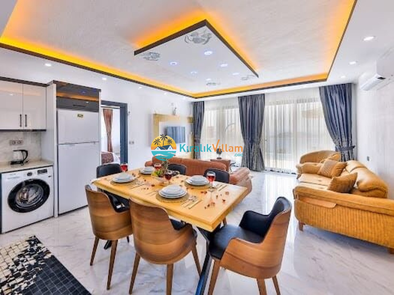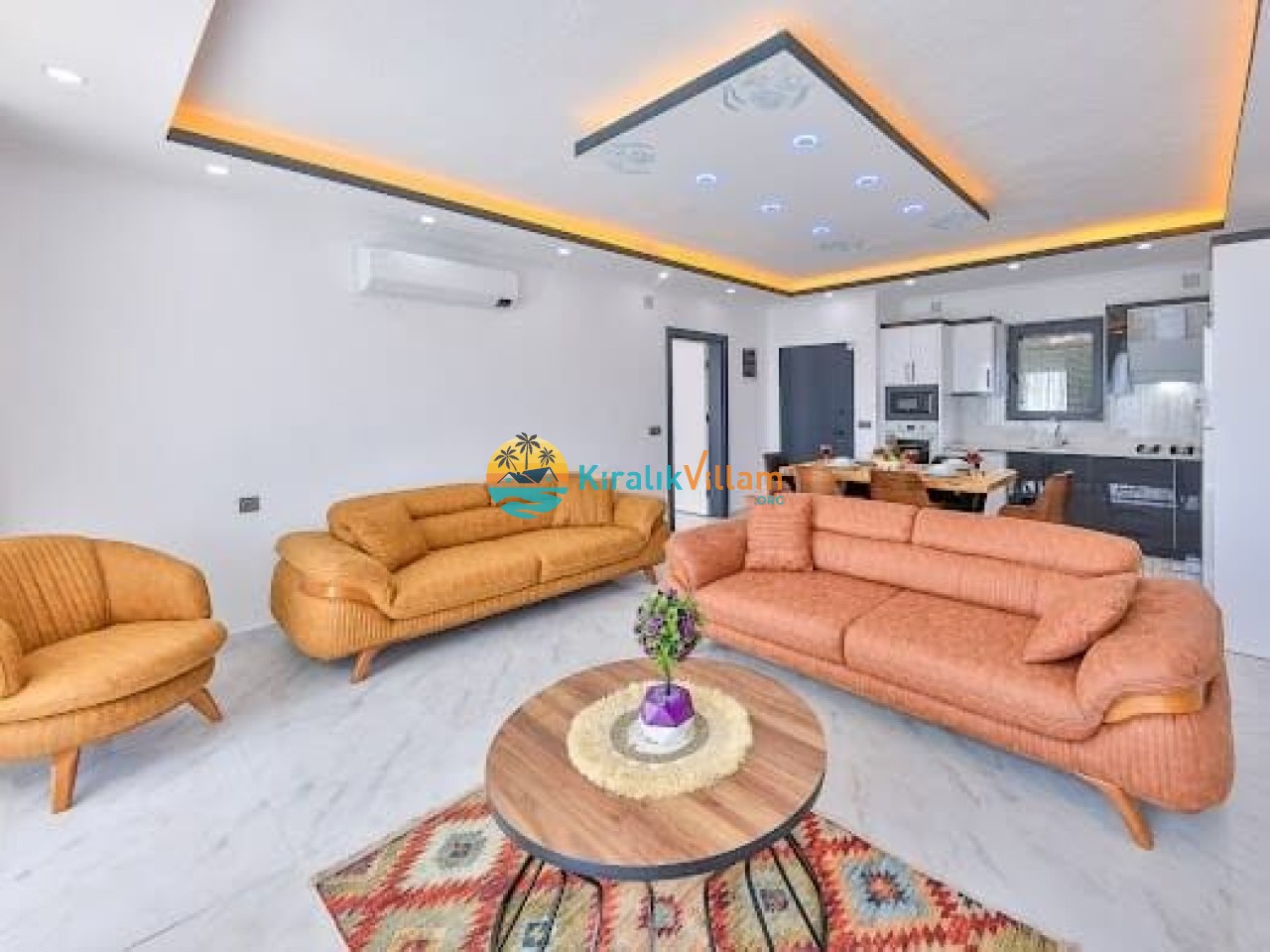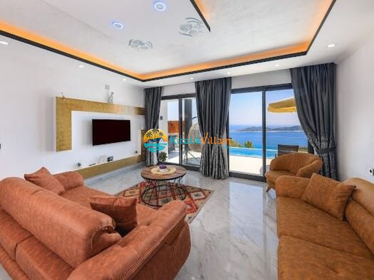 Modern ve lüks dizayna sahip salon içerisinde konforlu oturma grubu, TV, DVD oynatıcı, klima ve internet yer almaktadır. Salondan havuz terasına geçiş vardır.