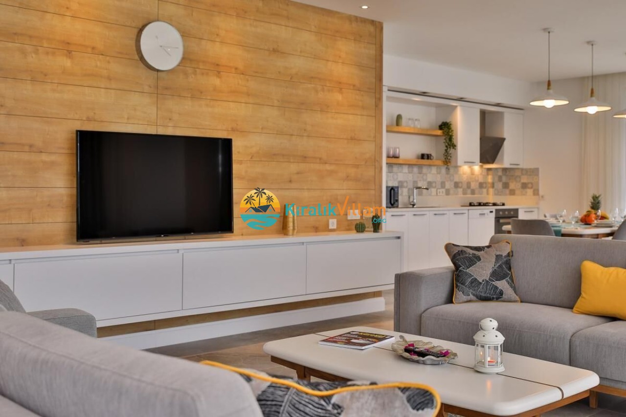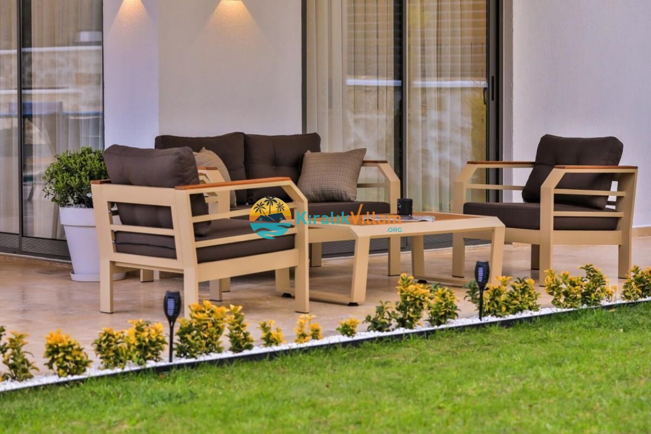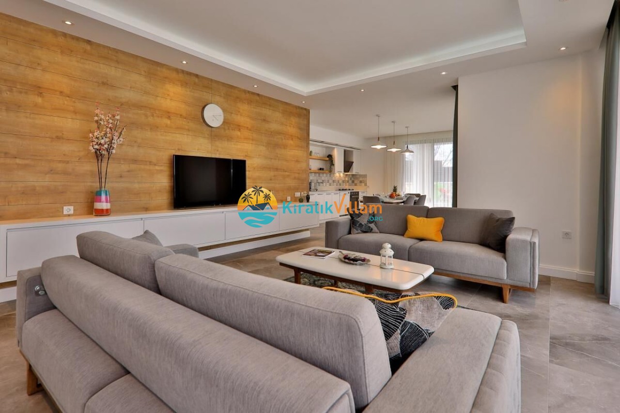 Salon: 2021 yılı içerisinde sitemize dahil olan villamızın iç dizaynı da son modaya uygun olarak modern bir şekilde tasarlanmıştır. Çeşitli dekoratif eşyalarla süslediğimiz salonumuz havuzlu bahçeye açılıyor. salonunda oturma grubu, tv, internet, klima, yemek masası, sehpa bulunmaktadır.
