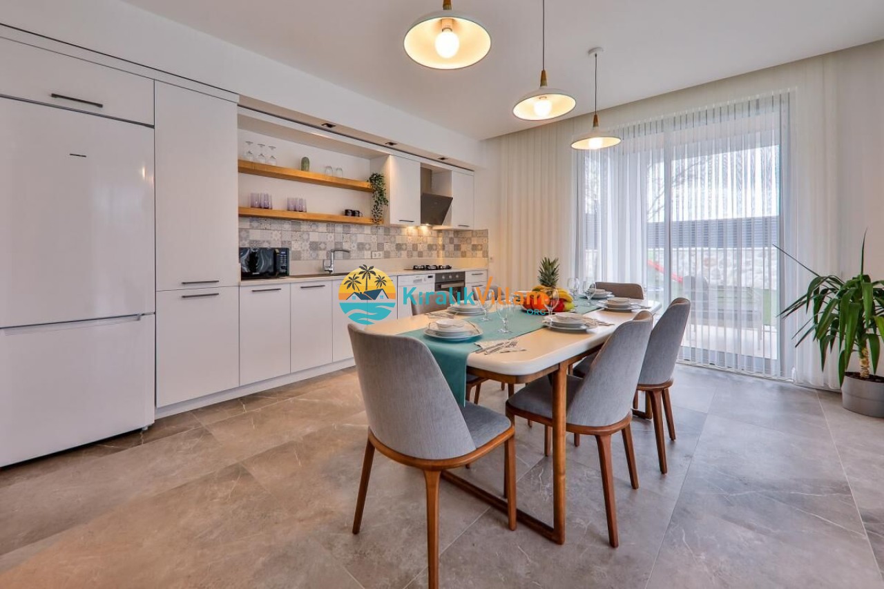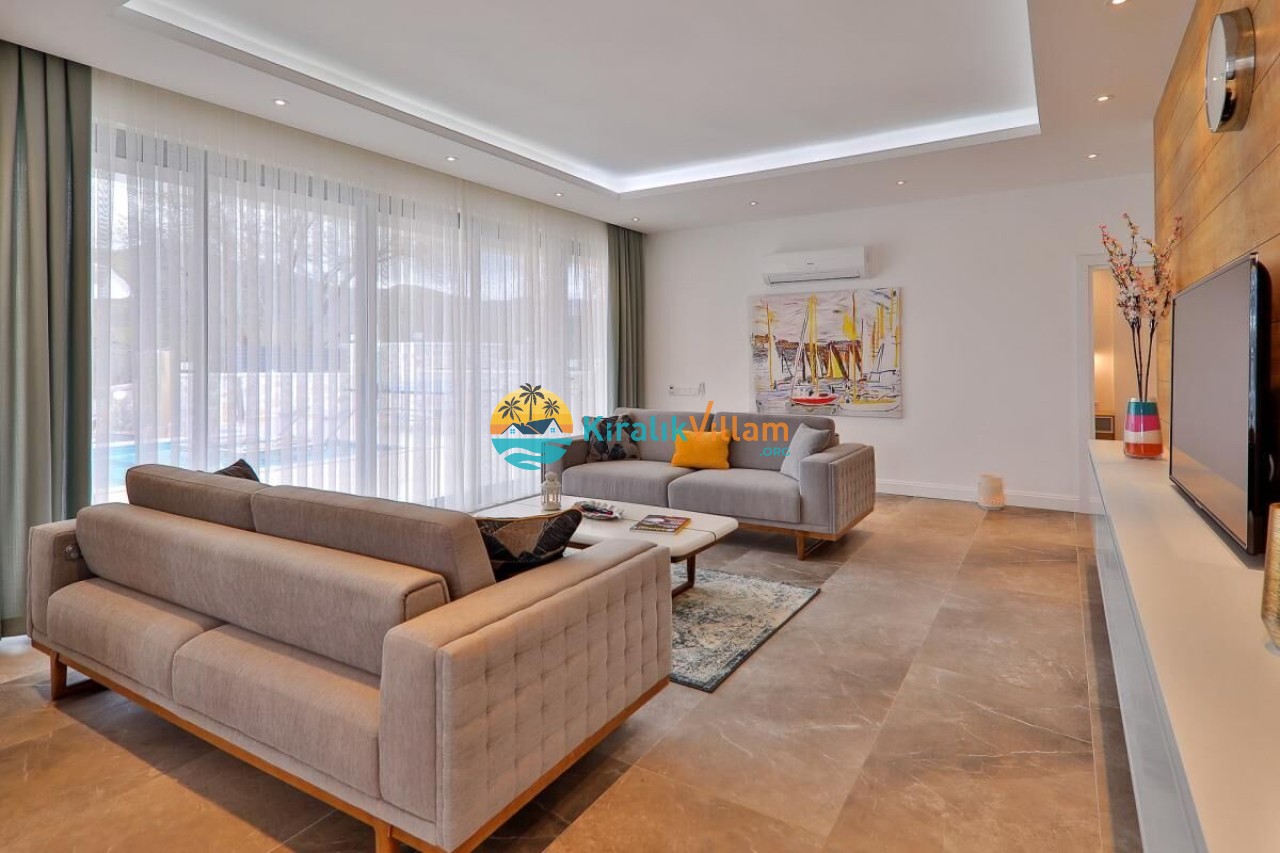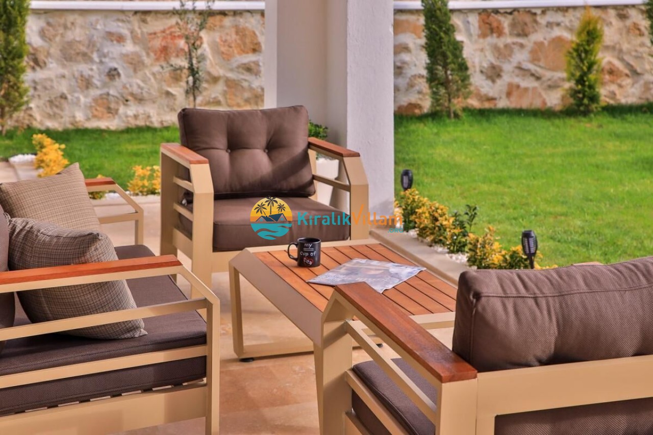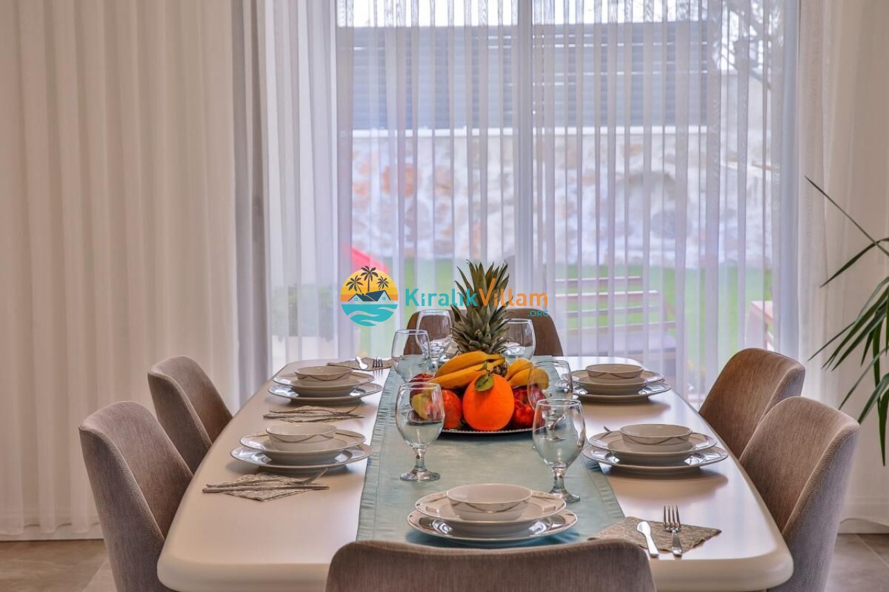 Salon: 2021 yılı içerisinde sitemize dahil olan villamızın iç dizaynı da son modaya uygun olarak modern bir şekilde tasarlanmıştır. Çeşitli dekoratif eşyalarla süslediğimiz salonumuz havuzlu bahçeye açılıyor. salonunda oturma grubu, tv, internet, klima, yemek masası, sehpa bulunmaktadır.