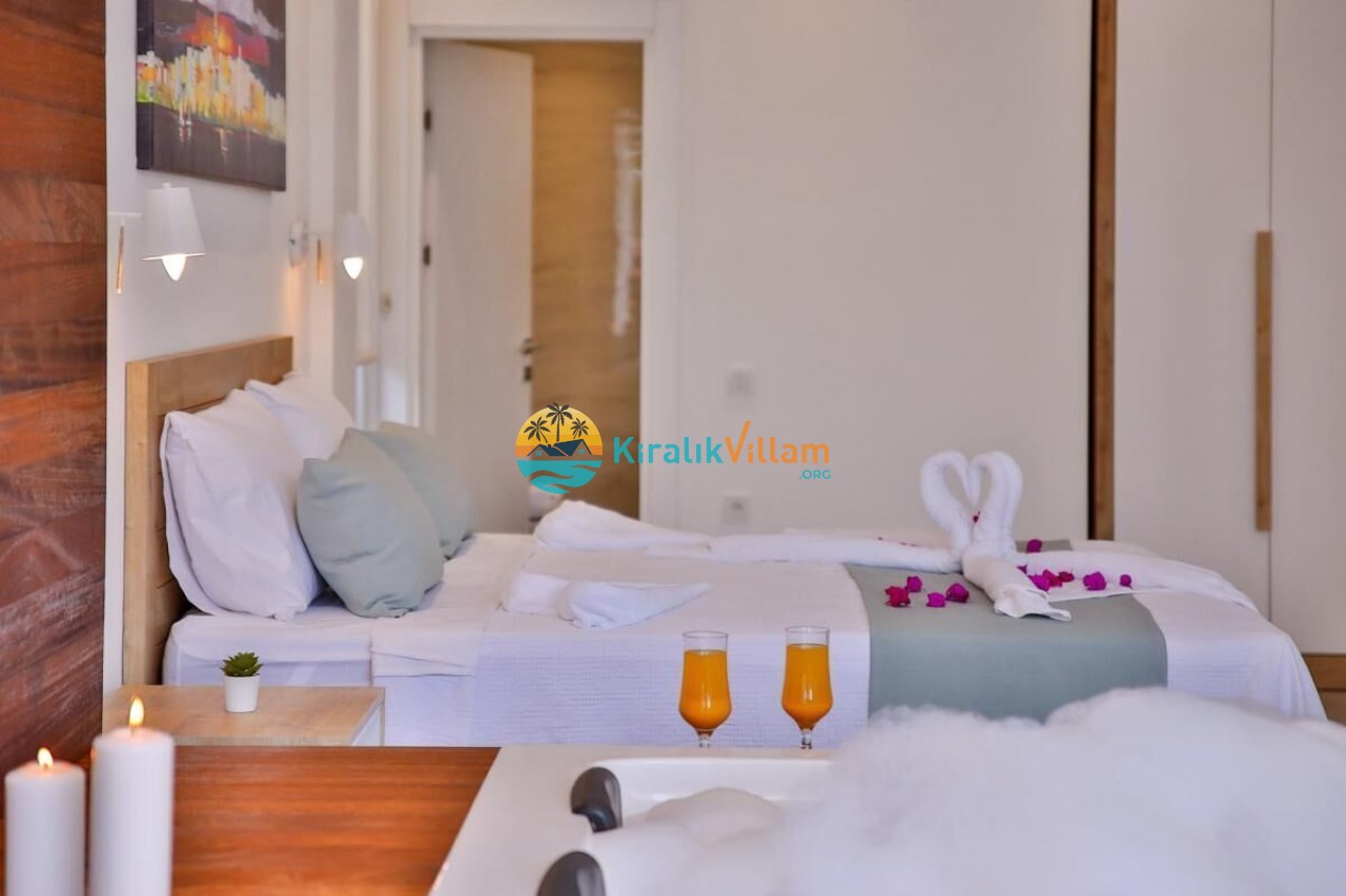 1.Yatak Odası: Çift kişilik süit yatak odamızda adeta terapi olacak jakuzi bulunmaktadır. Klima, komodin, elbise dolabı, makyaj masası, banyo ve lavabo bulunmaktadır.
