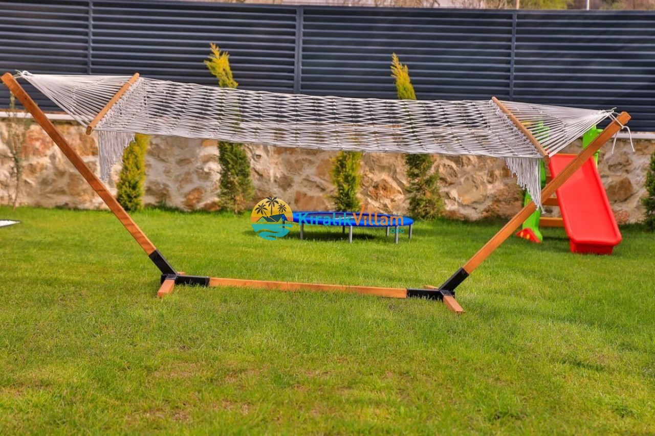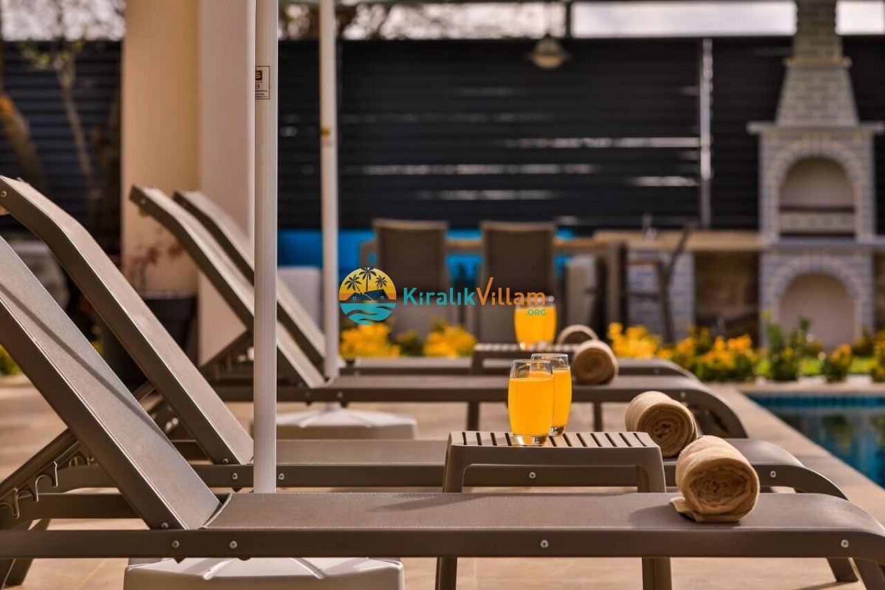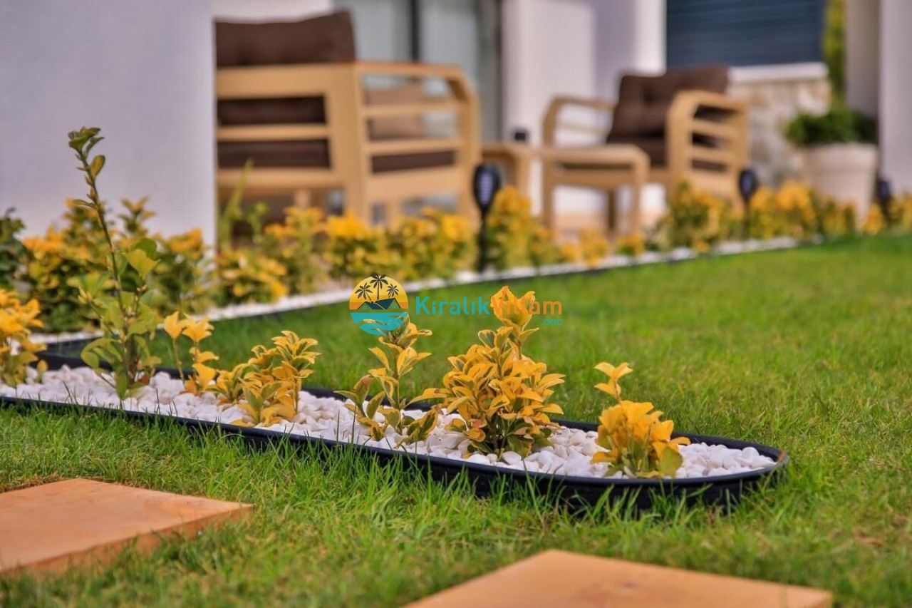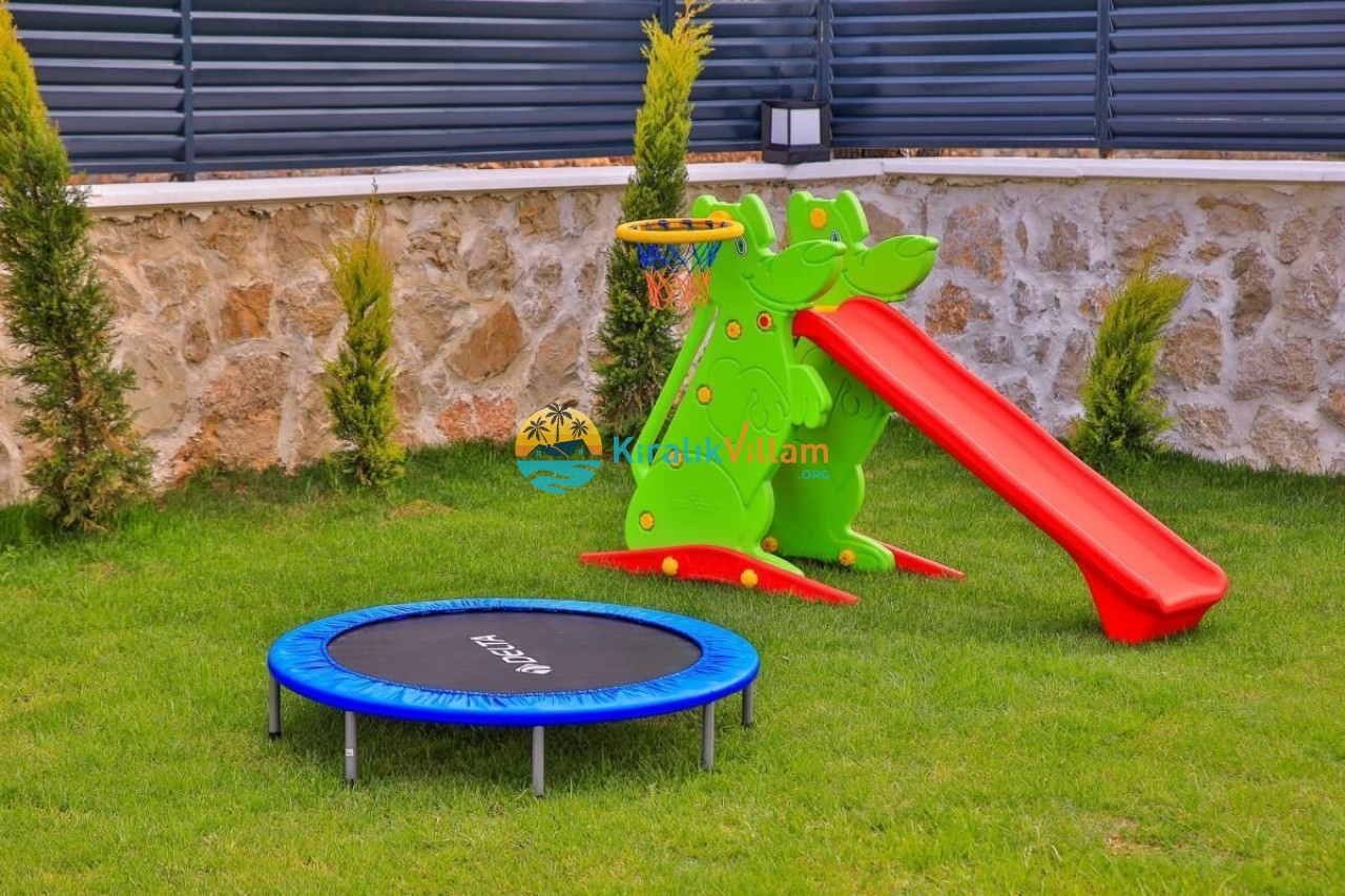 Havuz ve Bahçe: Villamızın bahçesi oldukça geniştir ve çocuklu ailelerimiz için oldukça uygundur. İçerisinde çocuklar için kaydırak, salıncak, hamam ve trambolin bulunmaktadır. Yalnızca çocukların değil ebeveynlerinin oynamaktan keyif alacağı masa tenisi ve langırt masası bulunmaktadır. Villamız korunaklı olduğundan dışarıdan kesinlikle görünmemektedir. 2 metre sığ özel yüzme havuzunun içinde şezlong bulunan bahçemizde ekstra şezlonglar, şemsiye, yemek masası, salıncak bulunmaktadır.
