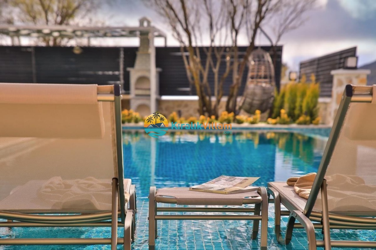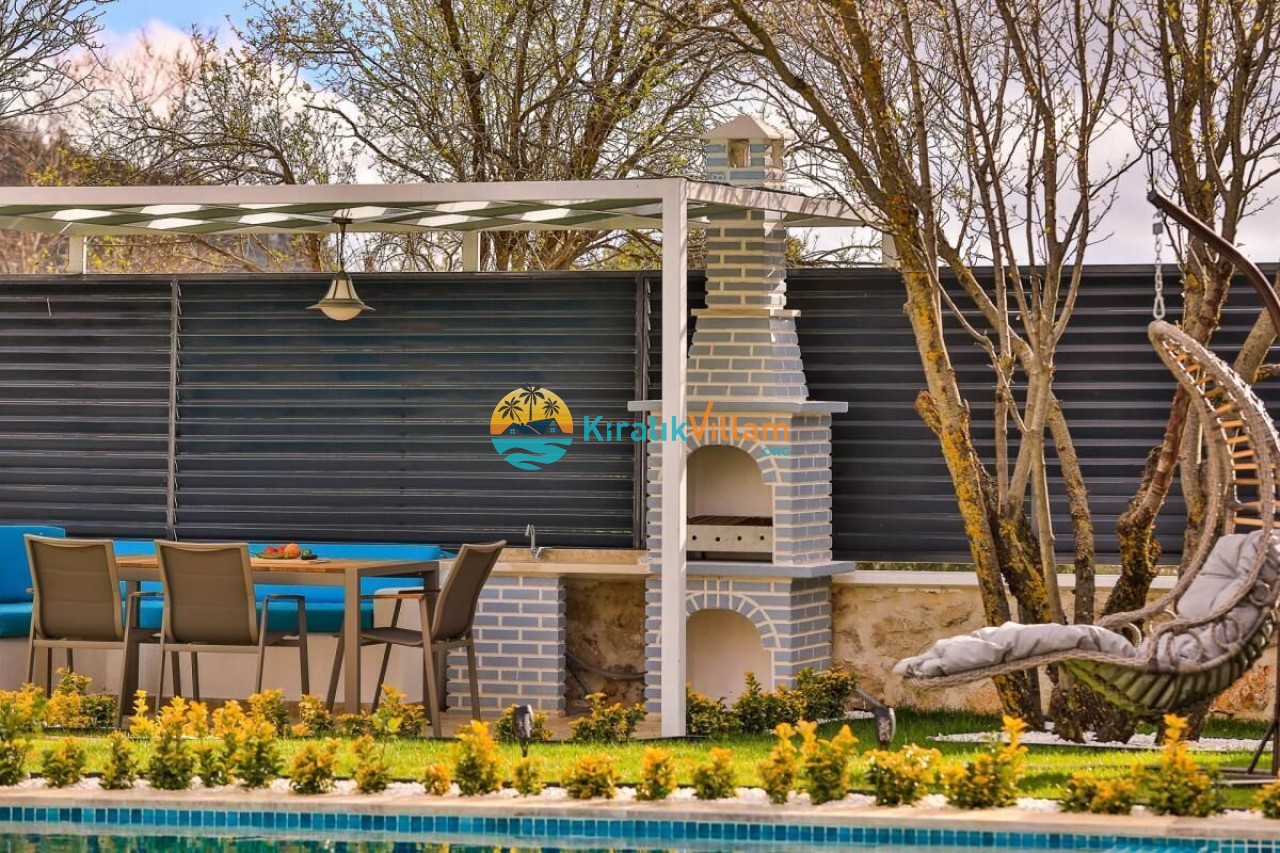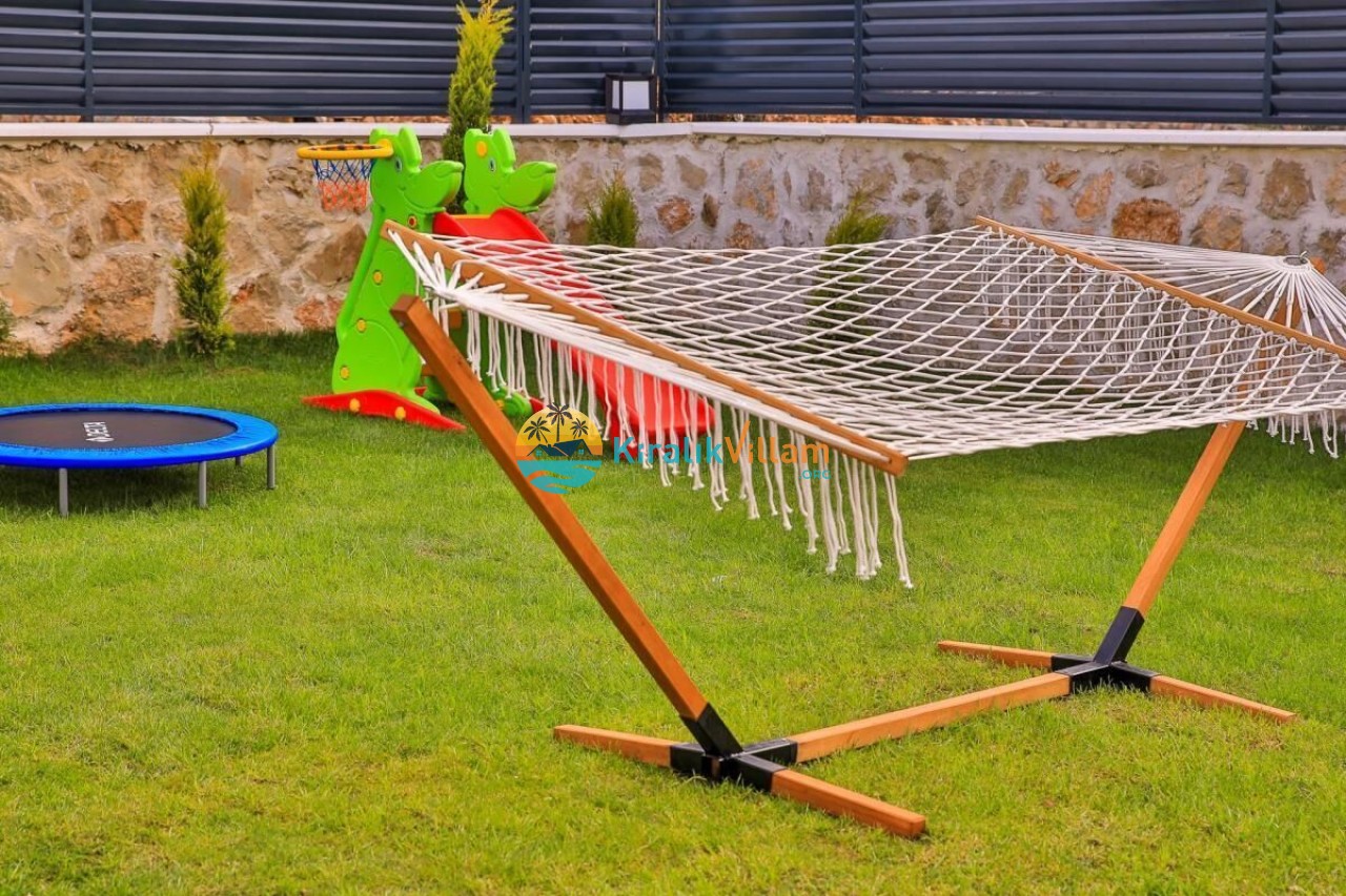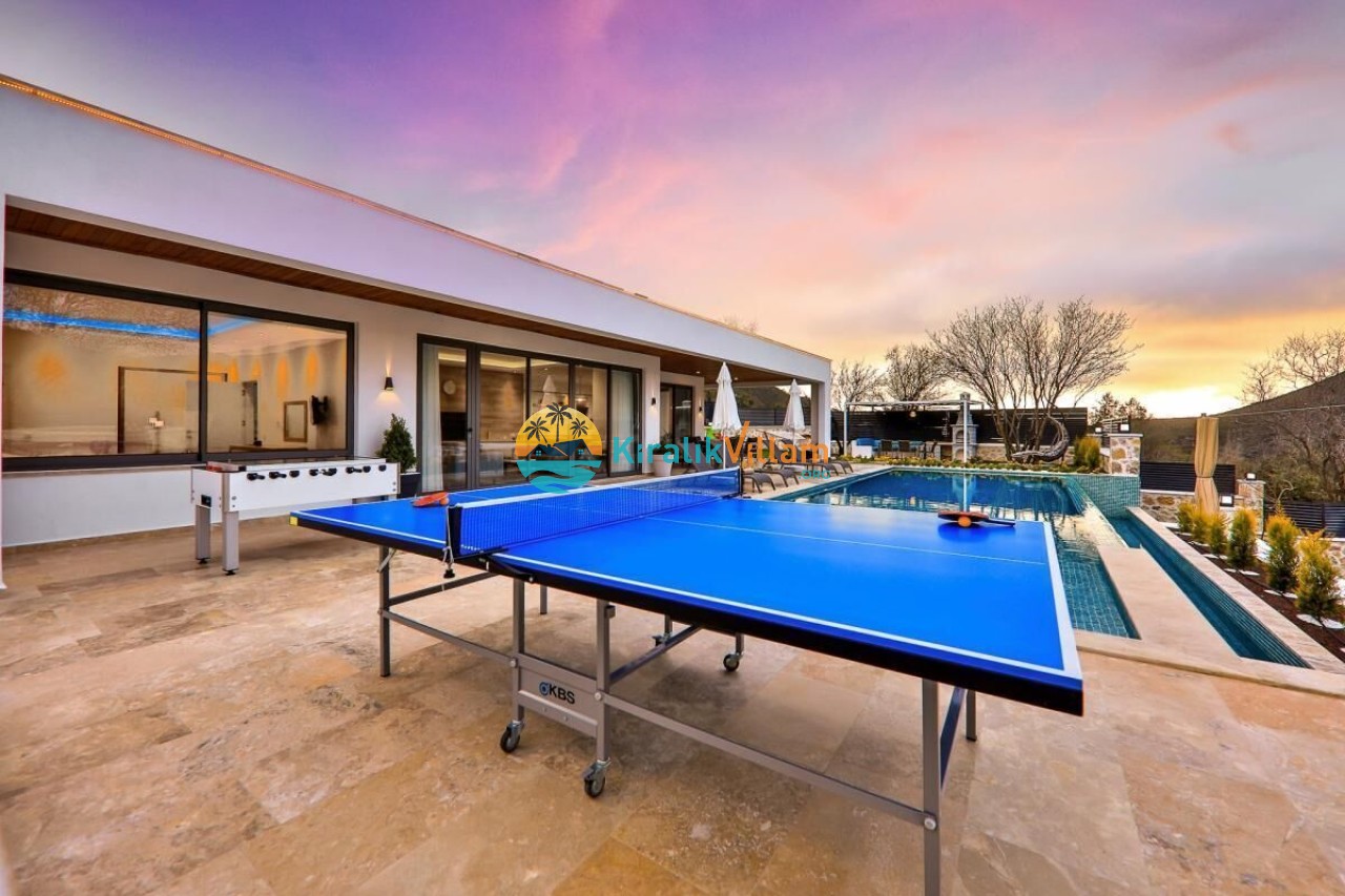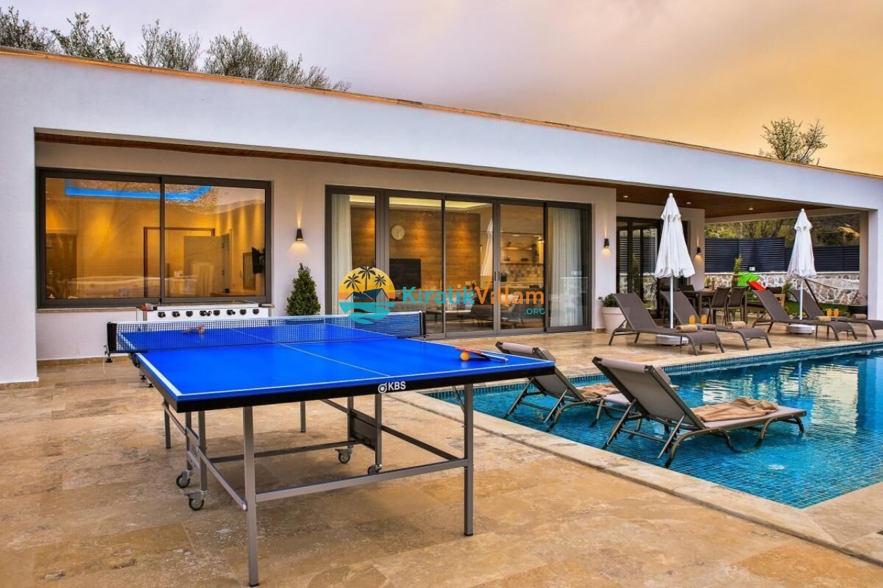 Havuz ve Bahçe: Villamızın bahçesi oldukça geniştir ve çocuklu ailelerimiz için oldukça uygundur. İçerisinde çocuklar için kaydırak, salıncak, hamam ve trambolin bulunmaktadır. Yalnızca çocukların değil ebeveynlerinin oynamaktan keyif alacağı masa tenisi ve langırt masası bulunmaktadır. Villamız korunaklı olduğundan dışarıdan kesinlikle görünmemektedir. 2 metre sığ özel yüzme havuzunun içinde şezlong bulunan bahçemizde ekstra şezlonglar, şemsiye, yemek masası, salıncak bulunmaktadır.