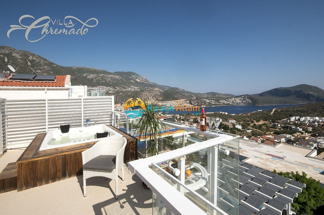 Villa Chremado, Kalkan, Kalamar Koyu bölgesinde bulunan özel villa seçeneklerimizdendir. 3 yatak odalı, 6 kişilik kapasiteye sahip Villa Chremado, modern tasarıma sahip, son derece gösterişli bir villadır. Villamızın tasarımı en ince ayrıntısına kadar düşünülmüştür. Geniş havuz terasında aileniz ve sevdiklerinizle keyifli dakikalar geçirebilir, güneşin ve havuzun tadını en iyi şekilde çıkarabilirsiniz.