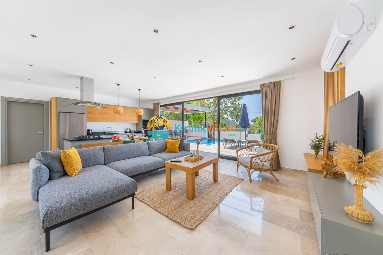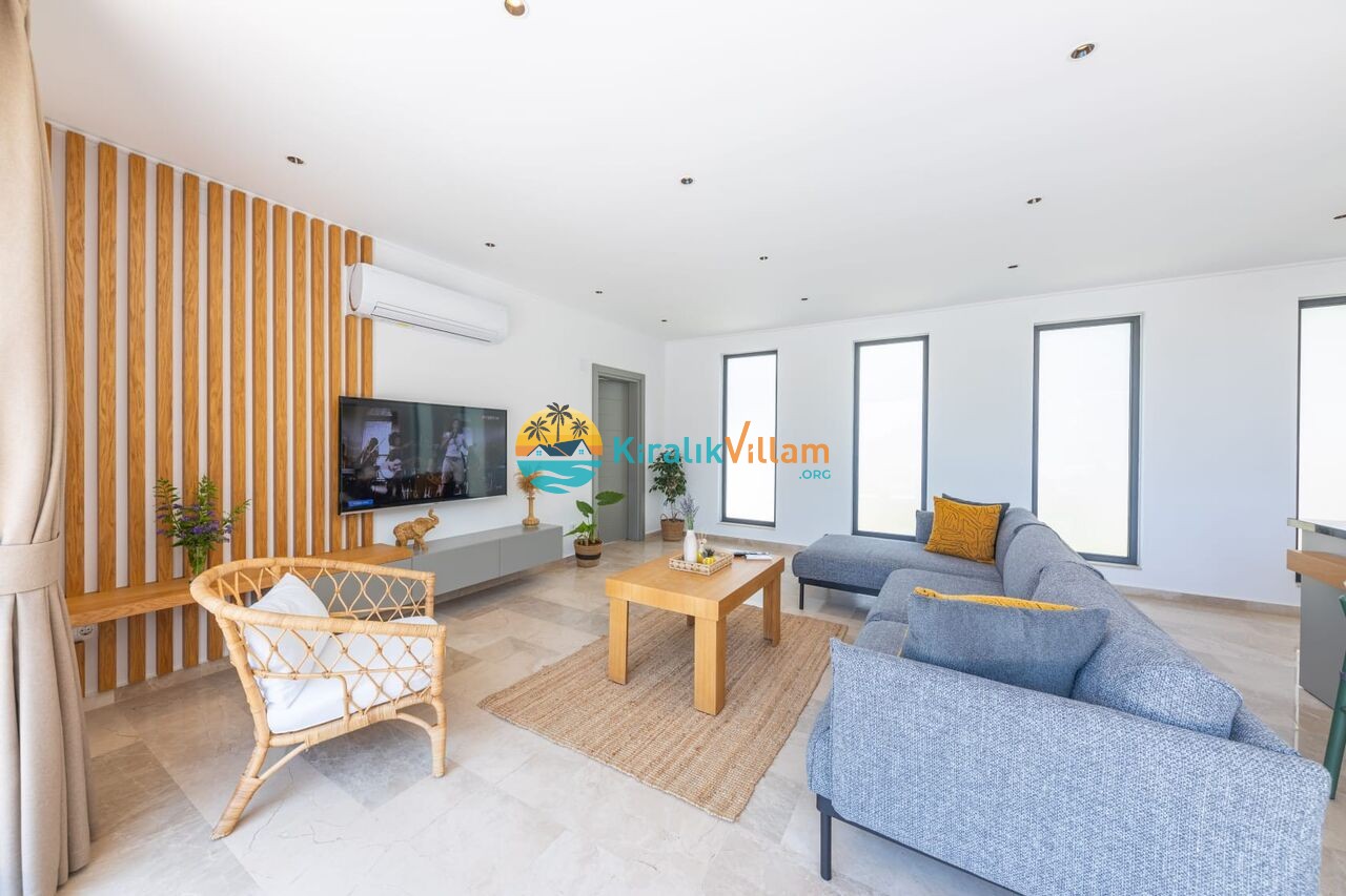 Doğa manzaralı ve modern eşyalarla tasarlanmış salonda oturma grubu, sehpa, televizyon, uydu alıcı, internet bulunmaktadır. Havuz terasına çıkış yapılabilmektedir.