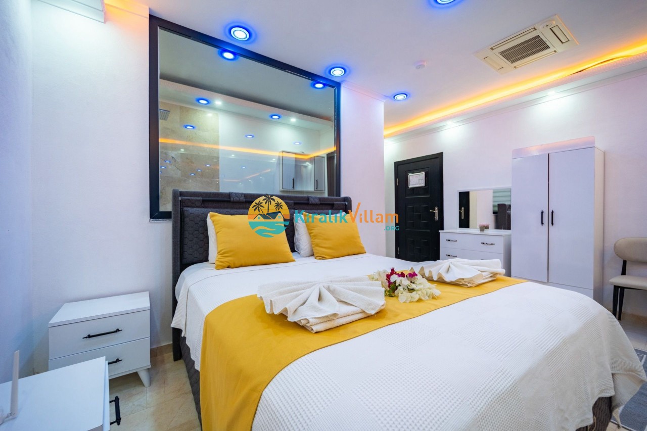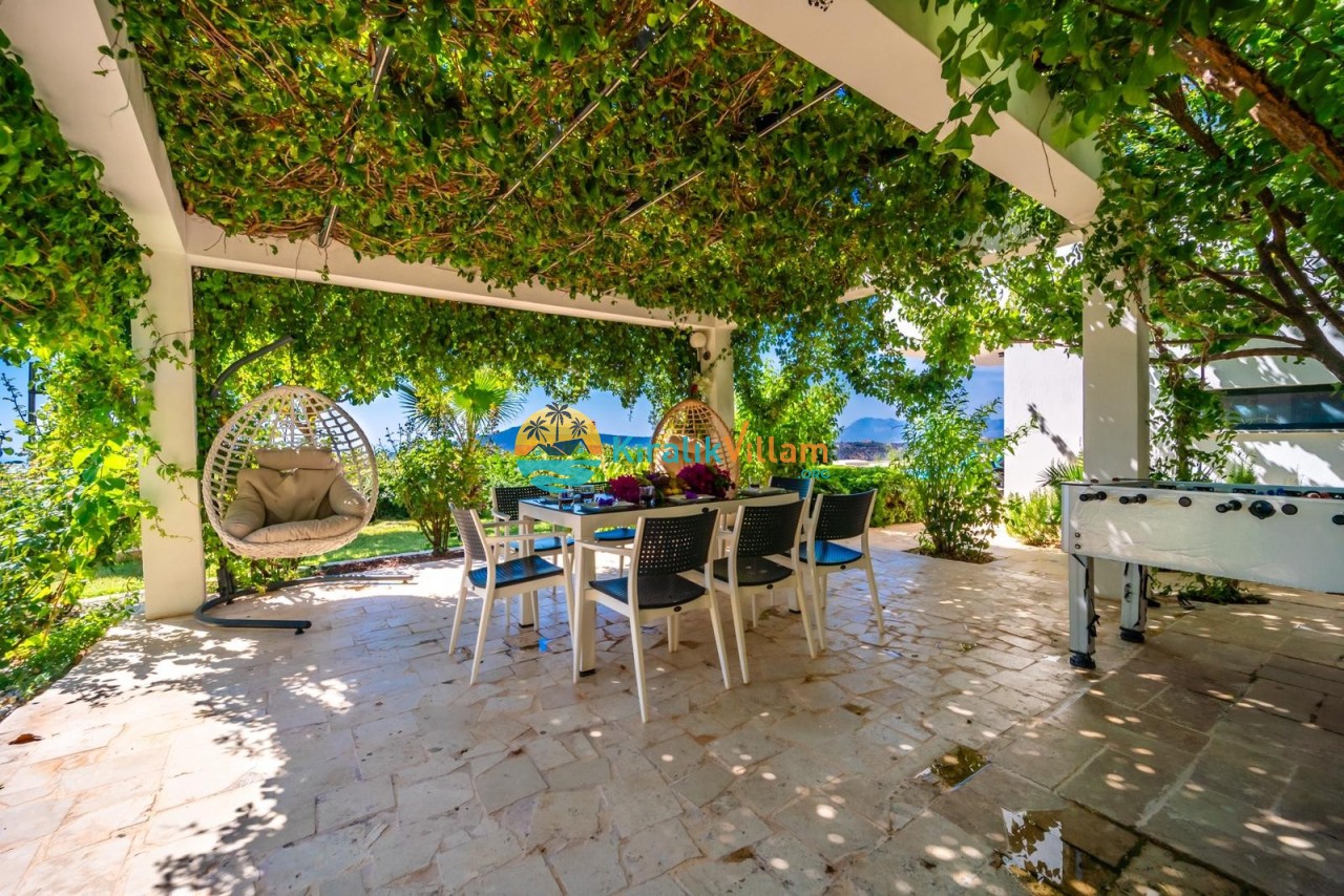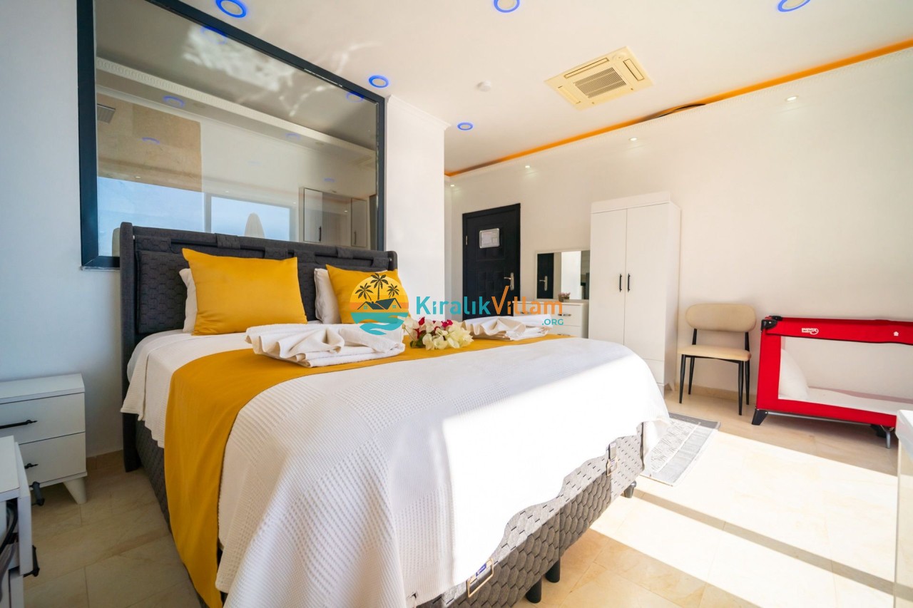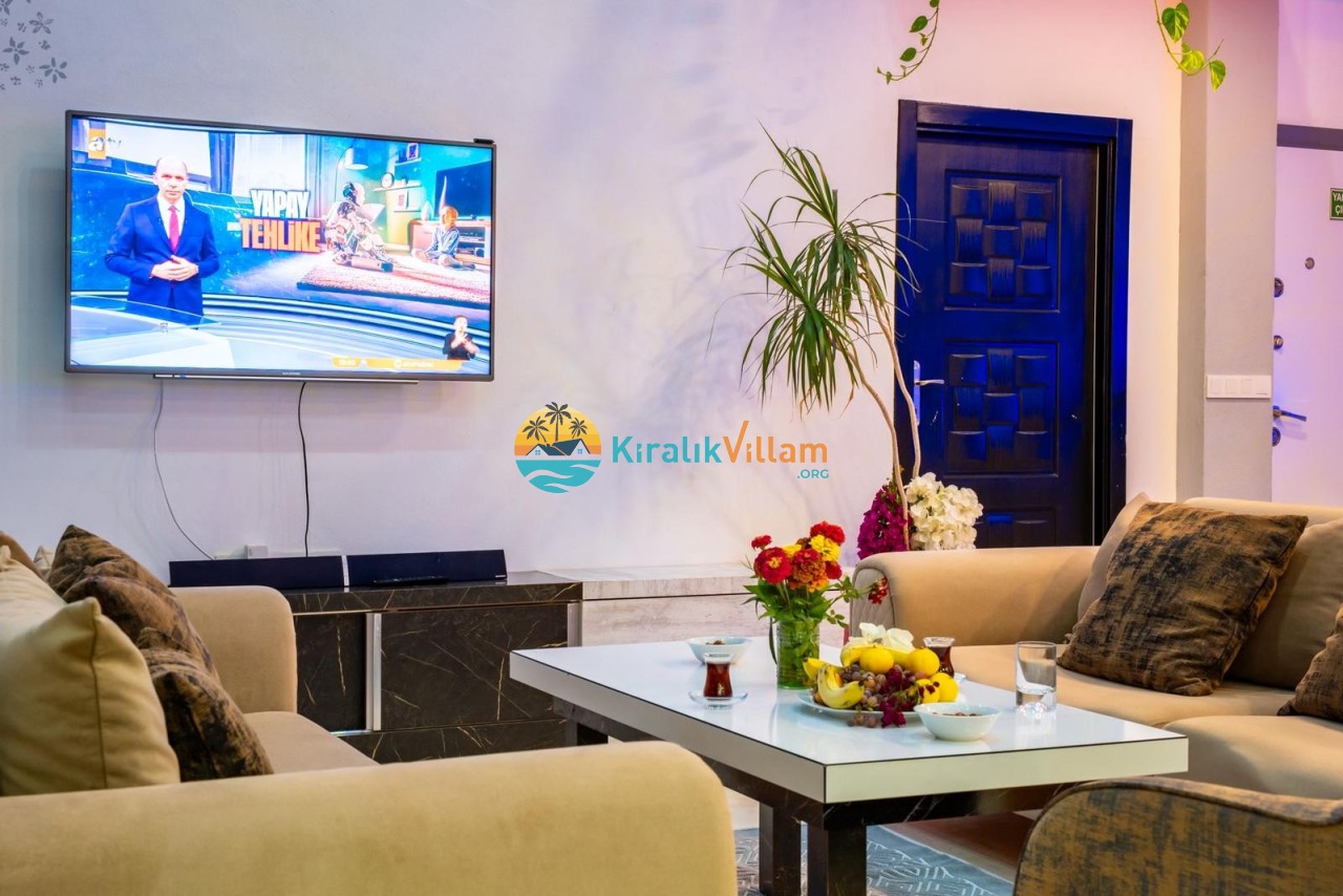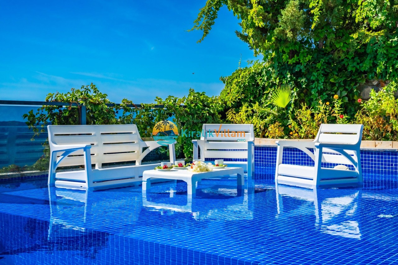 Muhteşem Deniz manzaralı salonunda oturma grubu, plazma televizyon, uydu alıcısı, klima, ütü ve ütü masası, sehpa ve havuz başına çıkış bulunmaktadır.