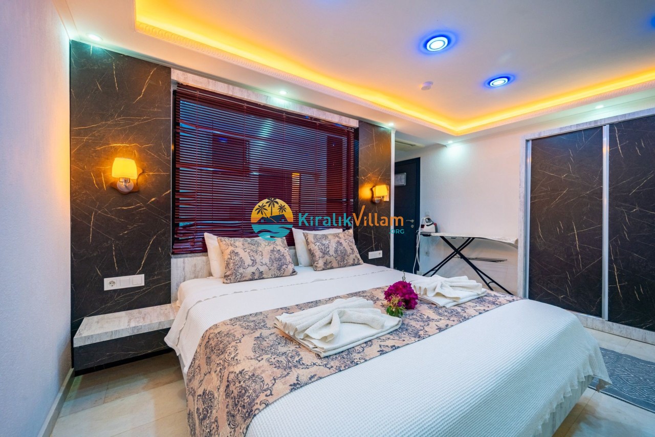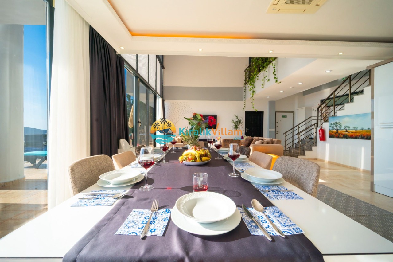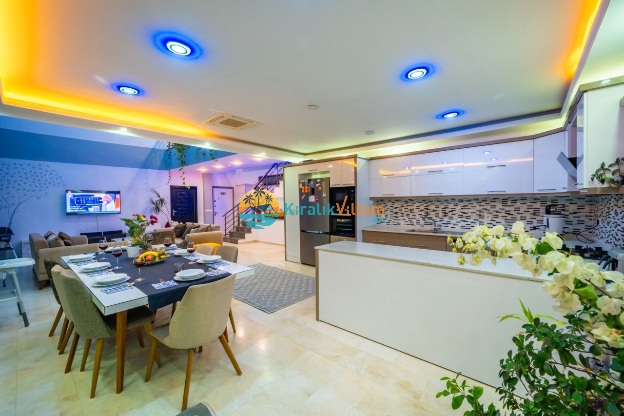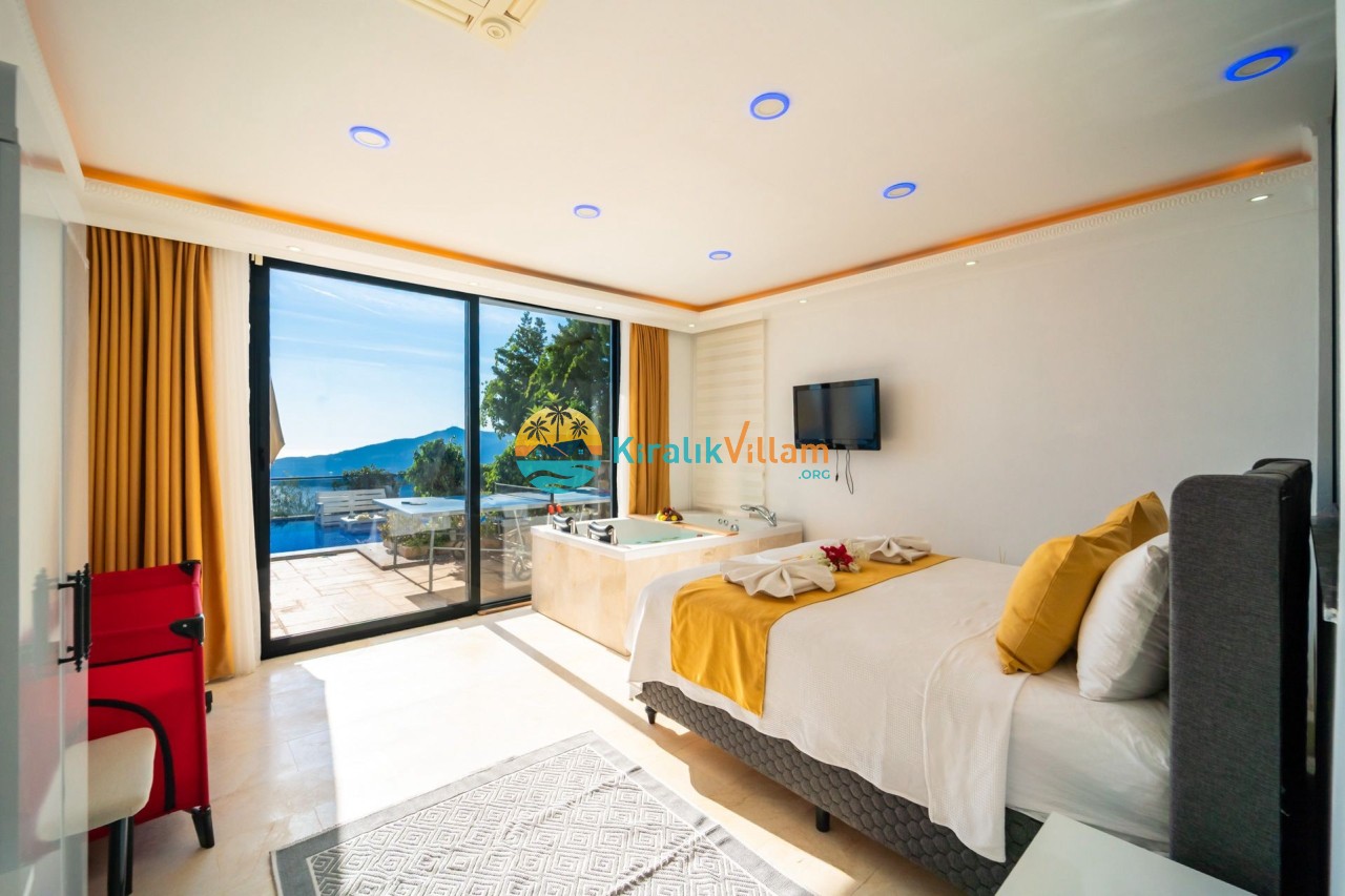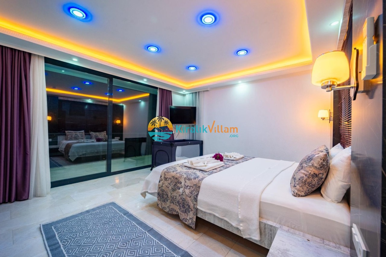 Muhteşem Deniz manzaralı salonunda oturma grubu, plazma televizyon, uydu alıcısı, klima, ütü ve ütü masası, sehpa ve havuz başına çıkış bulunmaktadır.