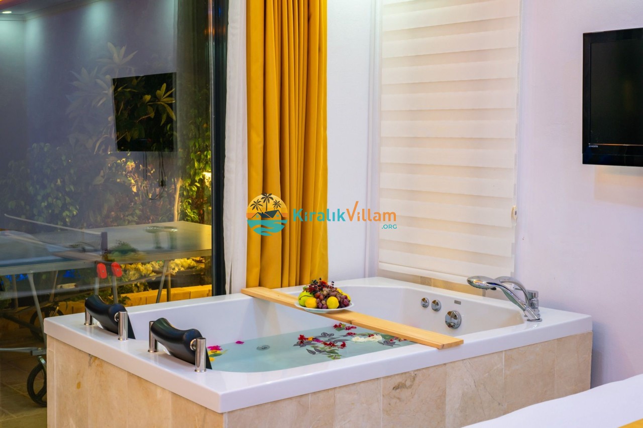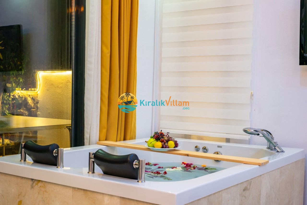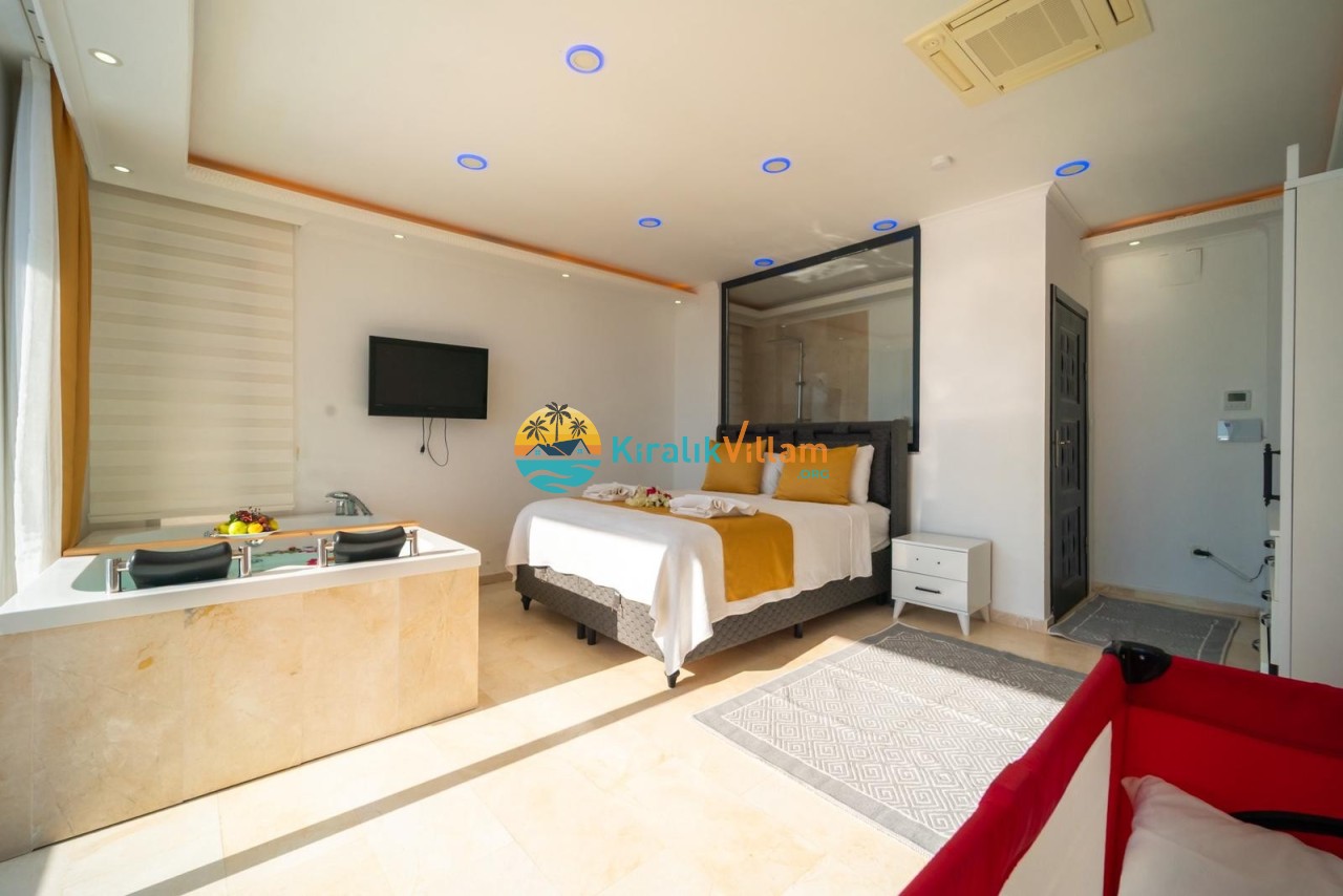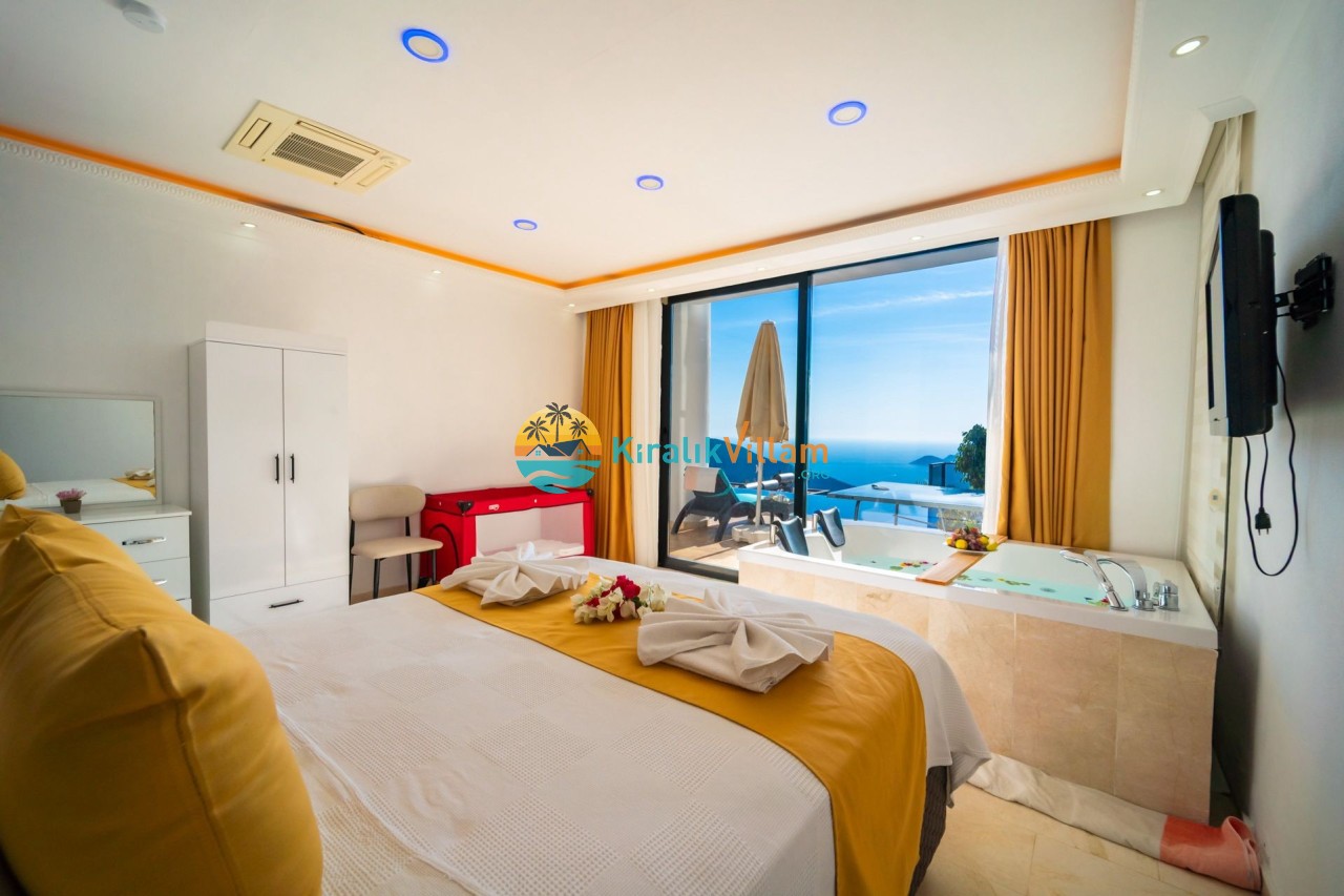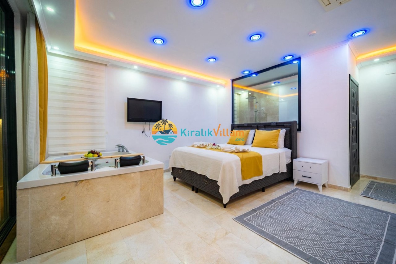 1 adet çift kişilik yatak, komodin, klima, elbise dolabı, jakuzi, tuvalet ve banyo bulunmaktadır.