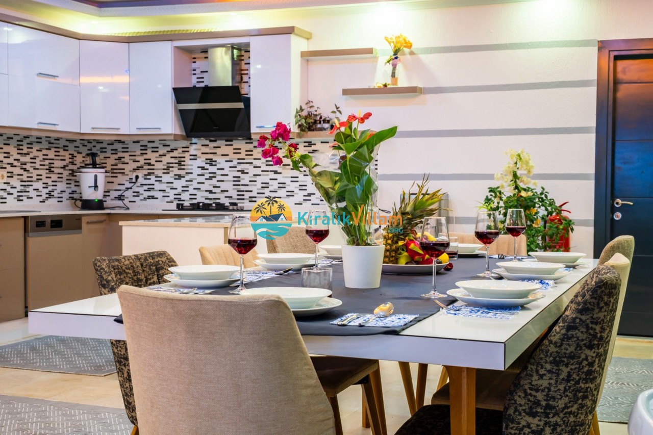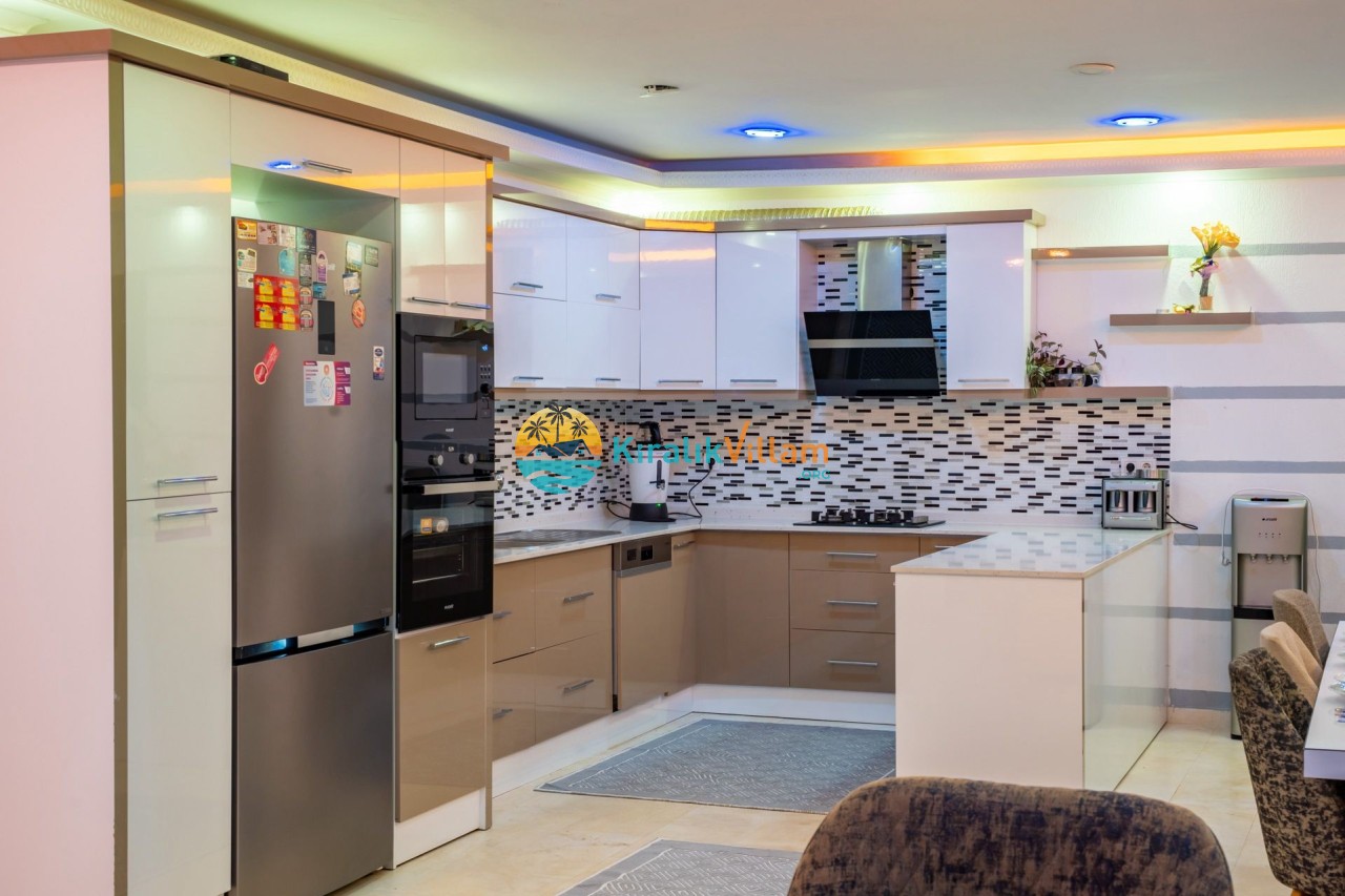 Buzdolabı, çamaşır makinesi, bulaşık makinesi, elektrikli su ısıtıcısı, mikrodalga fırın, ekmek kızartma makinesi, fırın, 4 lü ocak, yemek masası, yemek takımı ve mutfak araç gereçleri bulunmaktadır.