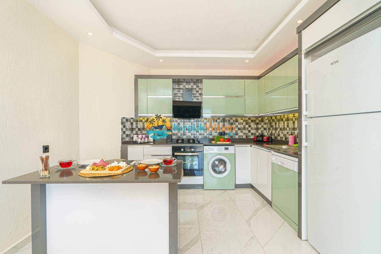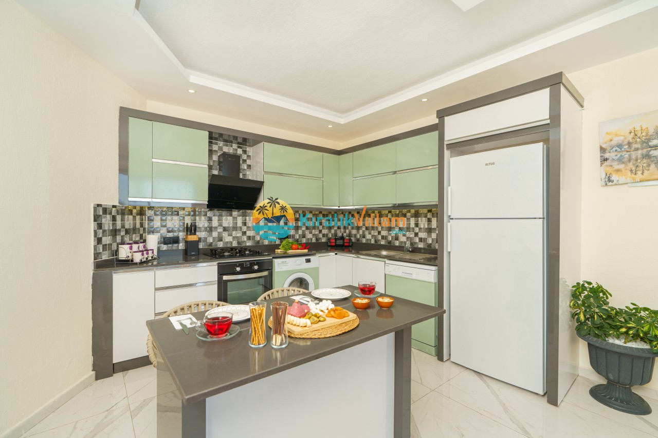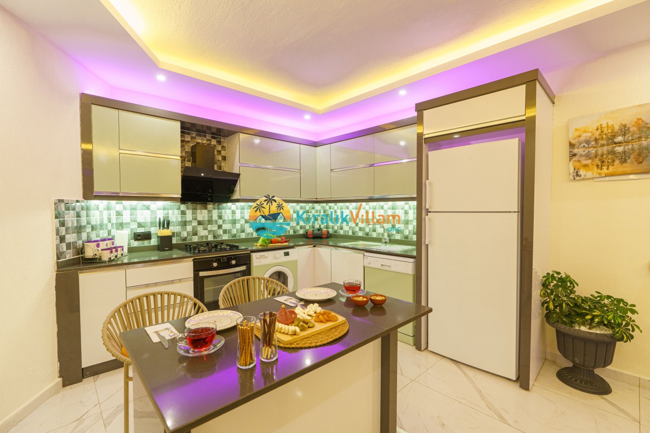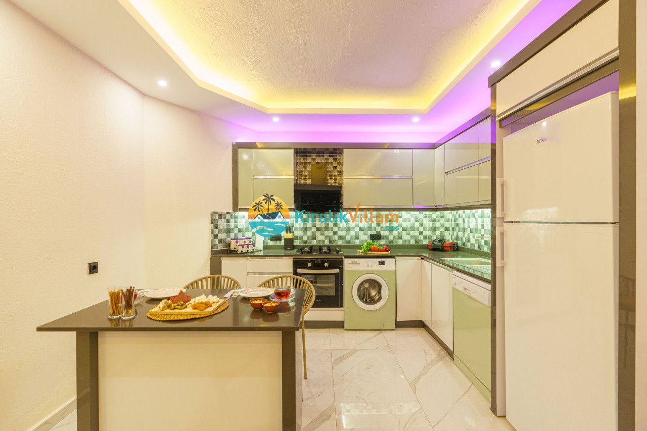 Mutfak : Amerikan mutfak içerisinde buzdolabı, bulaşık makinası, çamaşır makinası, yemek masası, fırın, 4’lü ocak, elektirikli su ısıtıcı, yemek takımı, tava ve tencereler, çatal, bıçak takımı bulunmaktadır.