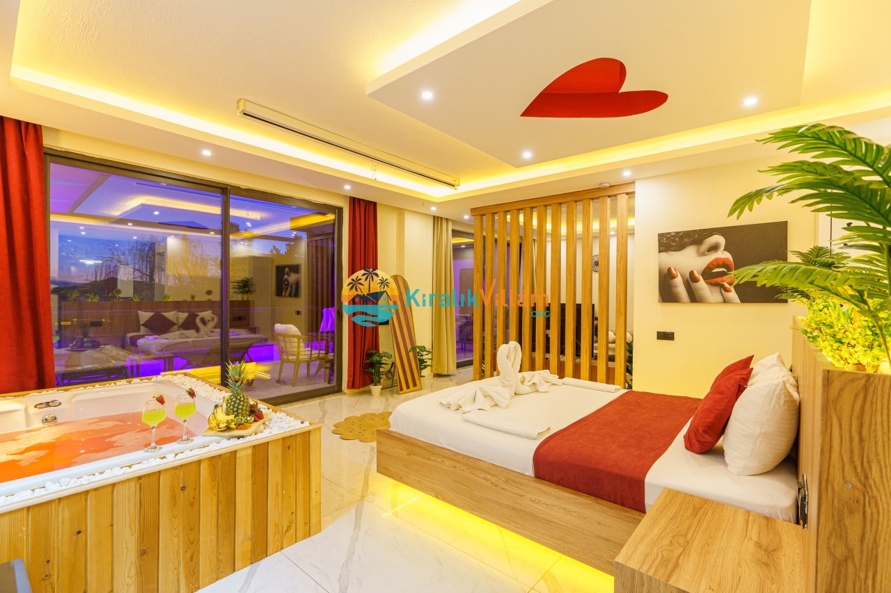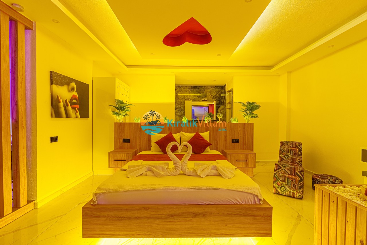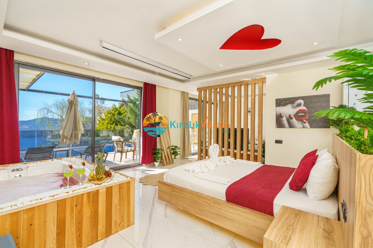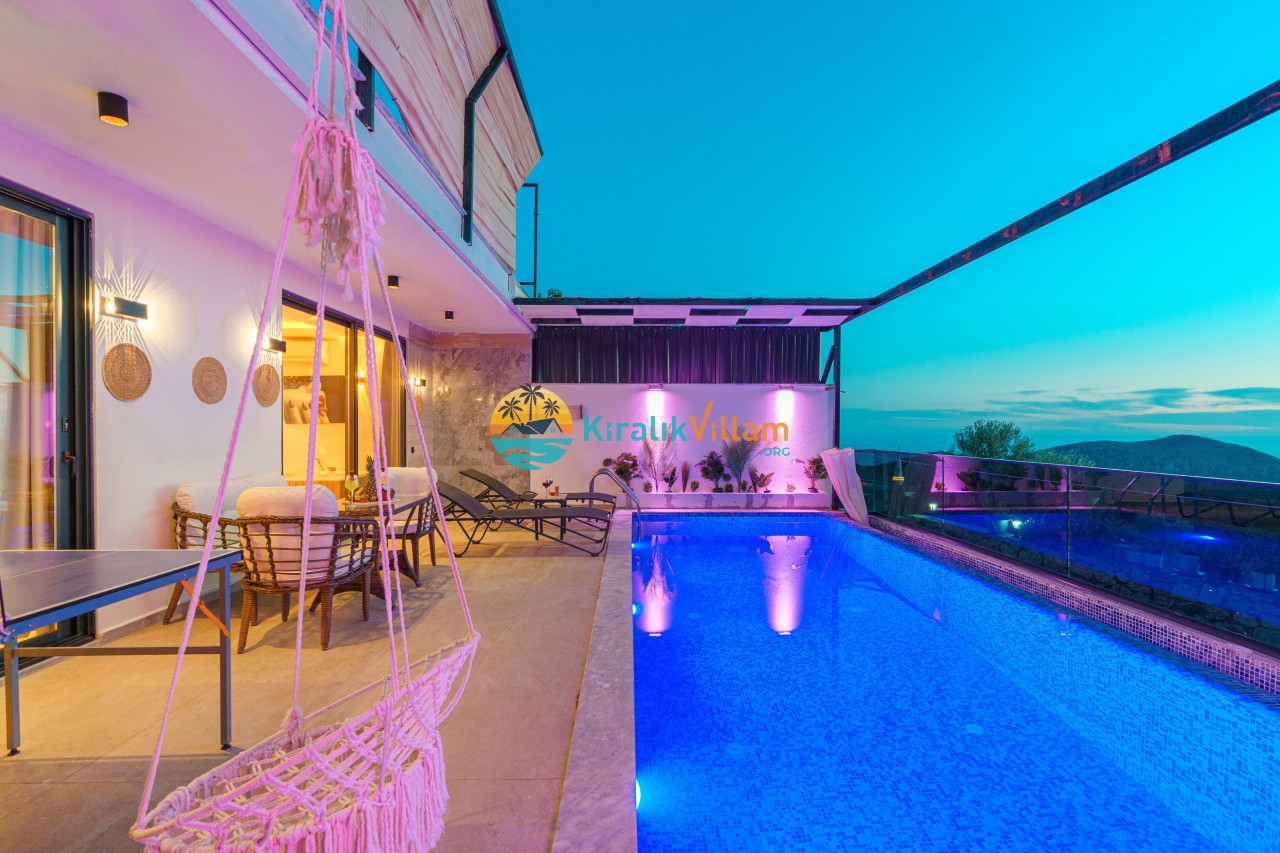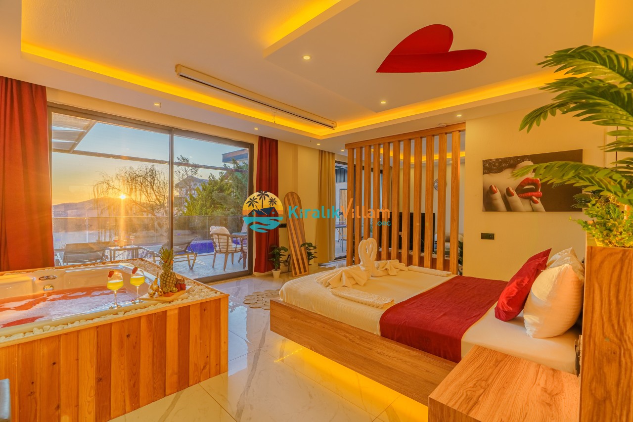 Antalya’nın Kaş ilçesinin Kalkan semtinde, Kördere mevkiinde yer alan benzersiz bir villa var karşımızda. Dik yokuşlardan çıkıp Villaya geldiğinizde gördüğünüz her şey sizi mest edecek. Bu bir balayı villası. Her şey yeni evlenenler için düşünülmüş. Sadece iki kişilik ve 1 yatak bir de banyo bulunuyor. Son derece korunaklı bir havuzu var. Kimseler sizi görmeden sevdiğiniz insanla gündüz gece fark etmeksizin yüzebilirsiniz. Bunun yanı sıra villa da bir de çok özel jakuzi var. Havuzda yüzerken yer gök mavi zira deniz manzarasına karşı yüzüyorsunuz. Villanın hemen yanı başında salıncak için de ne denir ki. İç dekorasyon ise tek kelime muhteşem. İnsan bu villaya gelince bir daha asla çıkmak istemeyebilir.