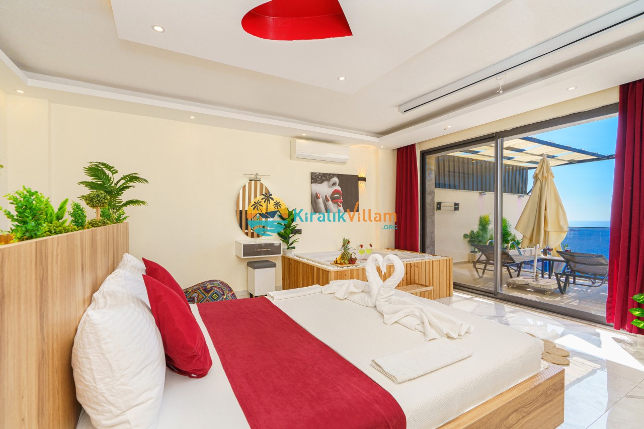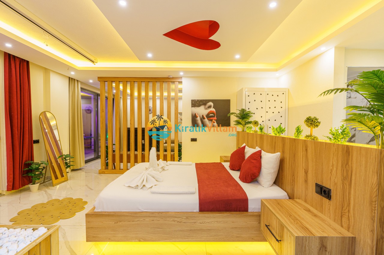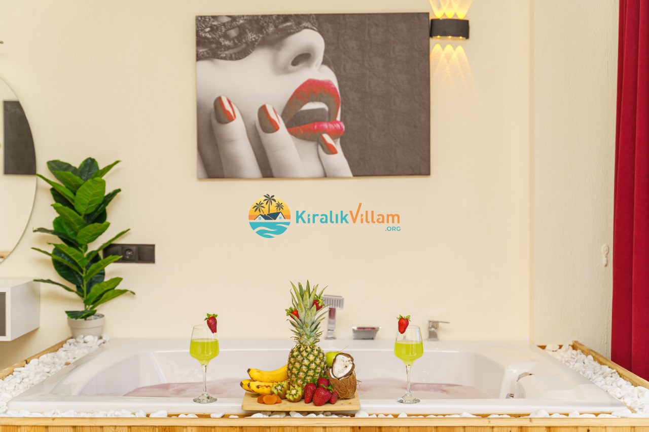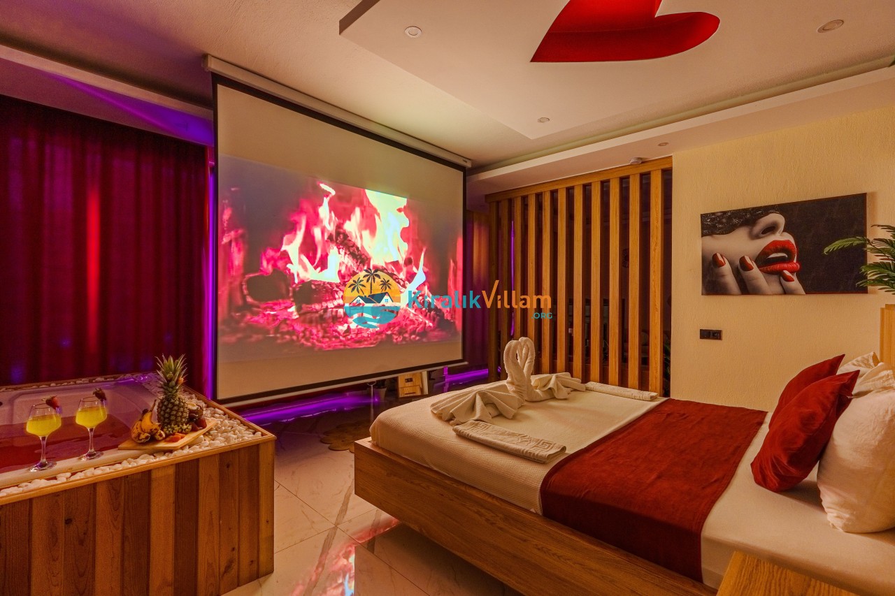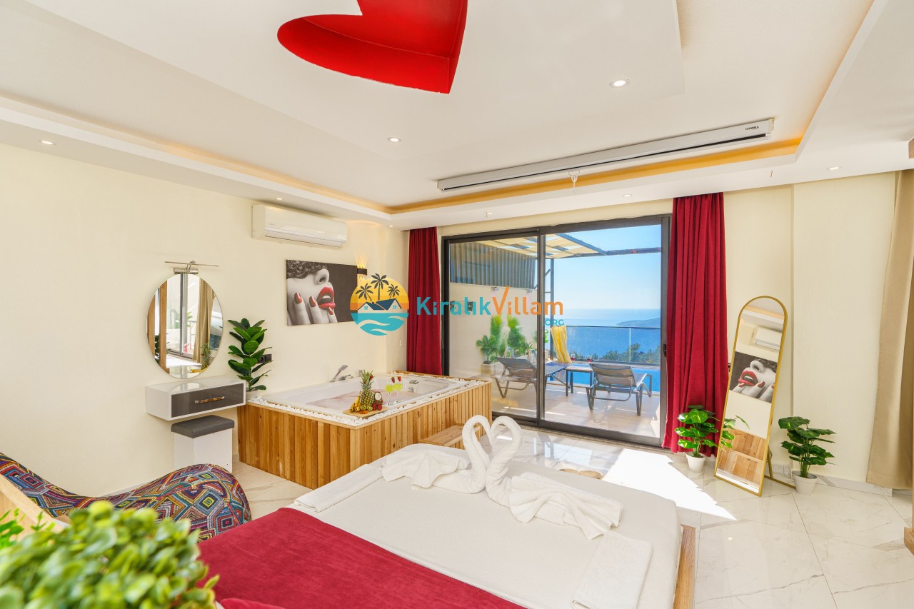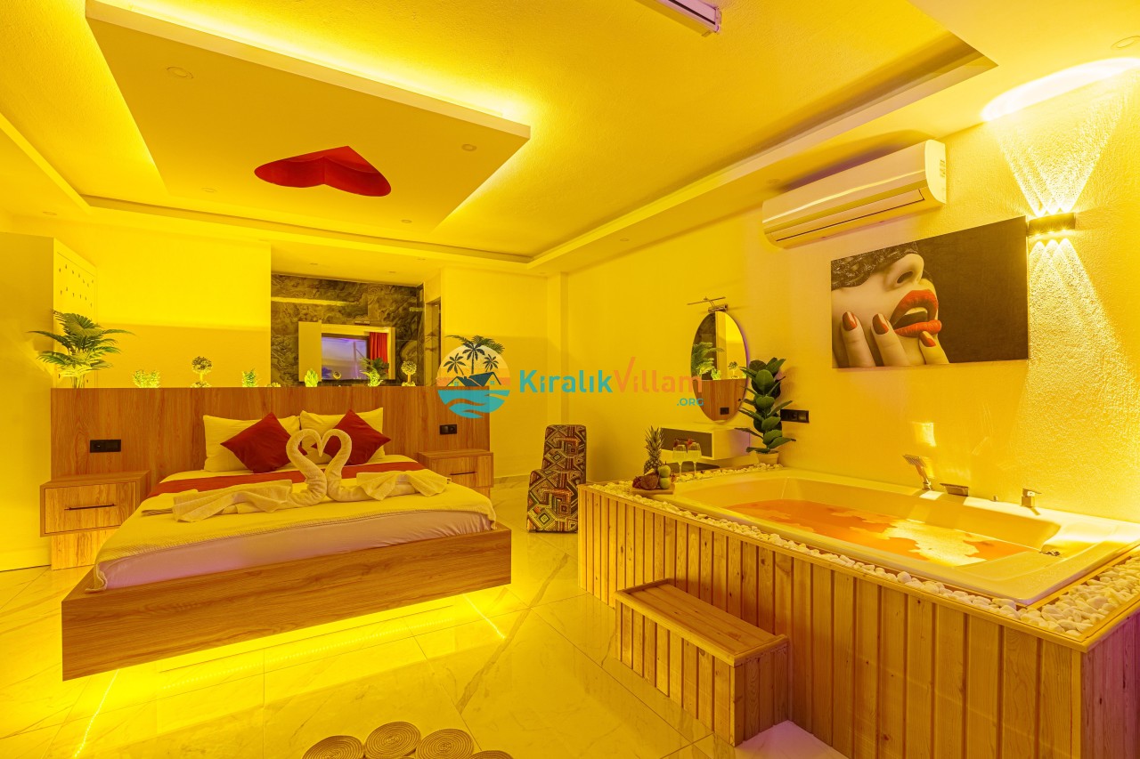 Antalya’nın Kaş ilçesinin Kalkan semtinde, Kördere mevkiinde yer alan benzersiz bir villa var karşımızda. Dik yokuşlardan çıkıp Villaya geldiğinizde gördüğünüz her şey sizi mest edecek. Bu bir balayı villası. Her şey yeni evlenenler için düşünülmüş. Sadece iki kişilik ve 1 yatak bir de banyo bulunuyor. Son derece korunaklı bir havuzu var. Kimseler sizi görmeden sevdiğiniz insanla gündüz gece fark etmeksizin yüzebilirsiniz. Bunun yanı sıra villa da bir de çok özel jakuzi var. Havuzda yüzerken yer gök mavi zira deniz manzarasına karşı yüzüyorsunuz. Villanın hemen yanı başında salıncak için de ne denir ki. İç dekorasyon ise tek kelime muhteşem. İnsan bu villaya gelince bir daha asla çıkmak istemeyebilir.