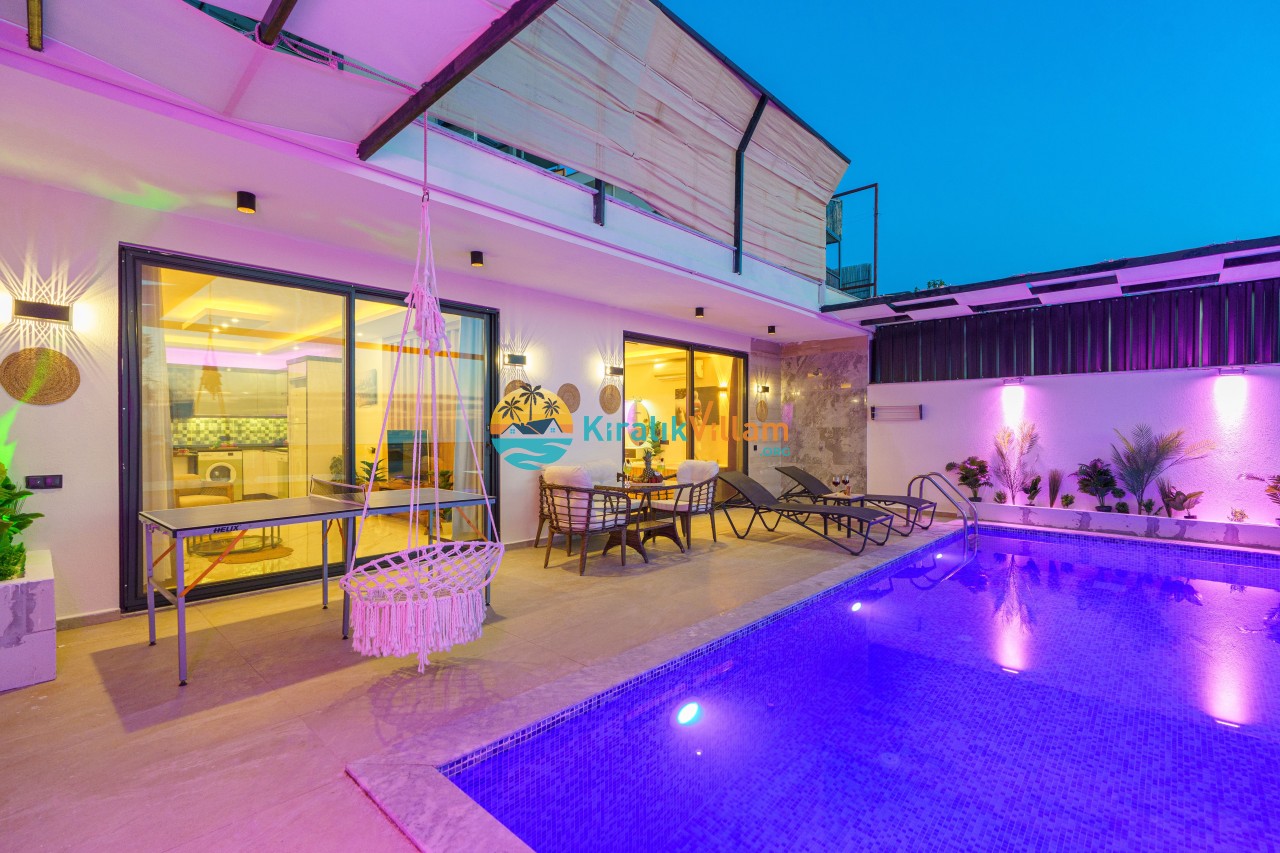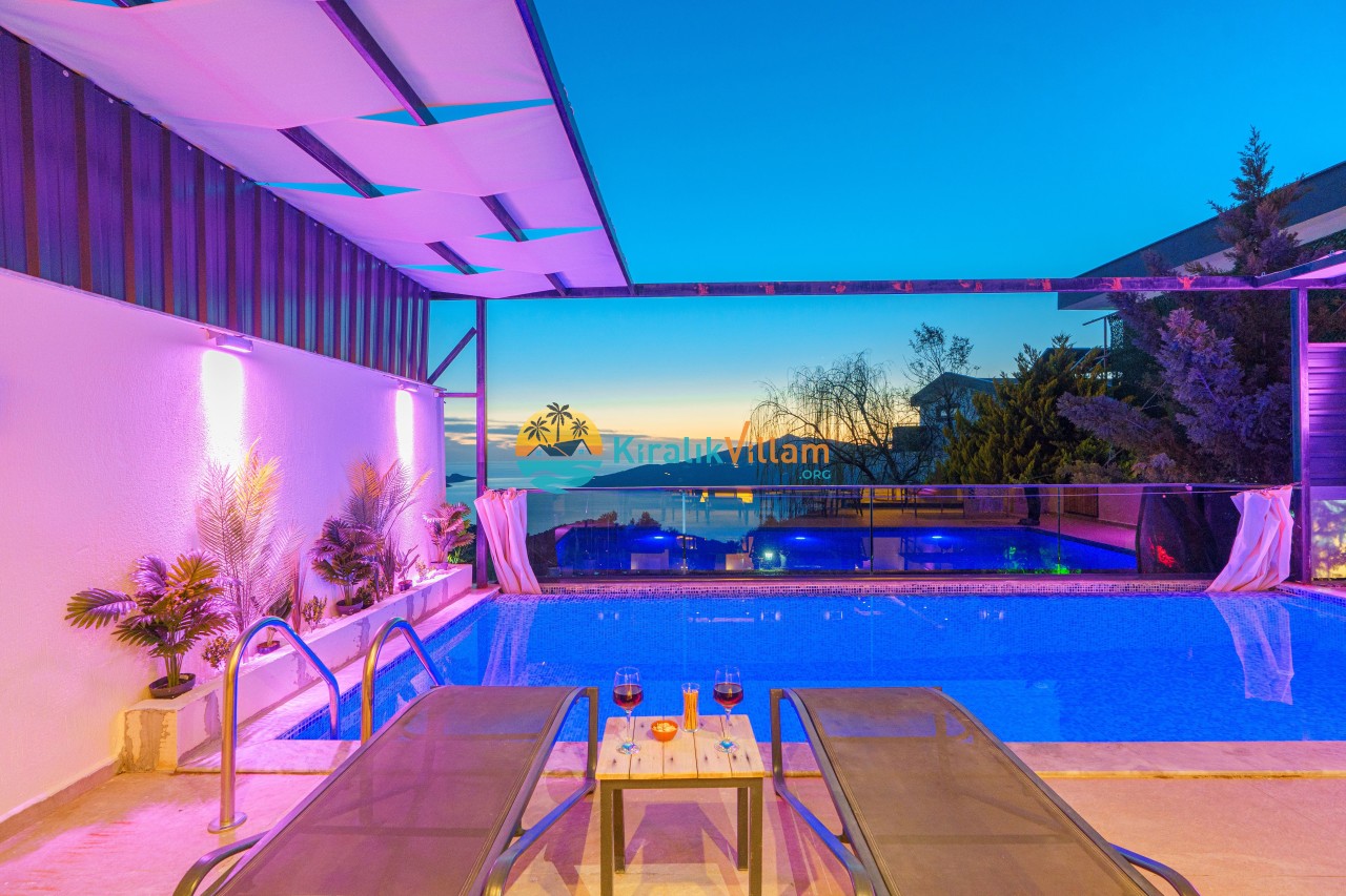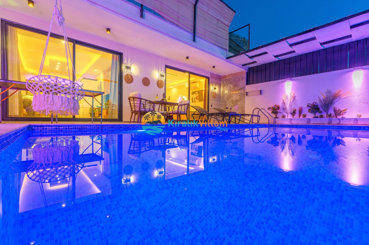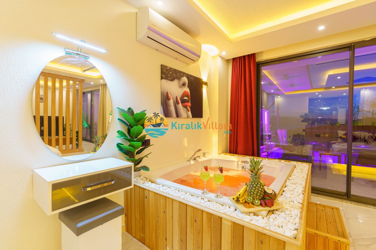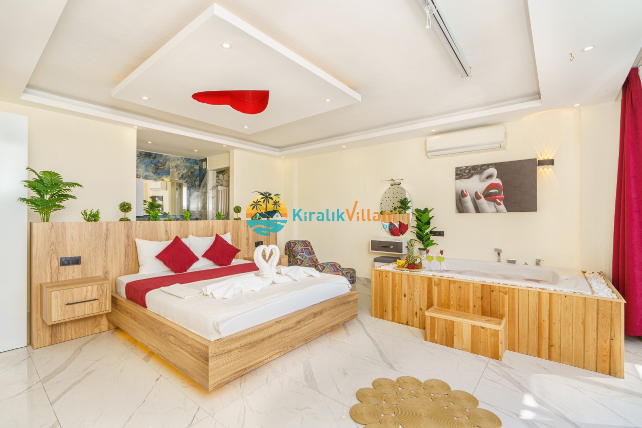 Antalya’nın Kaş ilçesinin Kalkan semtinde, Kördere mevkiinde yer alan benzersiz bir villa var karşımızda. Dik yokuşlardan çıkıp Villaya geldiğinizde gördüğünüz her şey sizi mest edecek. Bu bir balayı villası. Her şey yeni evlenenler için düşünülmüş. Sadece iki kişilik ve 1 yatak bir de banyo bulunuyor. Son derece korunaklı bir havuzu var. Kimseler sizi görmeden sevdiğiniz insanla gündüz gece fark etmeksizin yüzebilirsiniz. Bunun yanı sıra villa da bir de çok özel jakuzi var. Havuzda yüzerken yer gök mavi zira deniz manzarasına karşı yüzüyorsunuz. Villanın hemen yanı başında salıncak için de ne denir ki. İç dekorasyon ise tek kelime muhteşem. İnsan bu villaya gelince bir daha asla çıkmak istemeyebilir.