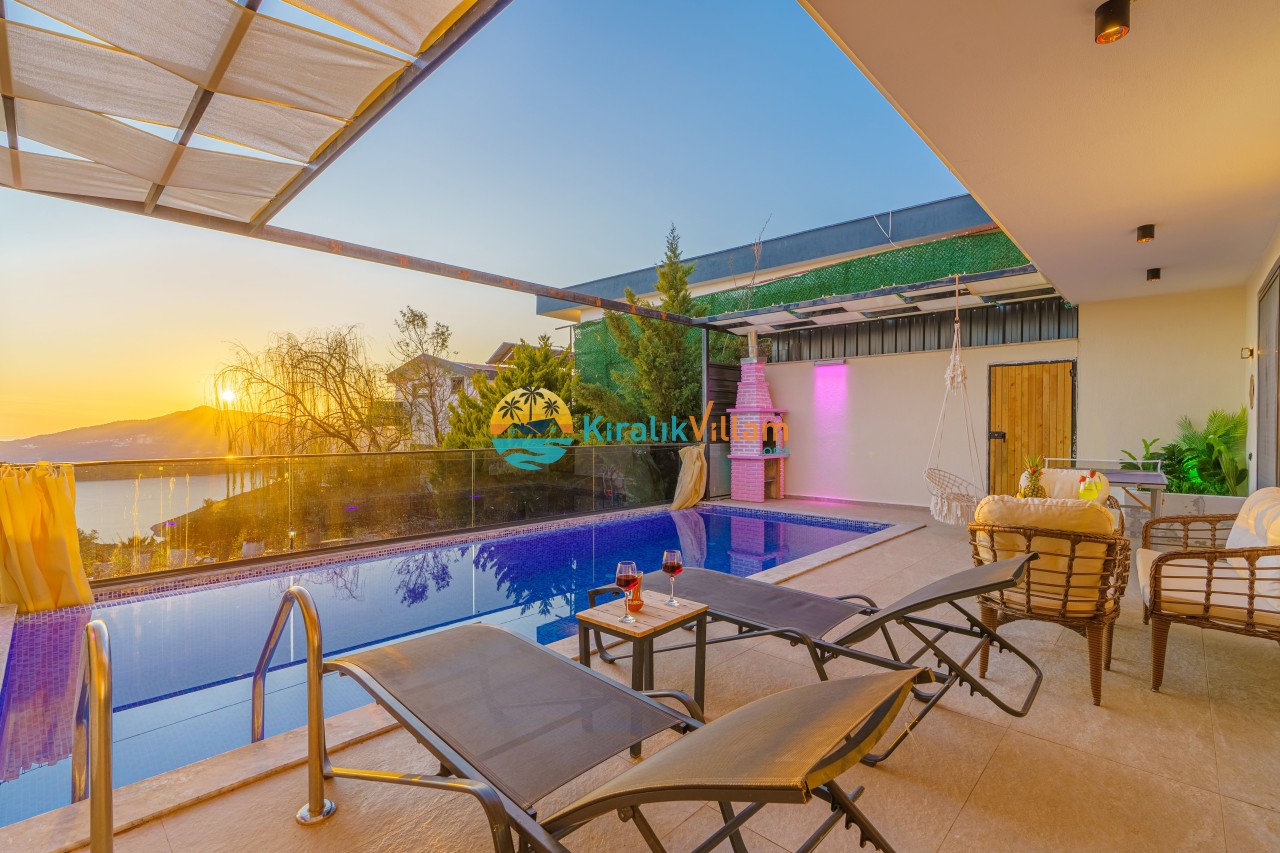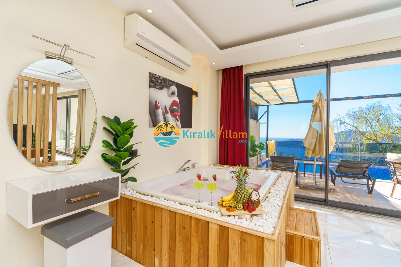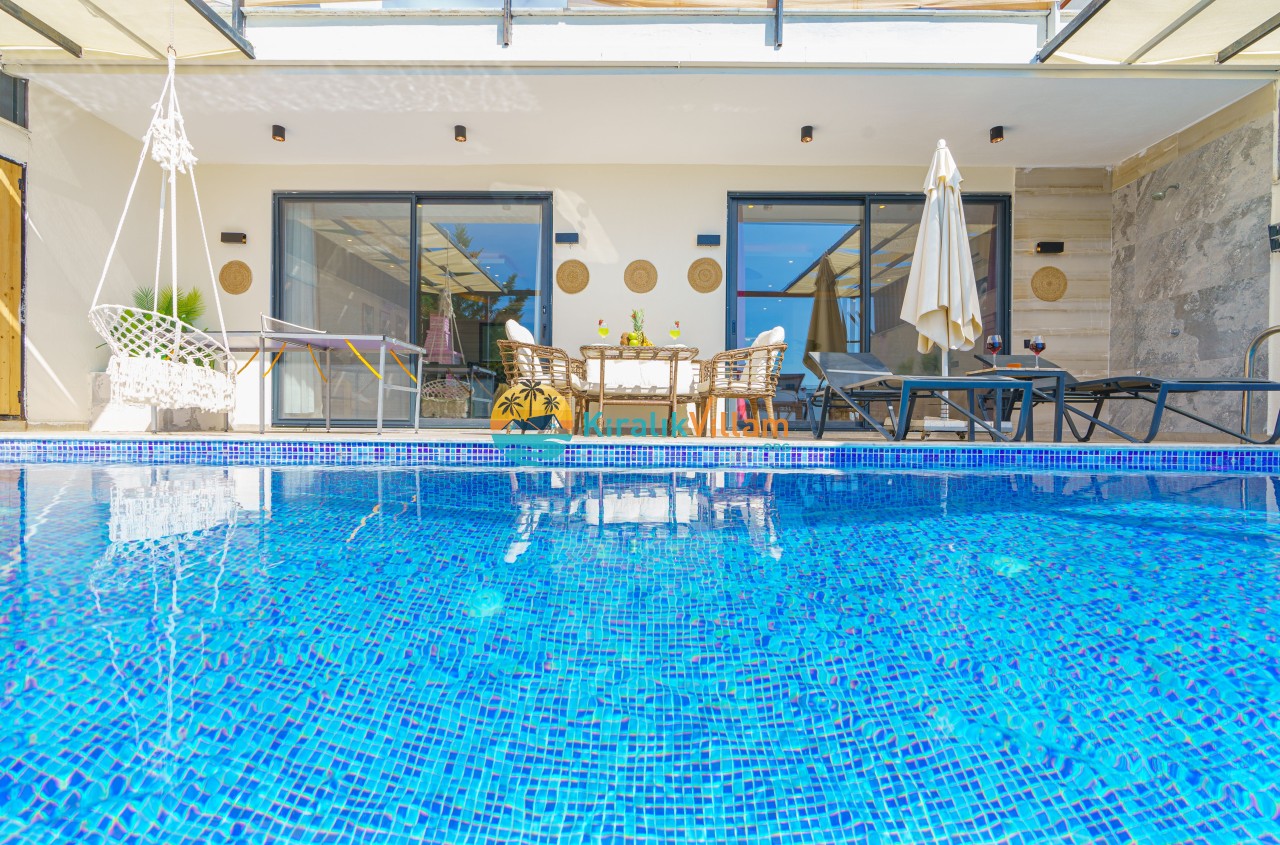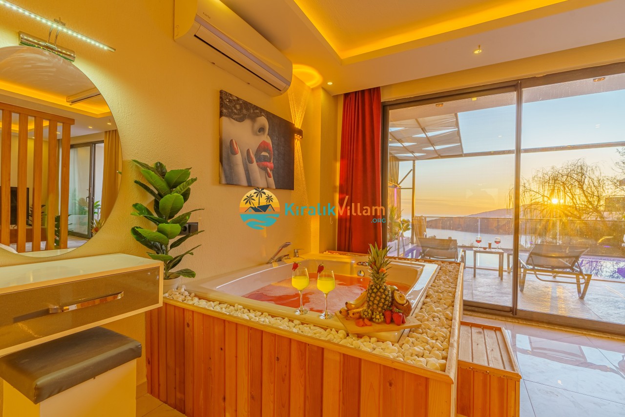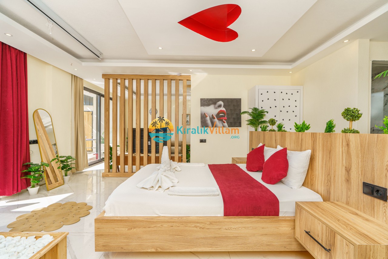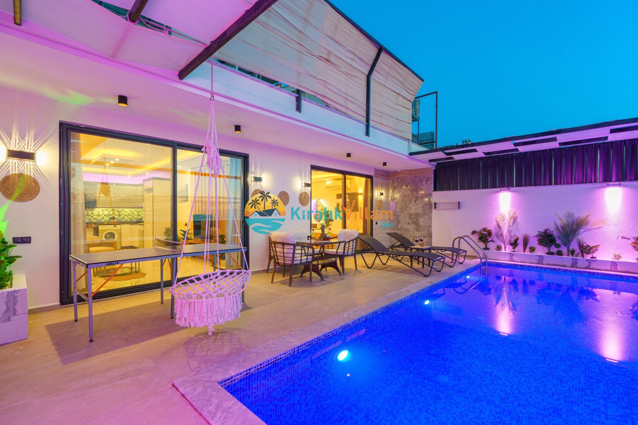 Antalya’nın Kaş ilçesinin Kalkan semtinde, Kördere mevkiinde yer alan benzersiz bir villa var karşımızda. Dik yokuşlardan çıkıp Villaya geldiğinizde gördüğünüz her şey sizi mest edecek. Bu bir balayı villası. Her şey yeni evlenenler için düşünülmüş. Sadece iki kişilik ve 1 yatak bir de banyo bulunuyor. Son derece korunaklı bir havuzu var. Kimseler sizi görmeden sevdiğiniz insanla gündüz gece fark etmeksizin yüzebilirsiniz. Bunun yanı sıra villa da bir de çok özel jakuzi var. Havuzda yüzerken yer gök mavi zira deniz manzarasına karşı yüzüyorsunuz. Villanın hemen yanı başında salıncak için de ne denir ki. İç dekorasyon ise tek kelime muhteşem. İnsan bu villaya gelince bir daha asla çıkmak istemeyebilir.