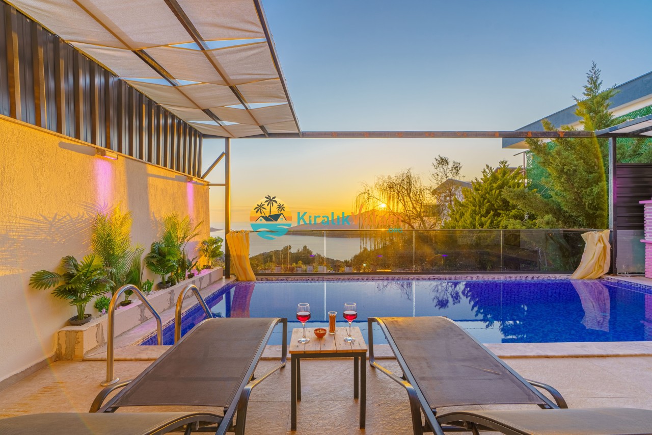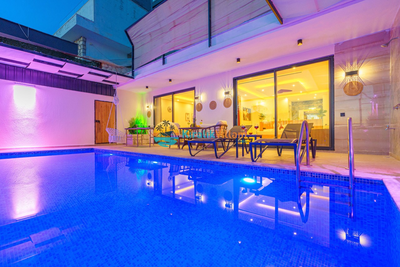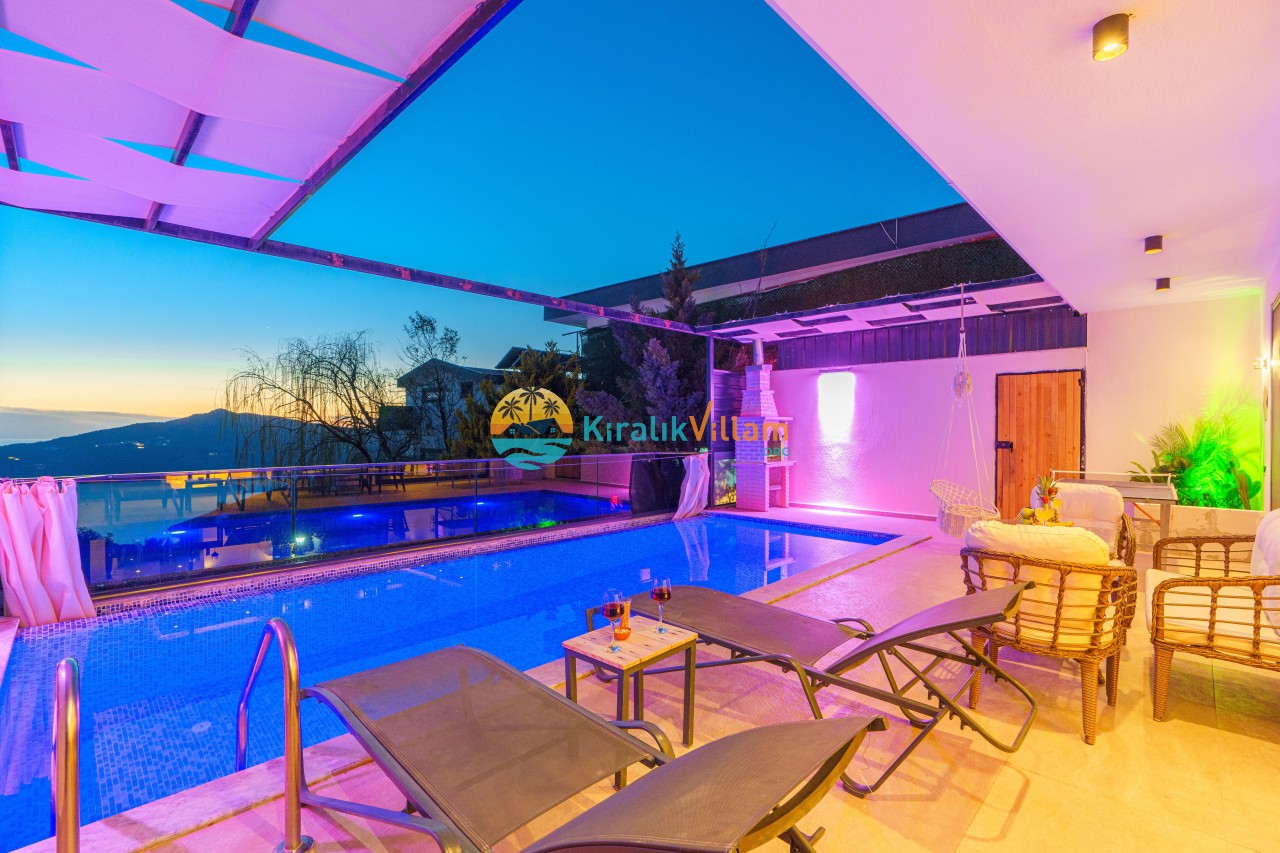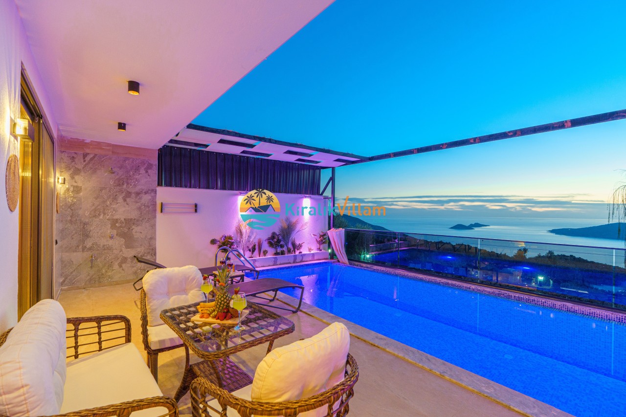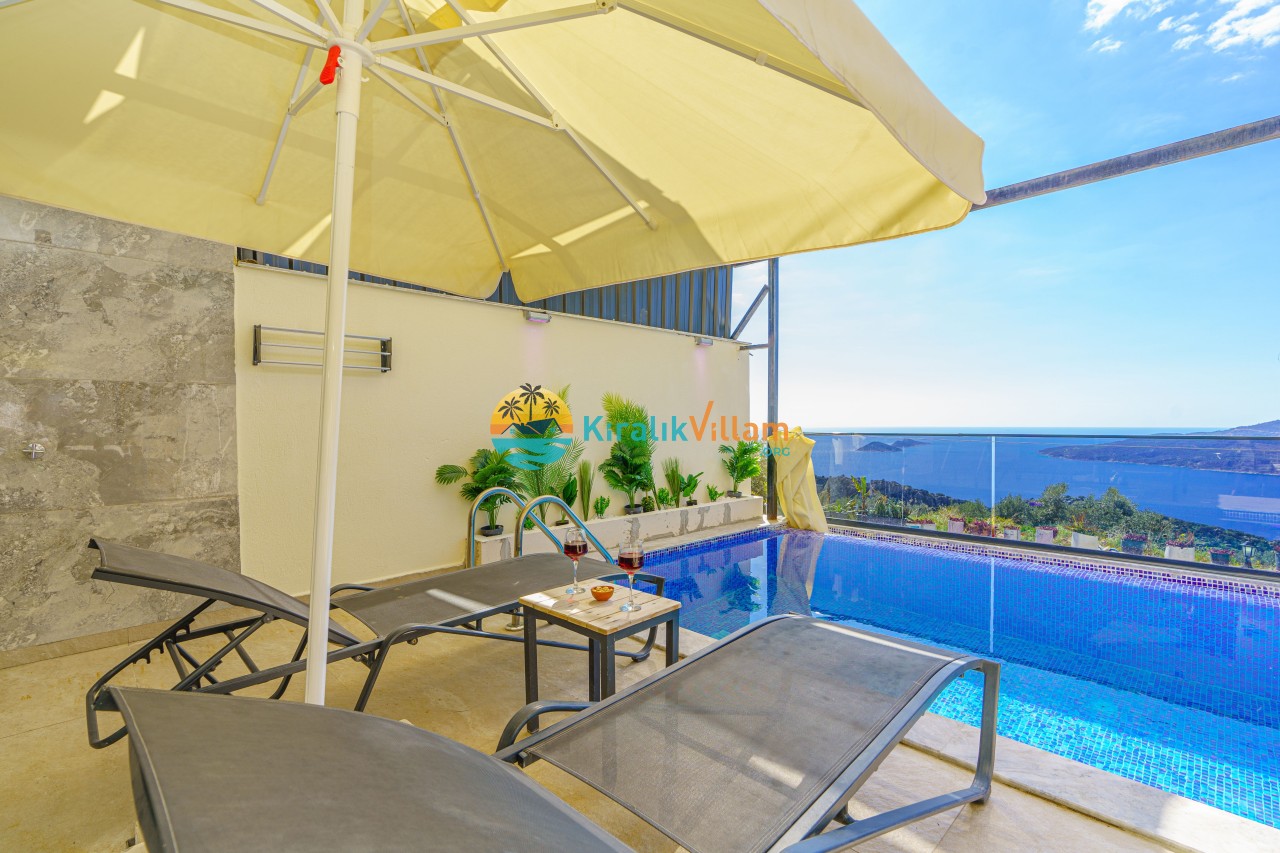 Antalya’nın Kaş ilçesinin Kalkan semtinde, Kördere mevkiinde yer alan benzersiz bir villa var karşımızda. Dik yokuşlardan çıkıp Villaya geldiğinizde gördüğünüz her şey sizi mest edecek. Bu bir balayı villası. Her şey yeni evlenenler için düşünülmüş. Sadece iki kişilik ve 1 yatak bir de banyo bulunuyor. Son derece korunaklı bir havuzu var. Kimseler sizi görmeden sevdiğiniz insanla gündüz gece fark etmeksizin yüzebilirsiniz. Bunun yanı sıra villa da bir de çok özel jakuzi var. Havuzda yüzerken yer gök mavi zira deniz manzarasına karşı yüzüyorsunuz. Villanın hemen yanı başında salıncak için de ne denir ki. İç dekorasyon ise tek kelime muhteşem. İnsan bu villaya gelince bir daha asla çıkmak istemeyebilir.