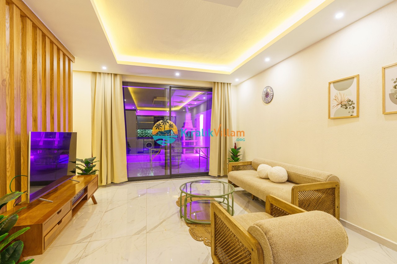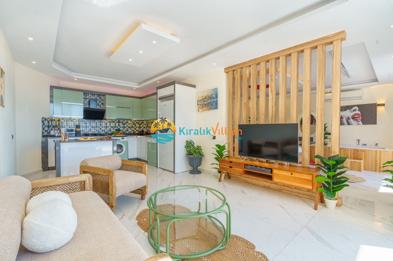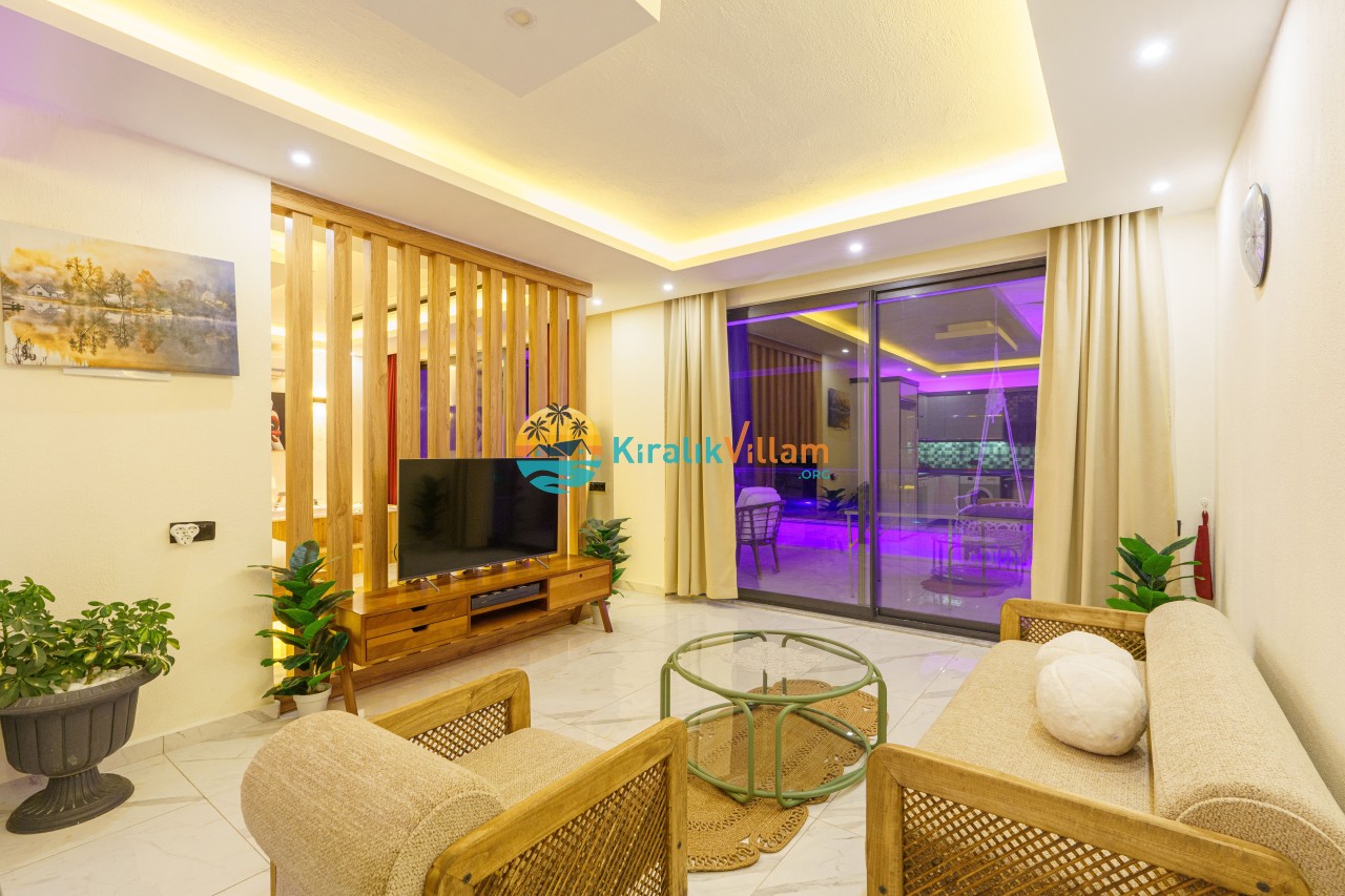 Salon : Salon içerisinde modern oturma grubu, uydu alıcı, LCD TV, internet için modem, klima ve havuz terasına çıkış bulunmaktadır.