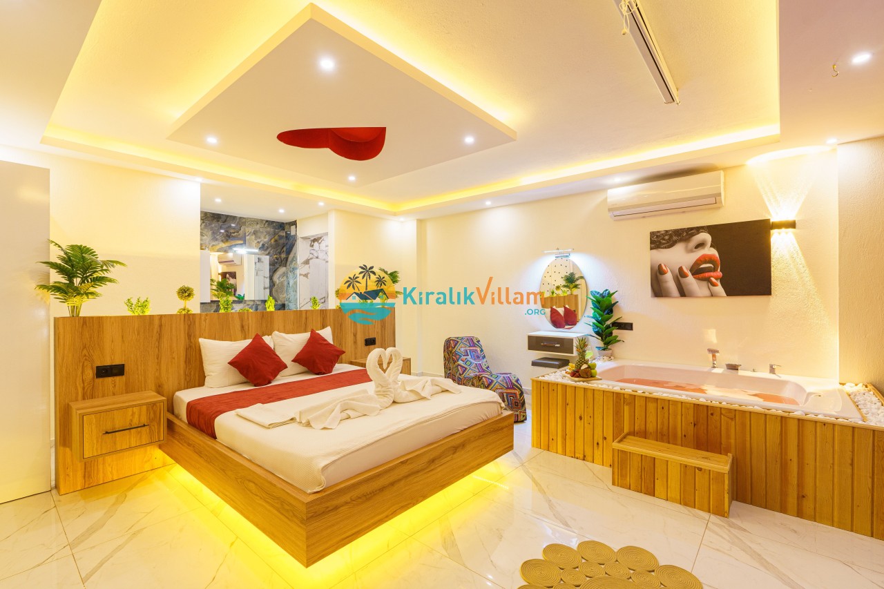 1. Yatak Odası: 1 adet çift kişilik yatak, komidin, makyaj masası, elbise dolabı, klima, jakuzi ve banyo/tuvalet bulunmaktadır.