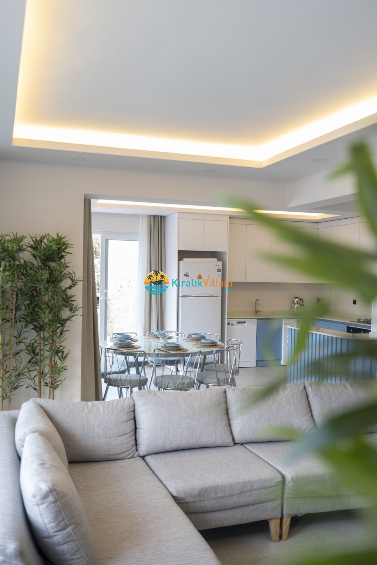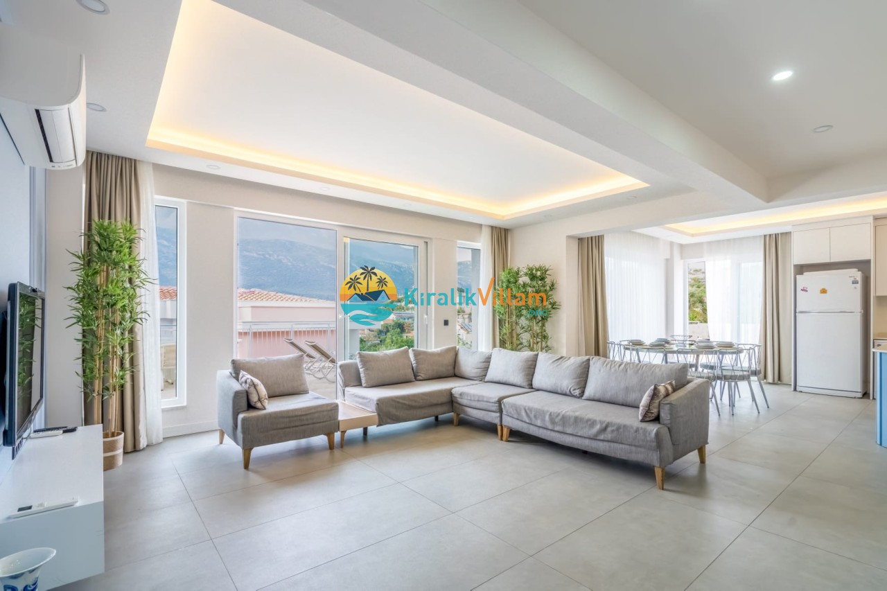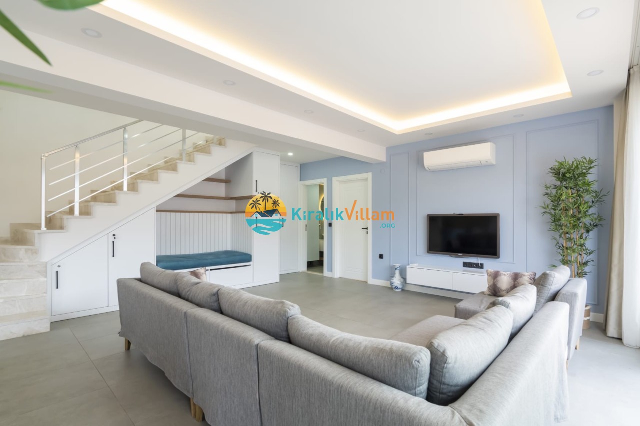 Deniz manzaralı salon içerisinde, koltuk takımı, orta sehpa, TV, TV ünitesi, klima, uydu alıcısı yer almaktadır.
