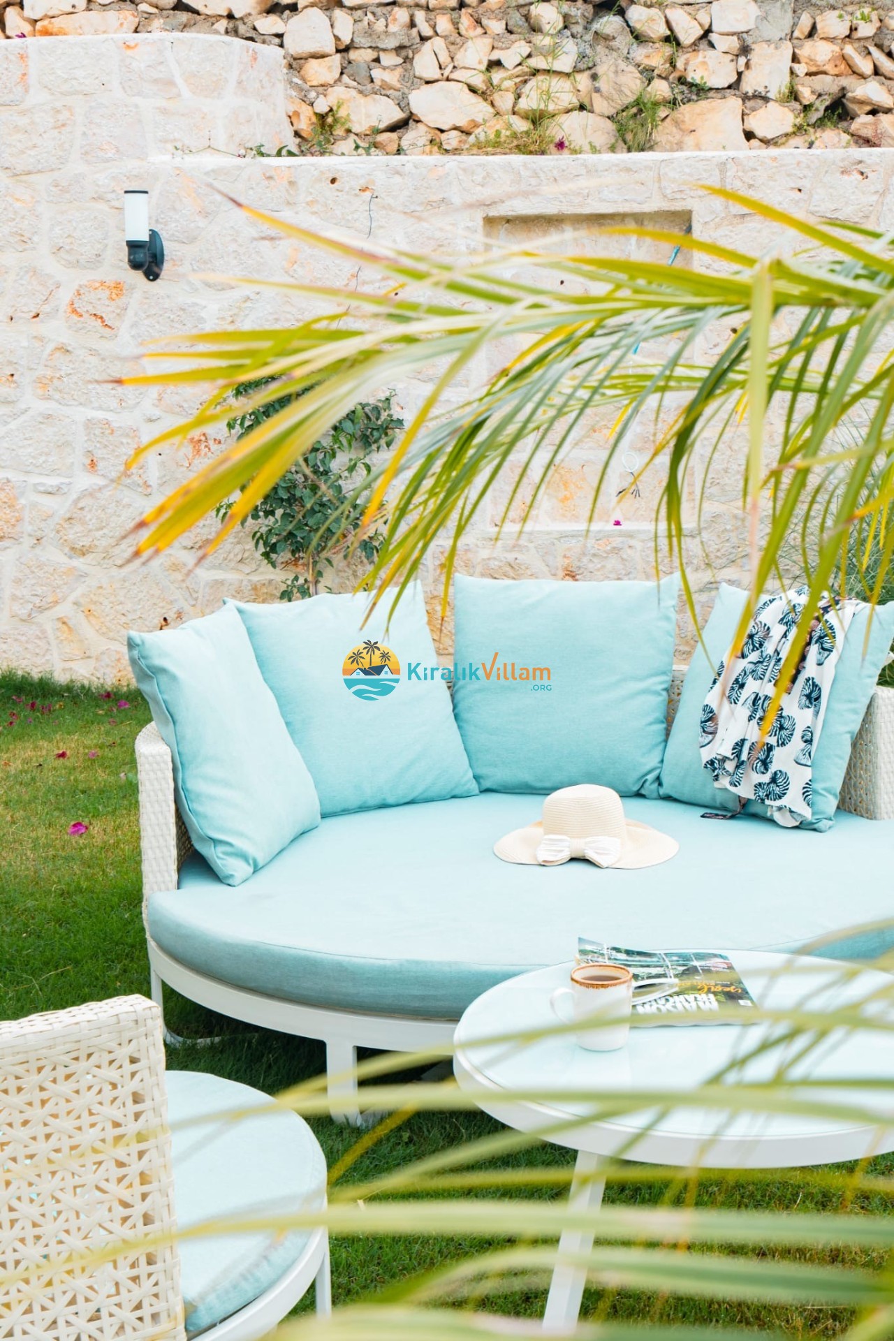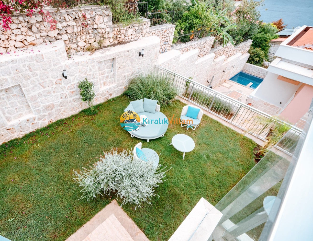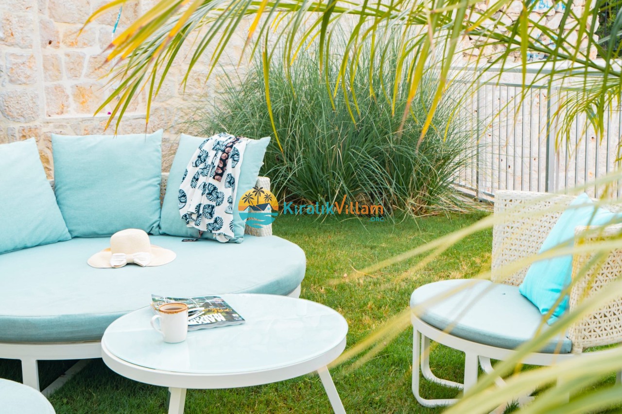 Deniz manzaralı bahçe içerisinde, özel yüzme havuzu, şezlonglar, güneş şemsiyesi, bahçe oturma grubu, bahçe yemek masası ve barbekü yer almaktadır.