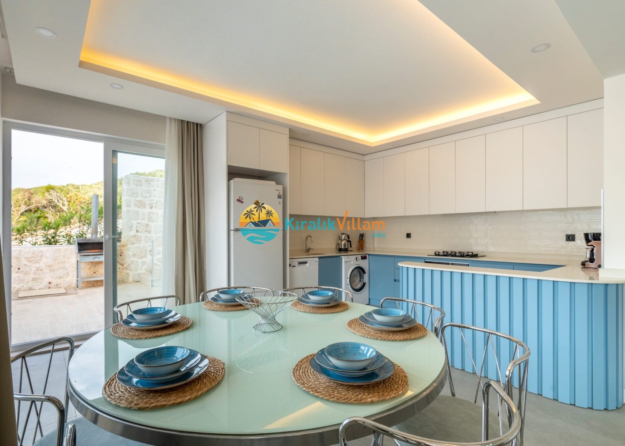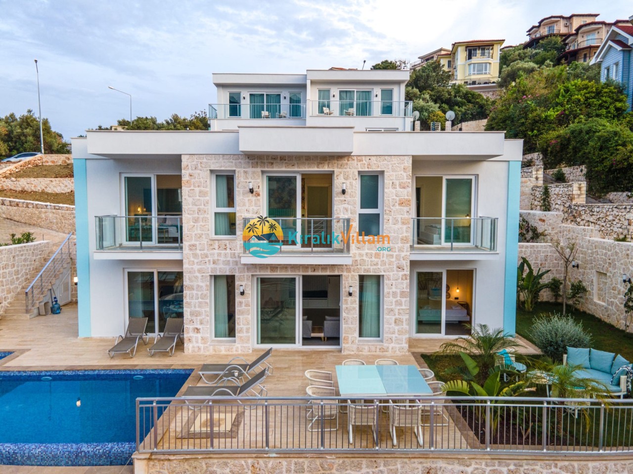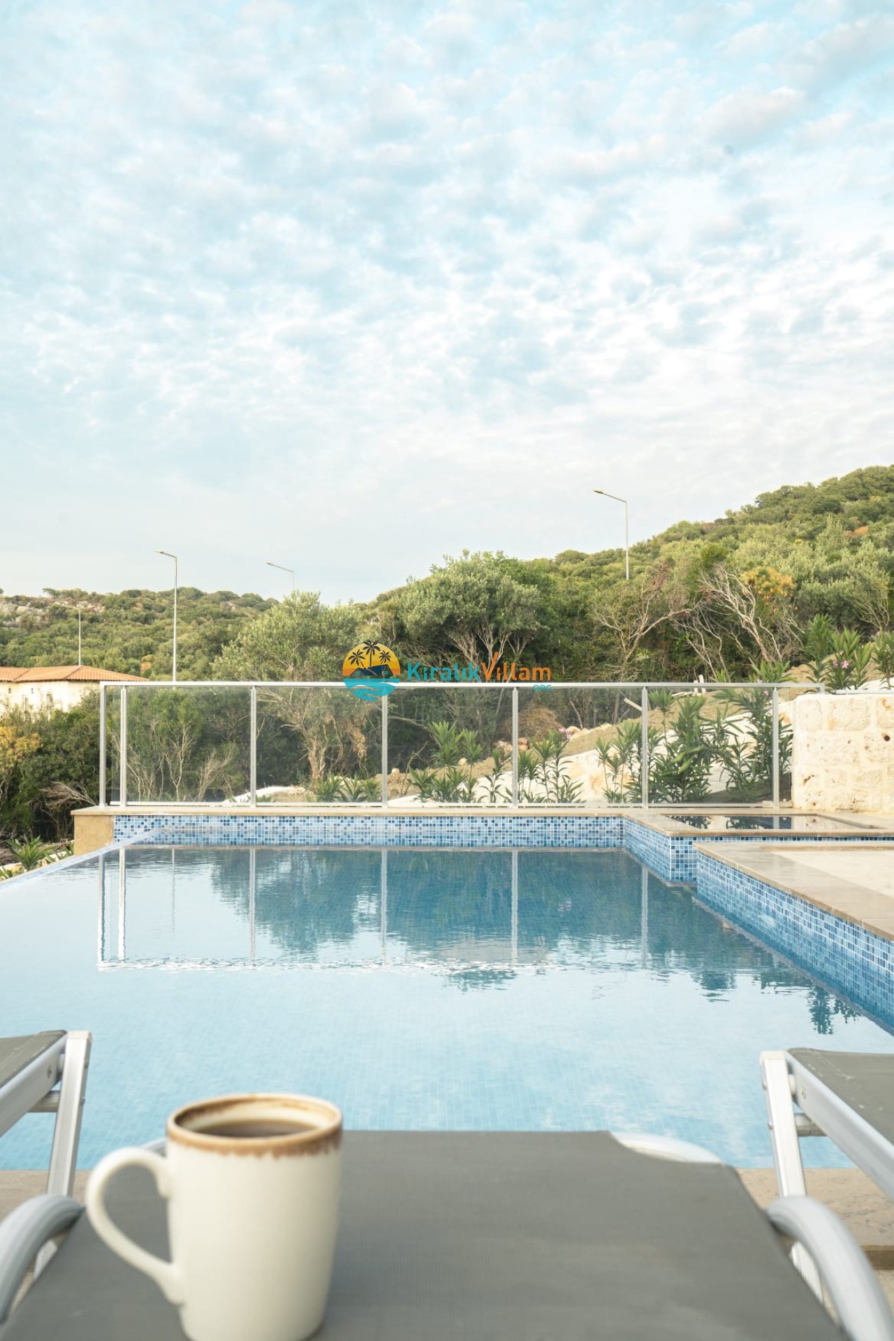 Deniz manzaralı bahçe içerisinde, özel yüzme havuzu, şezlonglar, güneş şemsiyesi, bahçe oturma grubu, bahçe yemek masası ve barbekü yer almaktadır.