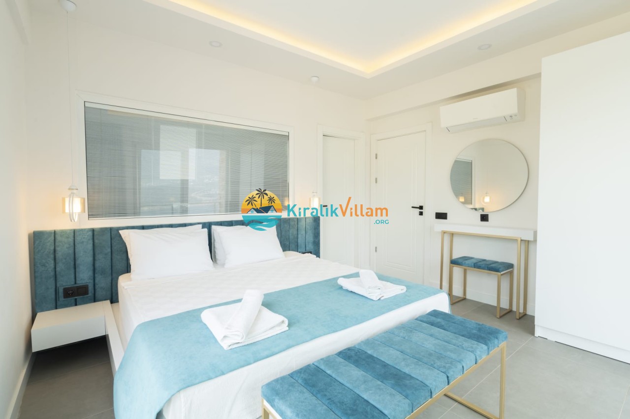 Yatak odası içerisinde, 1 adet çift kişilik yatak, klima, elbise dolabı, komodin, makyaj masası, banyo ve tuvalet yer almaktadır.
