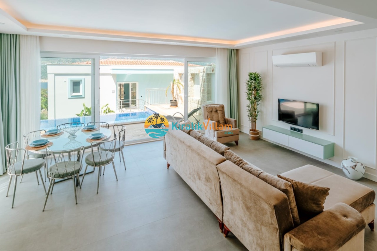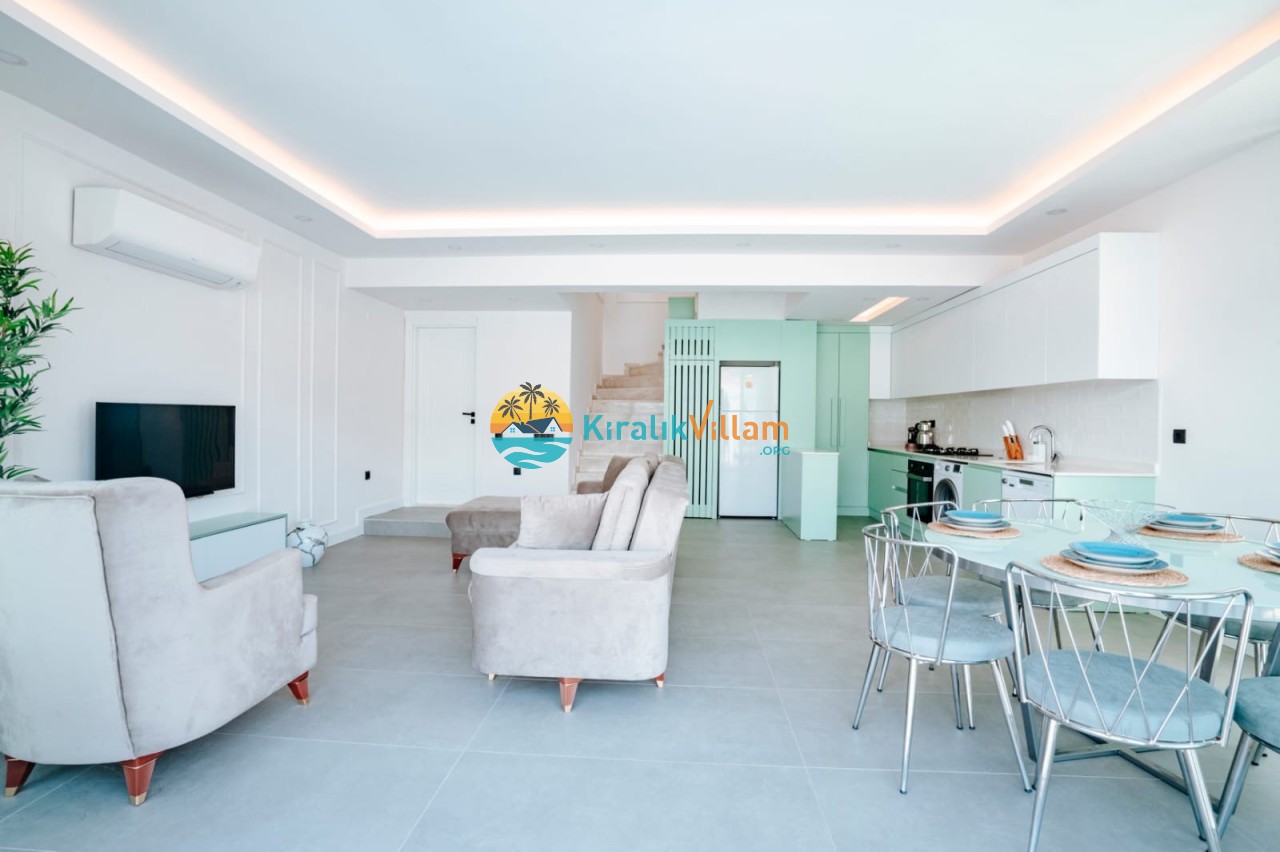 Salon: Deniz manzaralı salon içerisinde, koltuk takımı, orta sehpa, TV, TV ünitesi, klima, uydu alıcısı yer almaktadır.