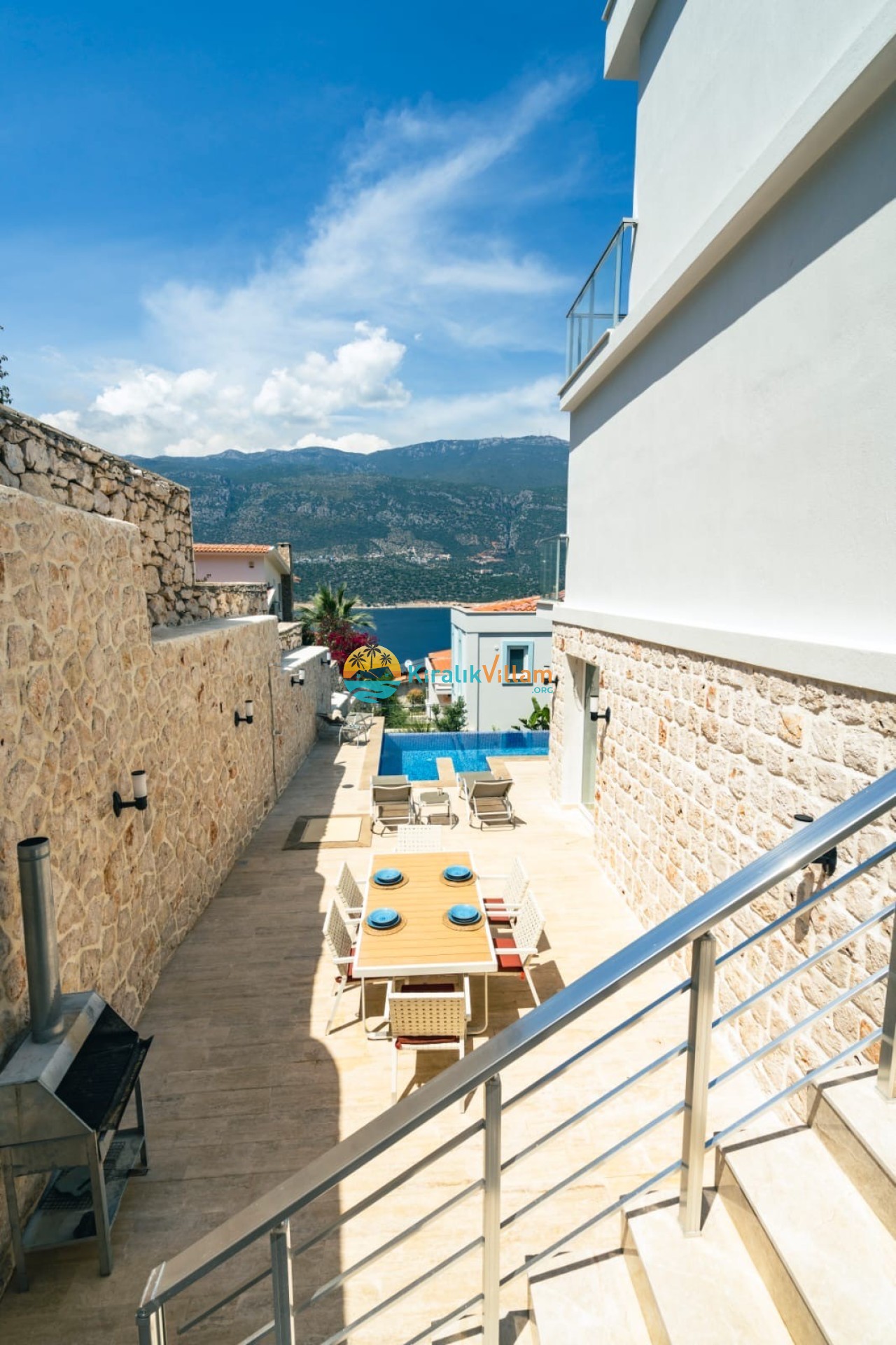 Bahçe Detayları: Deniz manzaralı bahçe içerisinde, özel yüzme havuzu, şezlonglar, güneş şemsiyesi, bahçe oturma grubu, bahçe yemek masası ve barbekü yer almaktadır.