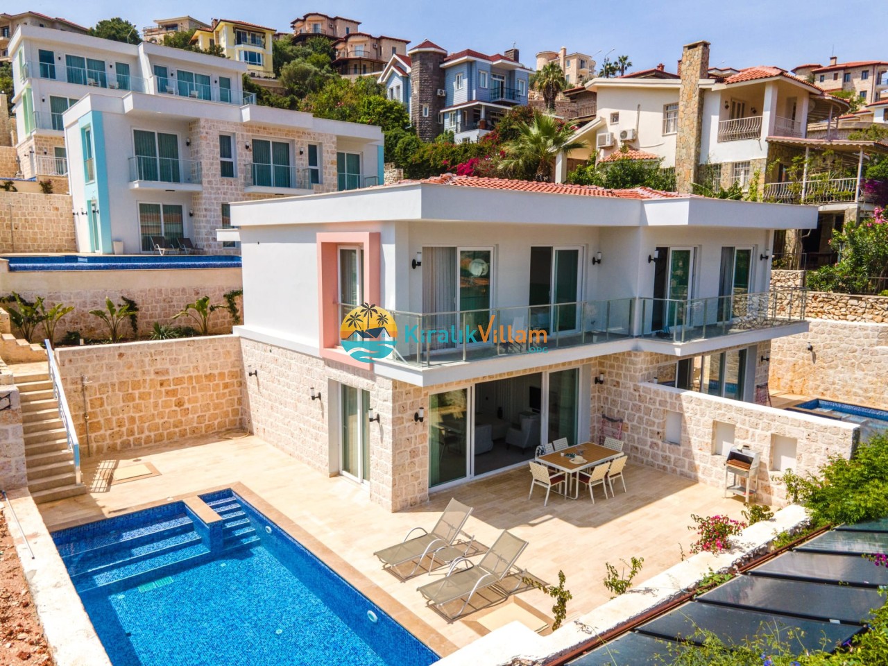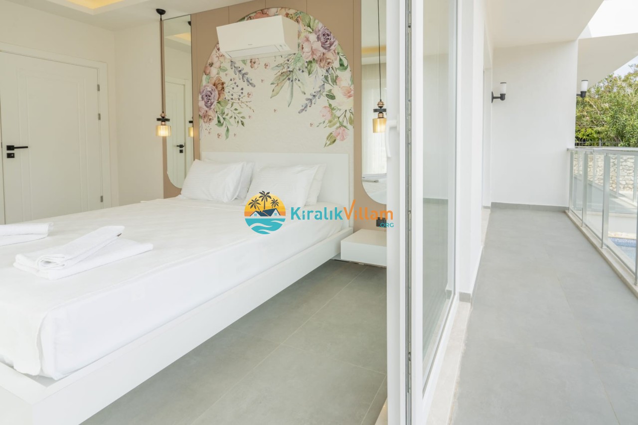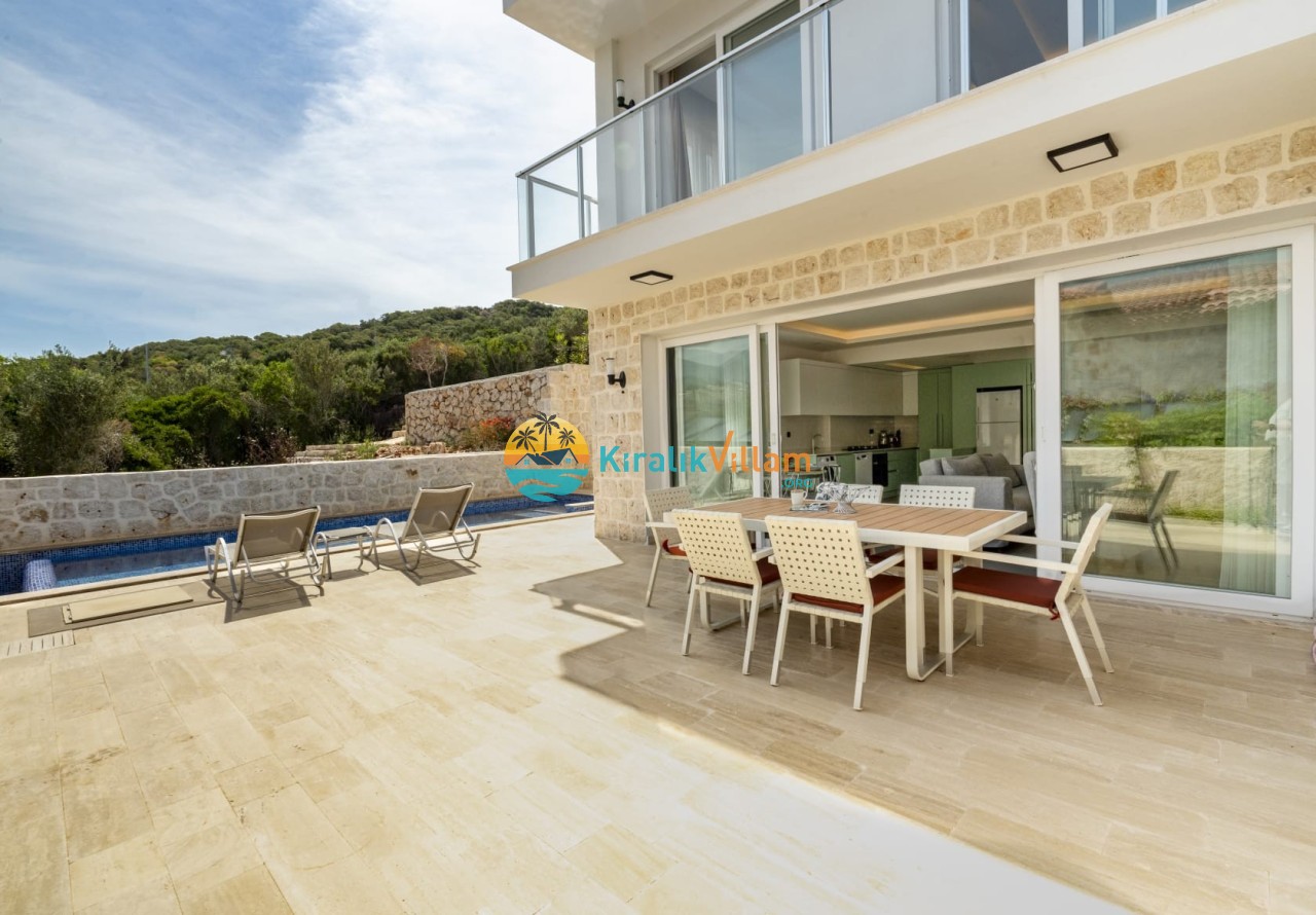 Bahçe: Deniz manzaralı bahçe içerisinde, özel yüzme havuzu, şezlonglar, güneş şemsiyesi, bahçe oturma grubu, bahçe yemek masası ve barbekü yer almaktadır.