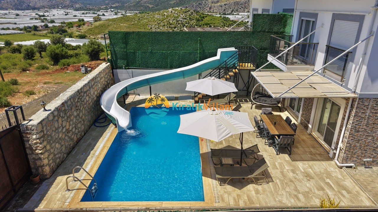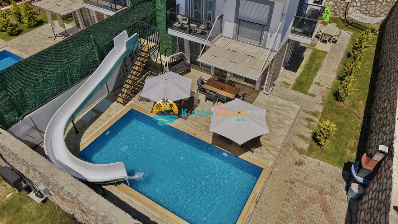Bahçe Detayları: Doğa manzaralı bahçe içerisinde, özel yüzme havuzu, şezlonglar, güneş şemsiyesi, bahçe yemek masası, salıncak, oyun parkı ve barbekü yer almaktadır.