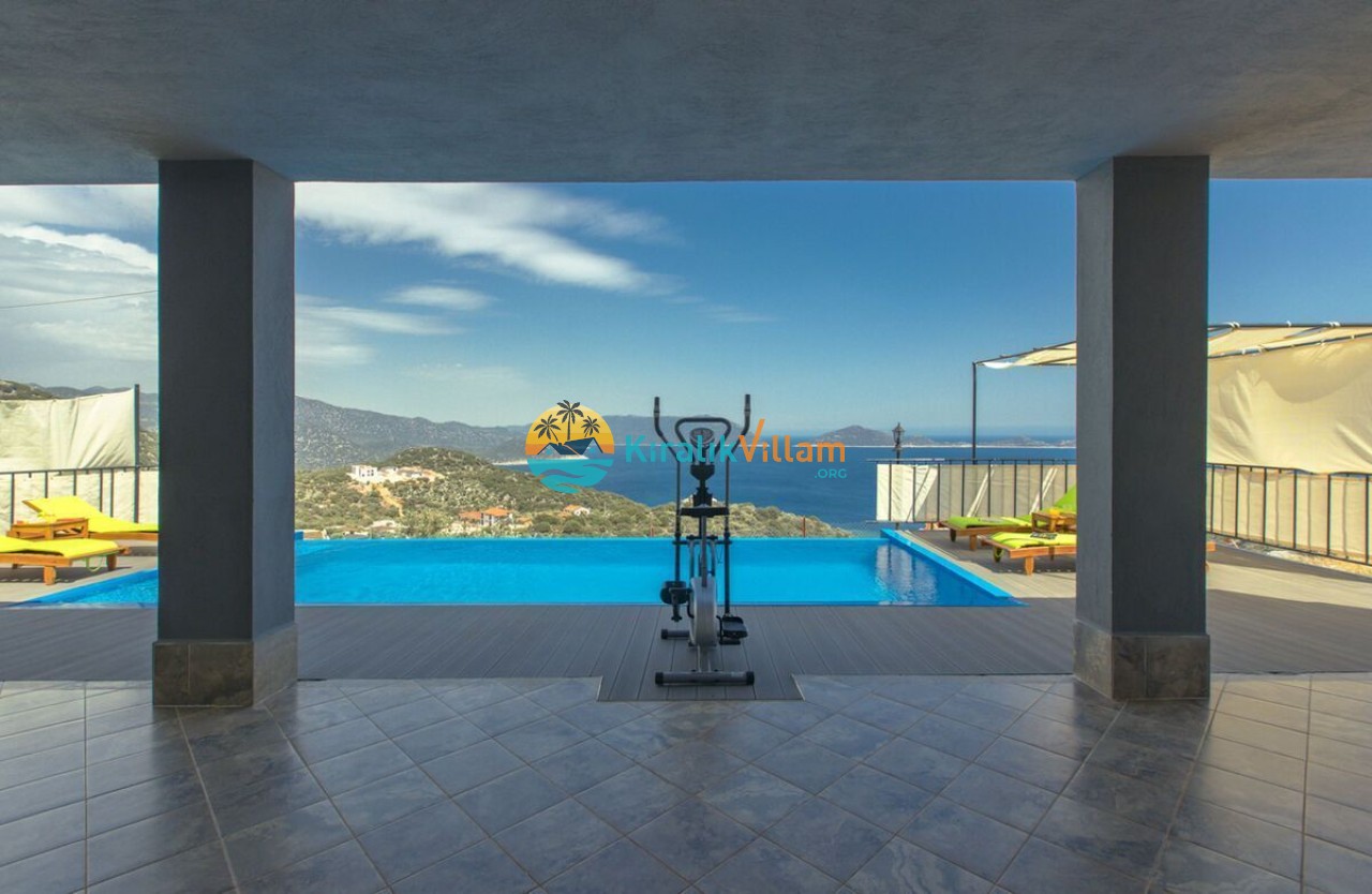 Bahçe Detayları: Deniz ve doğa manzaralı bahçe içerisinde, özel yüzme havuzu, şezlonglar, güneş şemsiyesi, bahçe yemek masası, spor bisikleti, barbekü yer almaktadır.