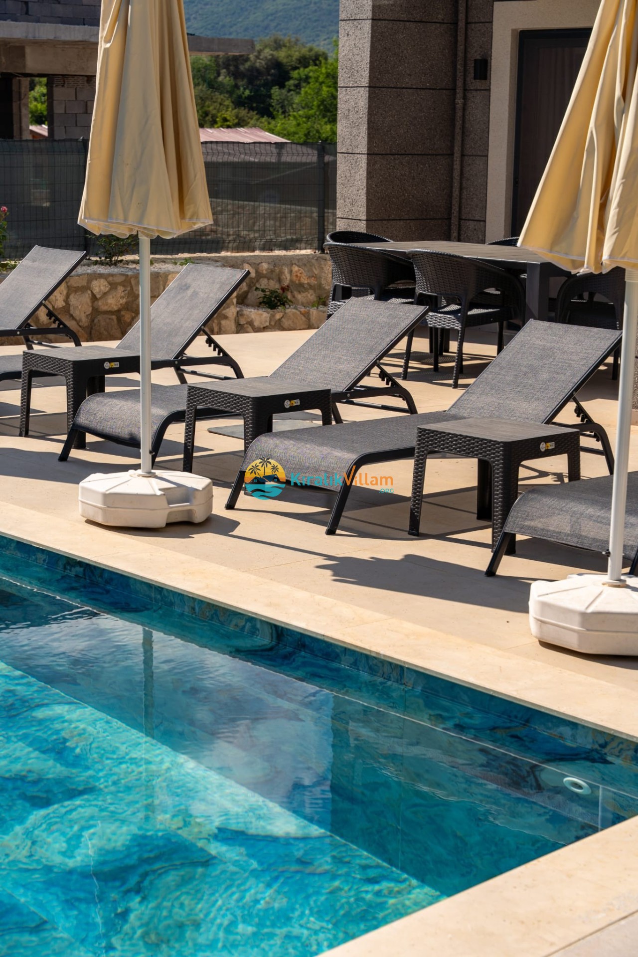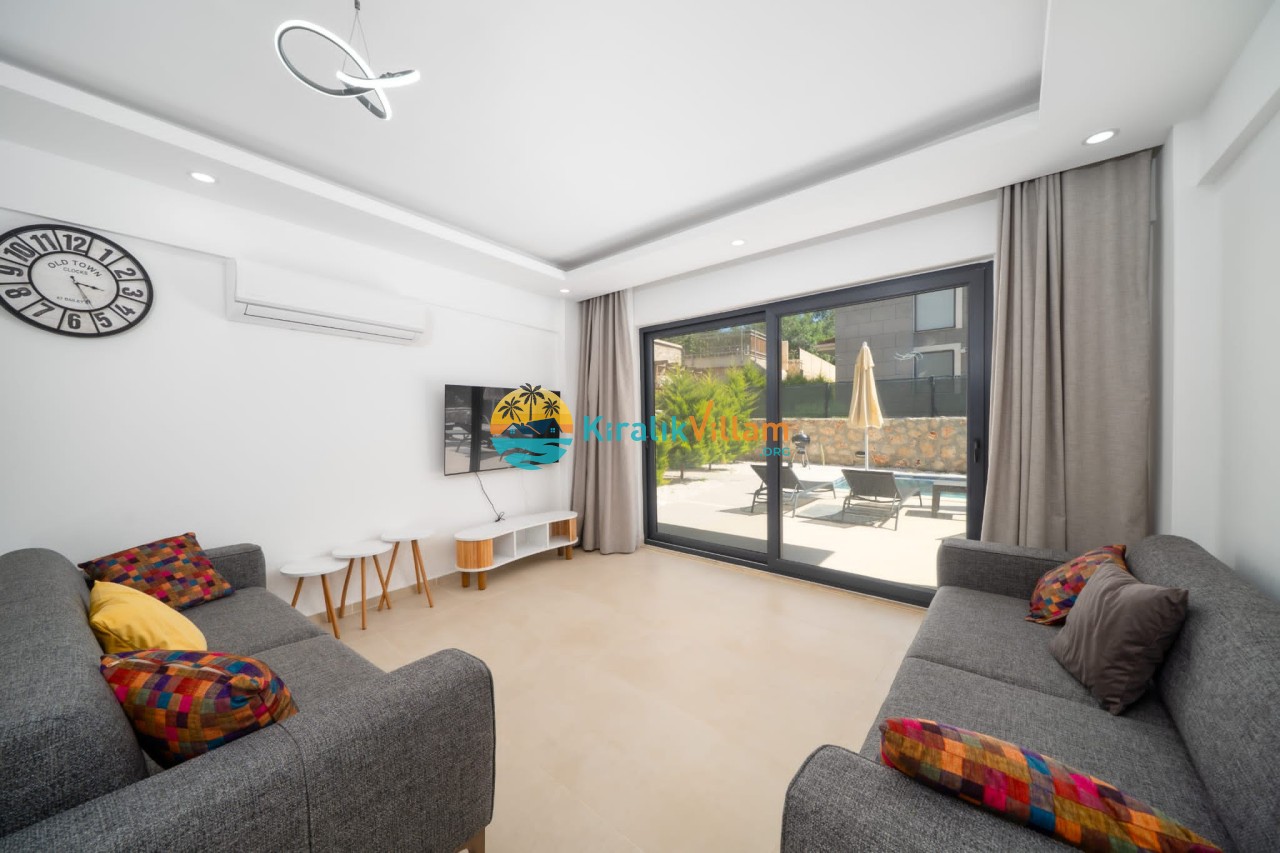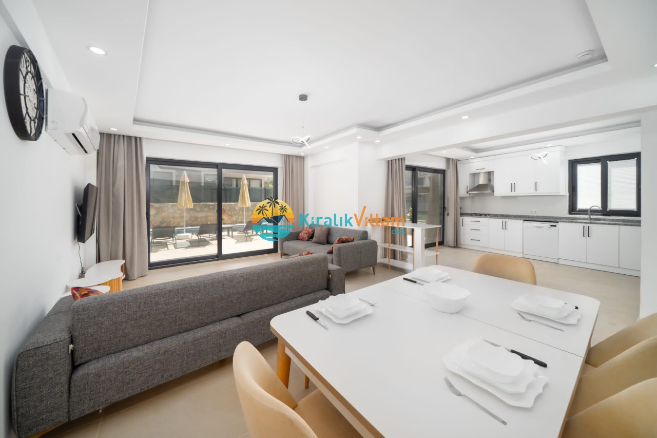 Salon: Modern eşyalar ile dekore edilmiş slaonda rahat koltuk, TV, TV ünitesi, Dvd oynatıcı, uydu alıcısı, klima ve internet yer almaktadır. Salondan havuz terasına geçiş vardır.