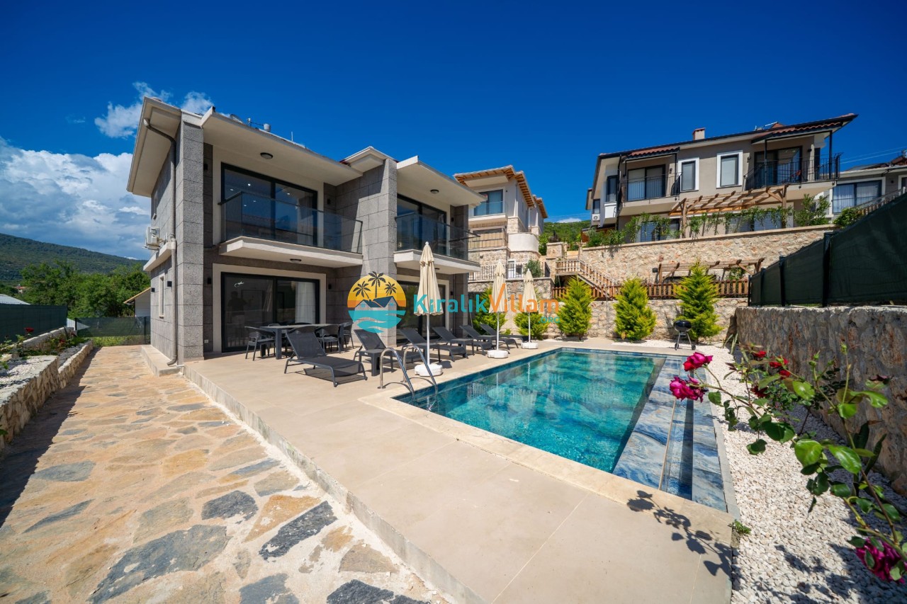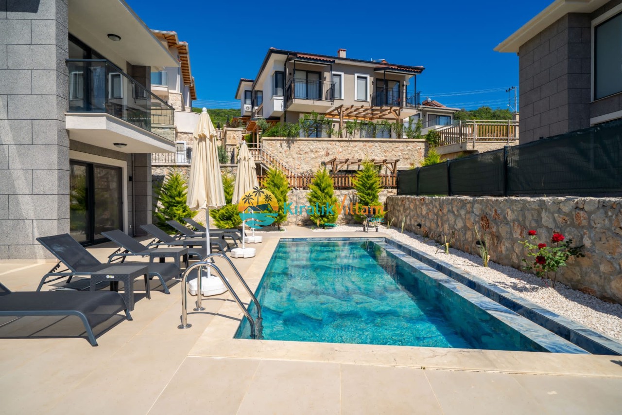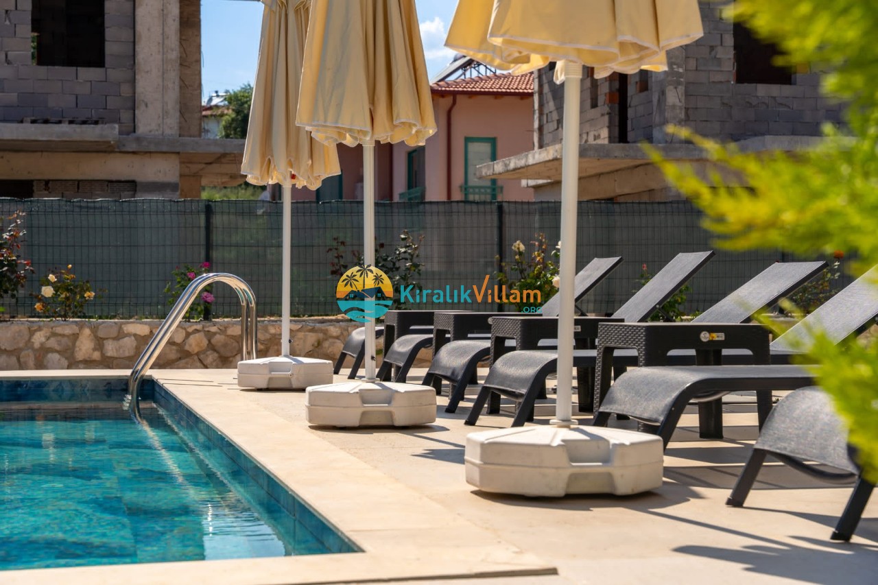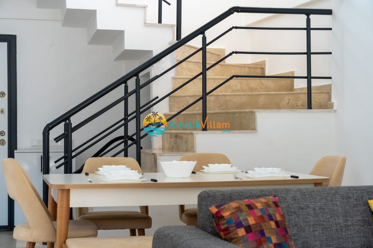 Salon: Modern eşyalar ile dekore edilmiş slaonda rahat koltuk, TV, TV ünitesi, Dvd oynatıcı, uydu alıcısı, klima ve internet yer almaktadır. Salondan havuz terasına geçiş vardır.