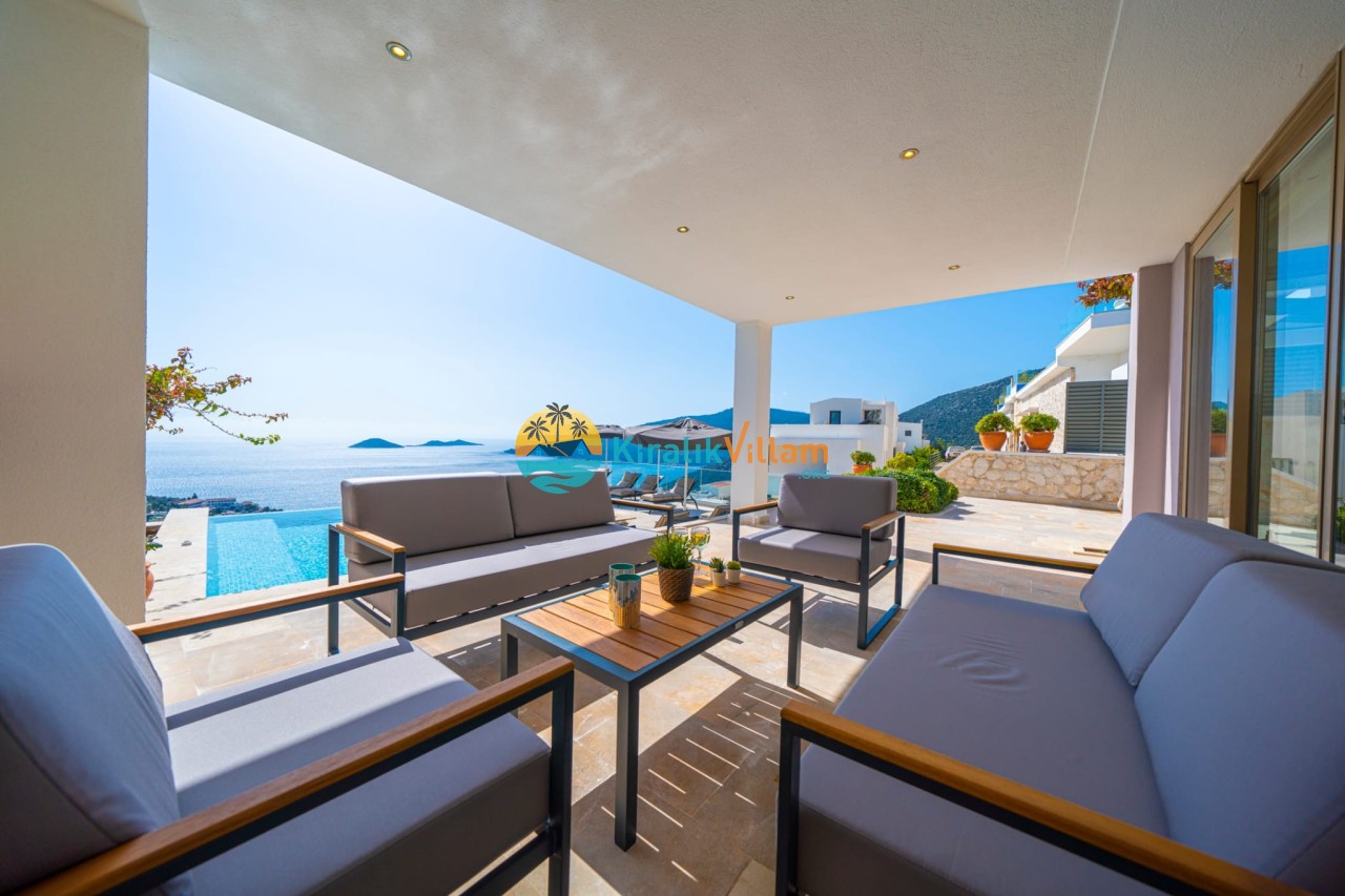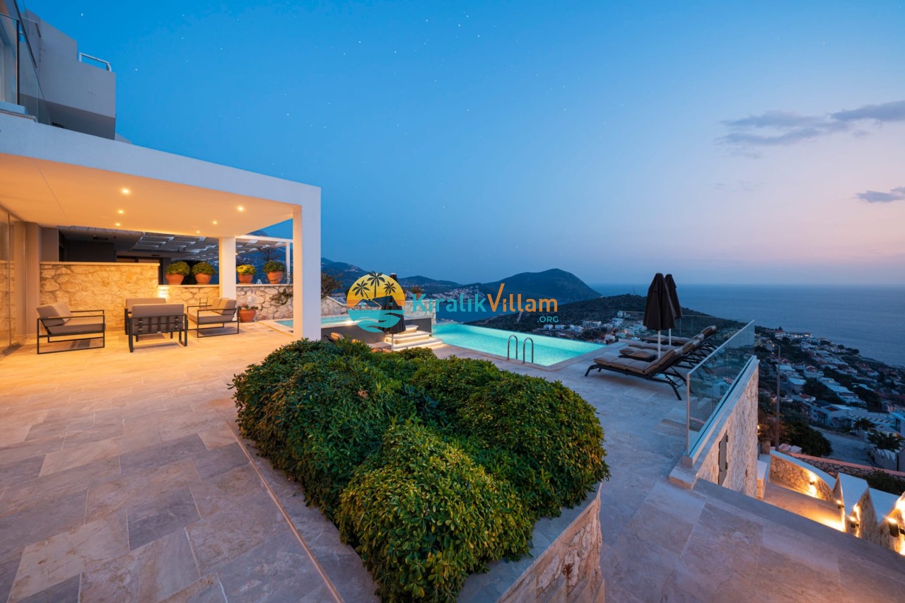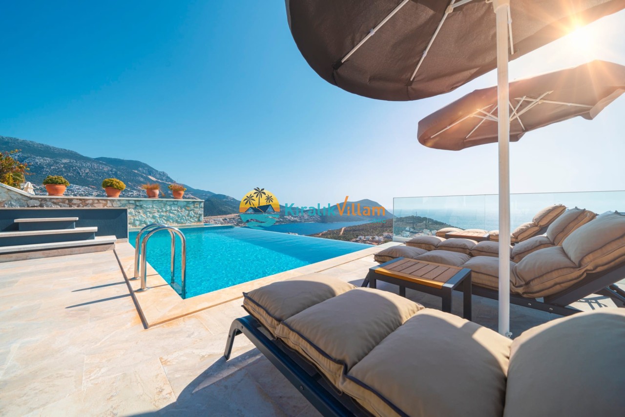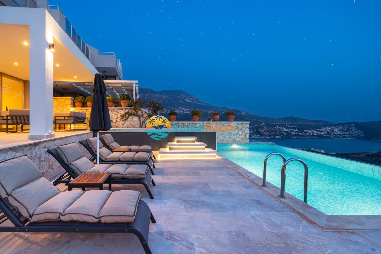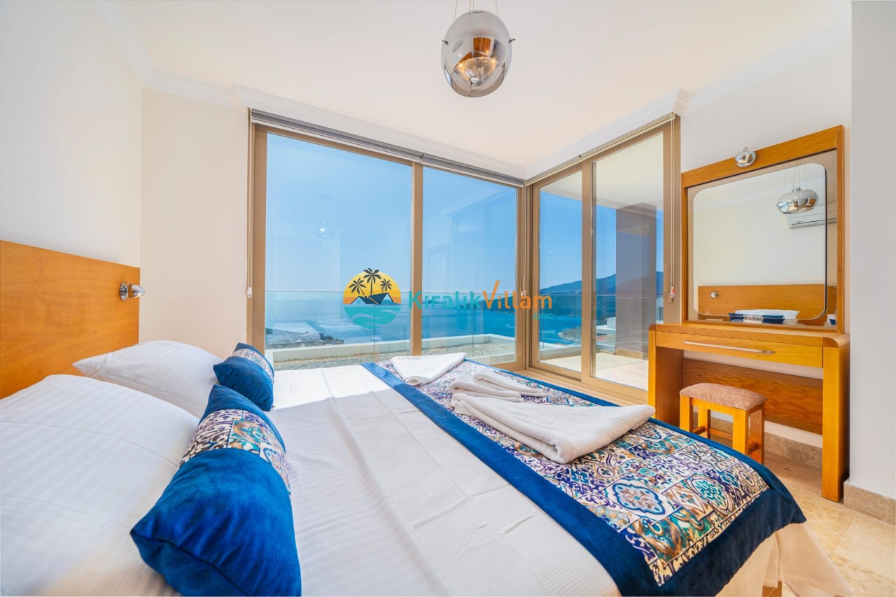 Villa Safran View, Kalkan Kalamar Koyu’nda yer alan 4 yatak odalı 8 kişilik kapasiteye sahip olan villamız geniş aileler ve arkadaş grupları için oldukça ideal bir seçenektir. Villa Safran View, Kalabalık aile ve arkadaş gruplarının rahatlıkla konaklayabileceği villamızın manzaralı bahçesinde sevdiklerinizle eğlenceli vakit geçirebileceğiniz havuz, şezlong, güneş şemsiyeleri, oturma köşesi, yemek masası ve barbekü alanı yer almaktadır. Ayrıca konforunuz için son derece modern ve kaliteli eşyalar ile dekore edilmiş villamızın terasında sakinleşebileceğiniz jakuzi yer almaktadır.