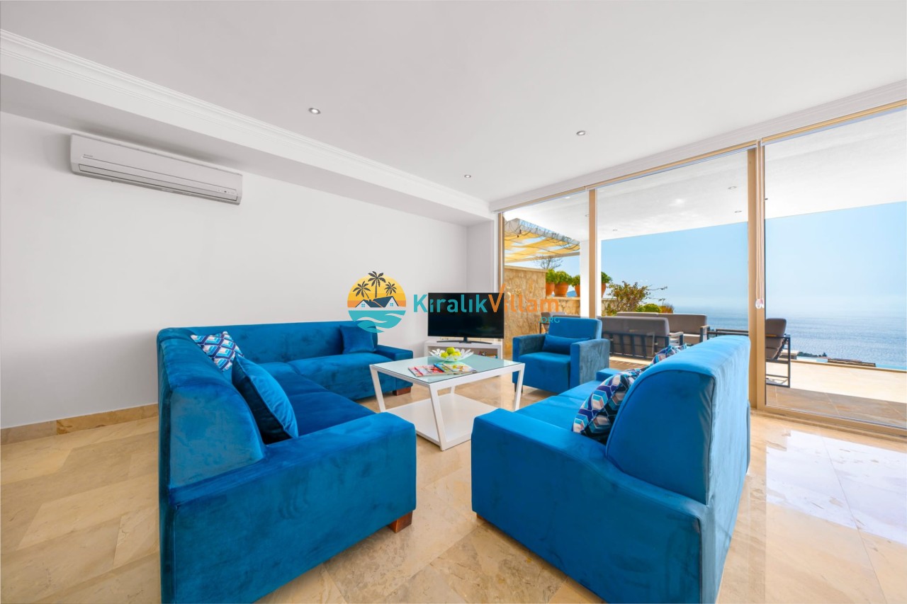 Salon: Aydınlık ve ferah, manzaralı salon içerisinde konforlu ve lüks oturma grubu, TV, DVD oynatıcı, uydu alıcısı ve klima yer almaktadır. Salondan havuz terasına geçiş vardır.