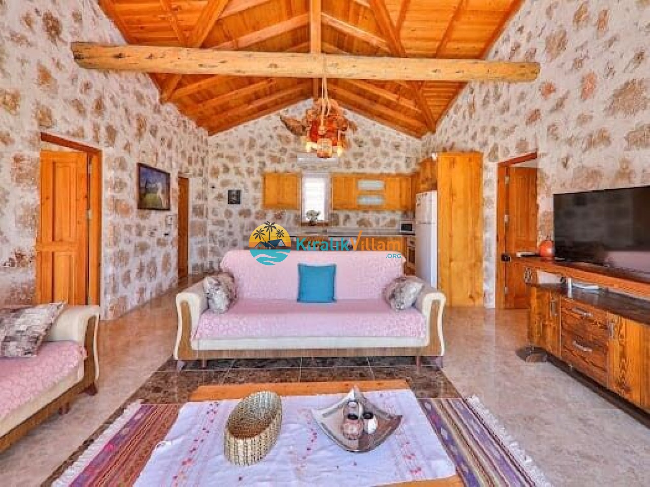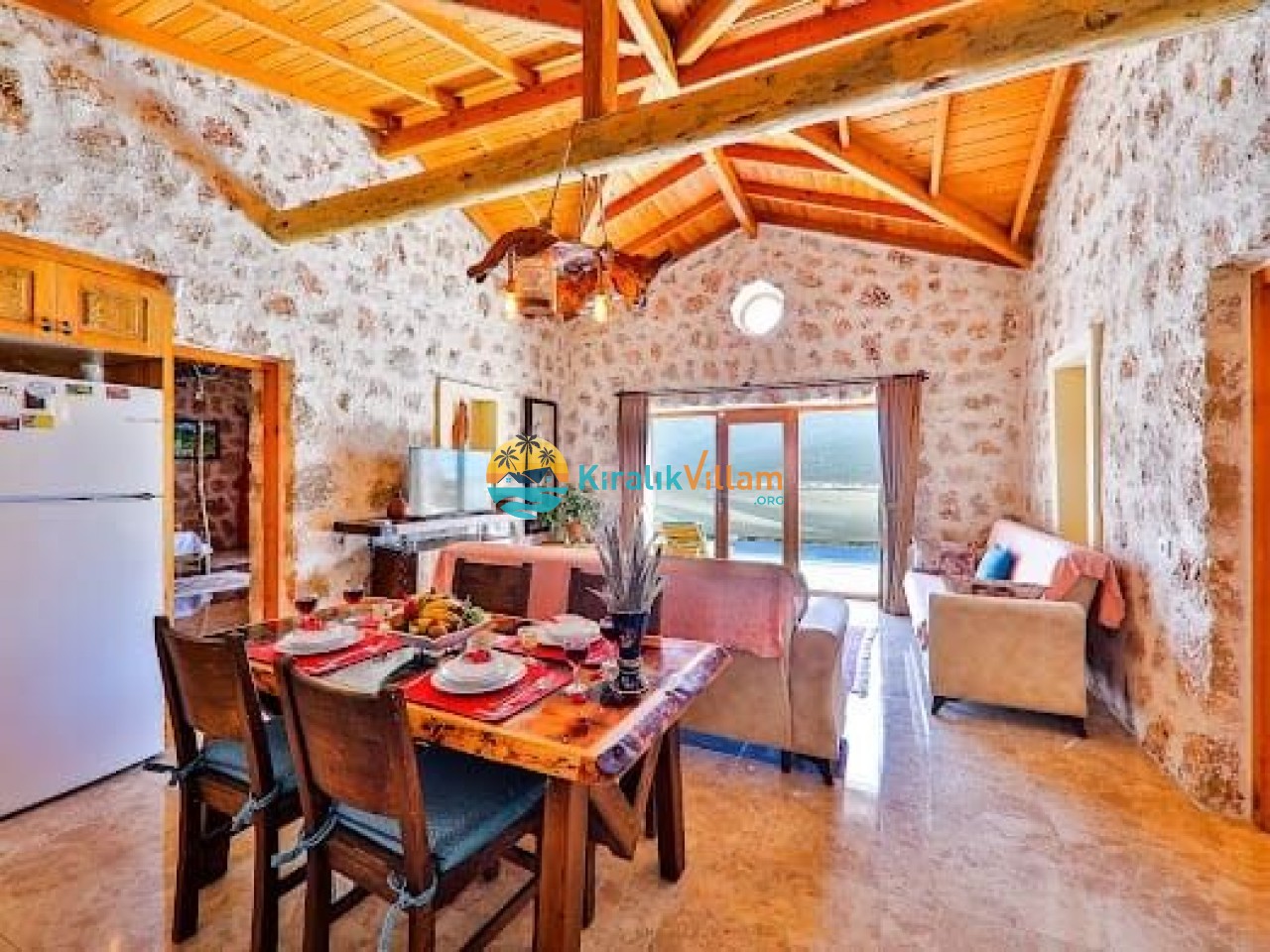 Ahşap ve taş mimarisi ile modern salonda konforlu oturma grubu, TV, TV ünitesi, DVD oynatıcı, uydu alıcısı ve klima yer almaktadır. Salondan havuz terasına geçiş vardır.