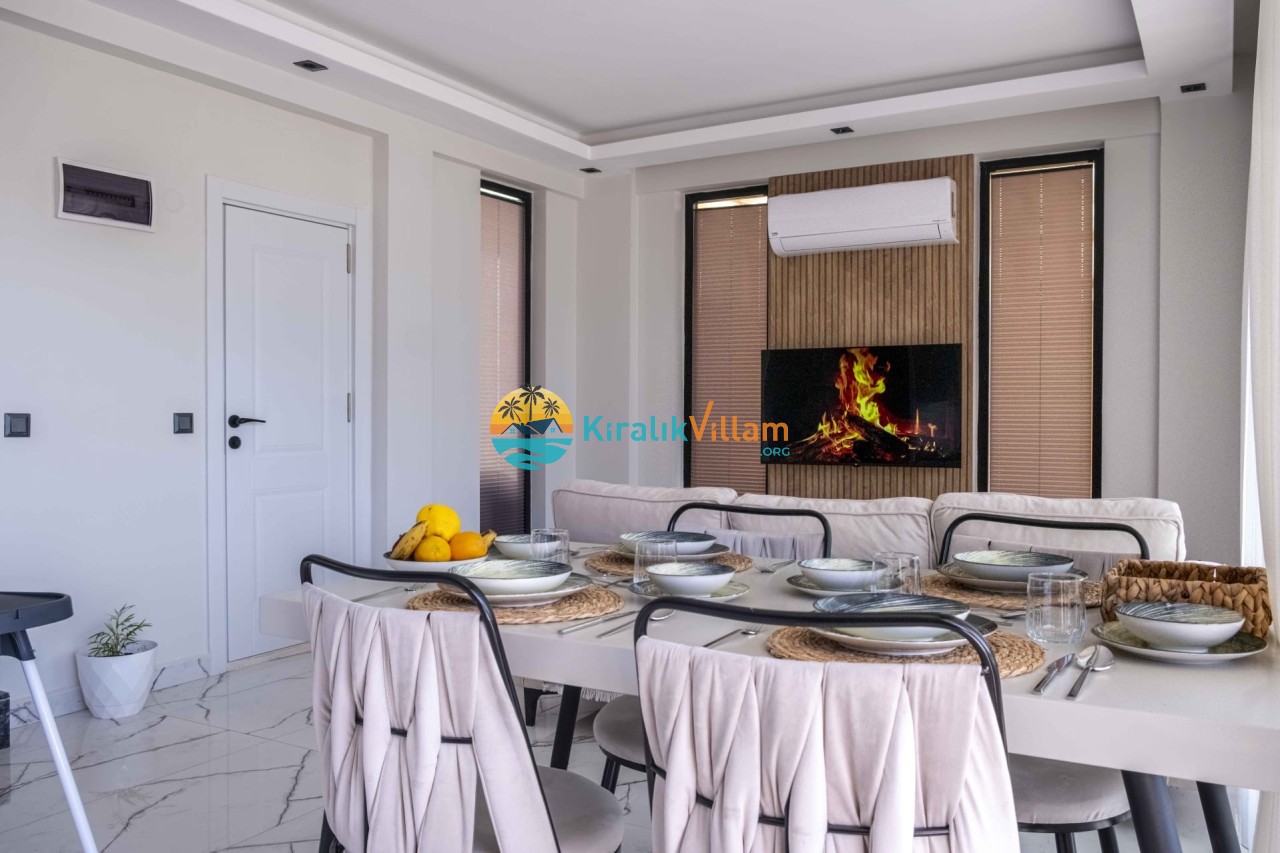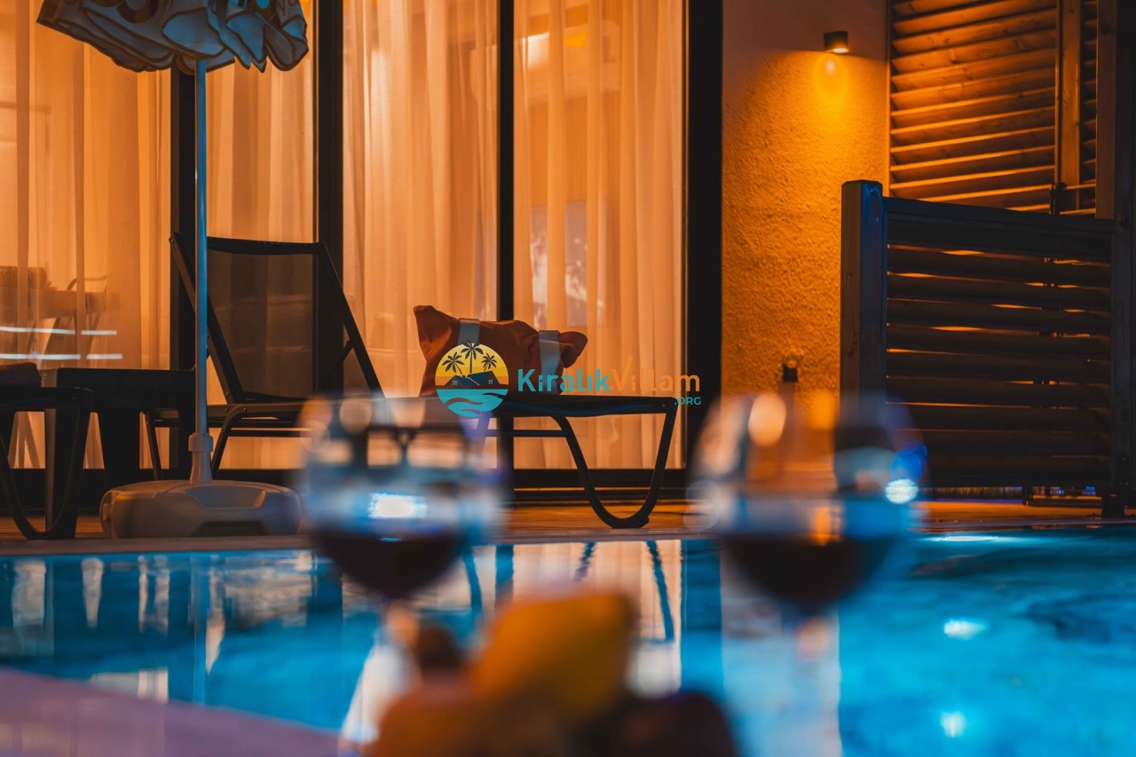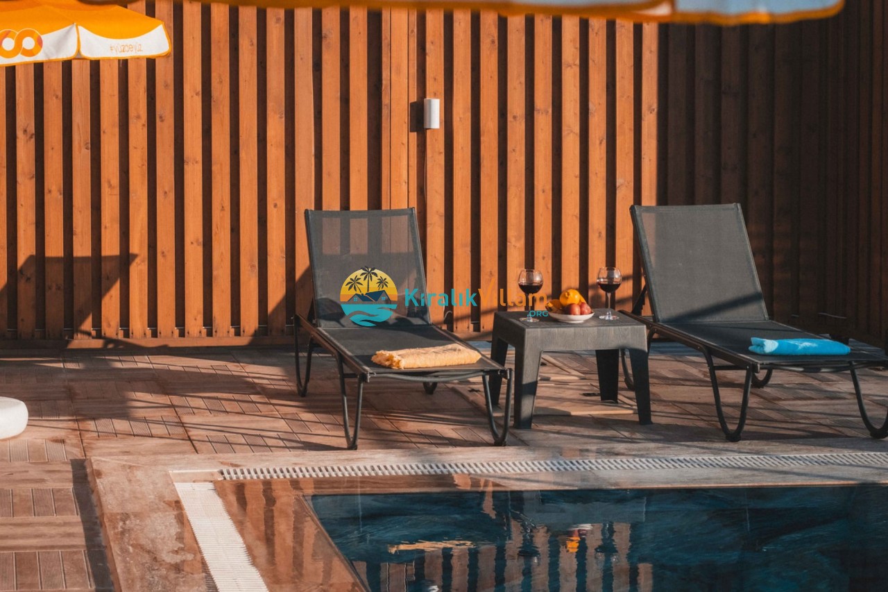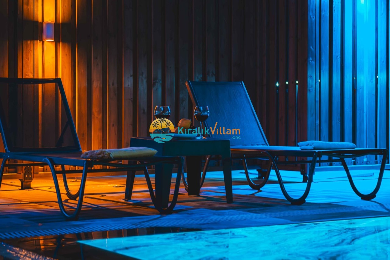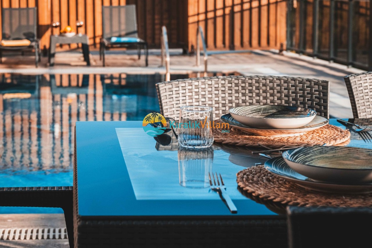 Salon : Modern ve lüks dizayna sahip salon içerisinde konforlu oturma grubu, TV, DVD oynatıcı, klima ve internet yer almaktadır. Salondan havuz terasına geçiş vardır.