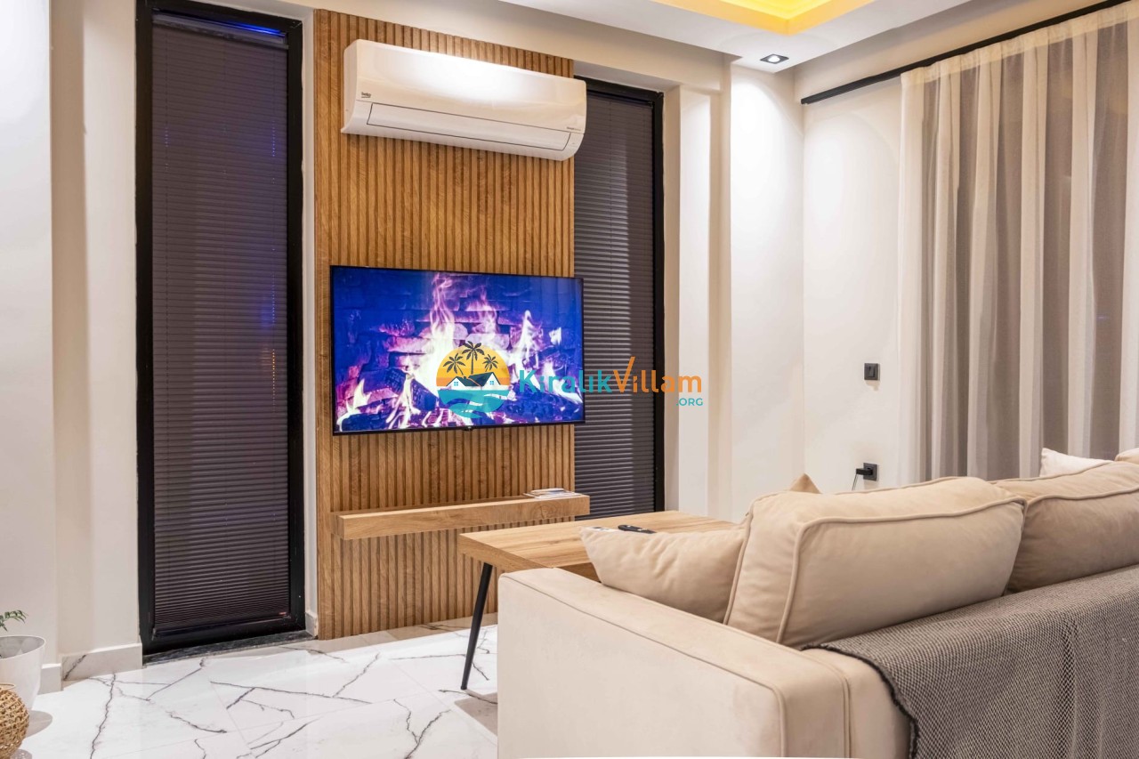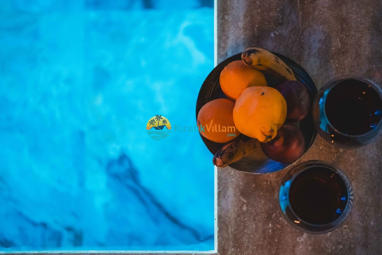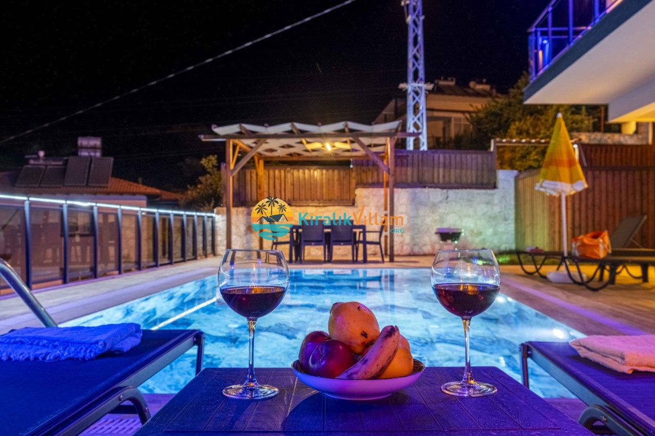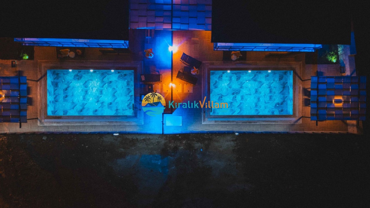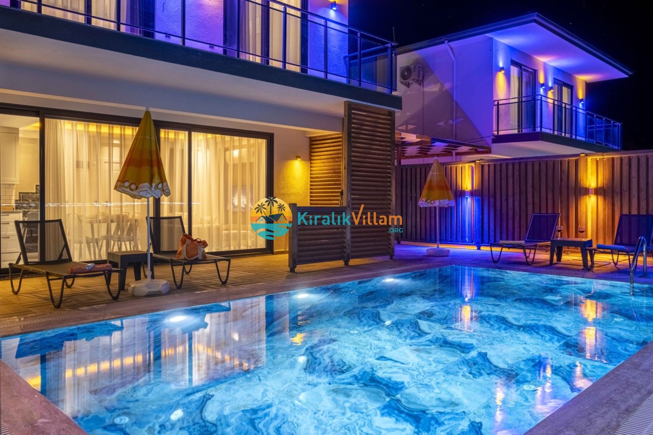 Salon : Modern ve lüks dizayna sahip salon içerisinde konforlu oturma grubu, TV, DVD oynatıcı, klima ve internet yer almaktadır. Salondan havuz terasına geçiş vardır.