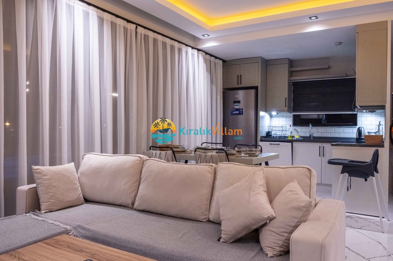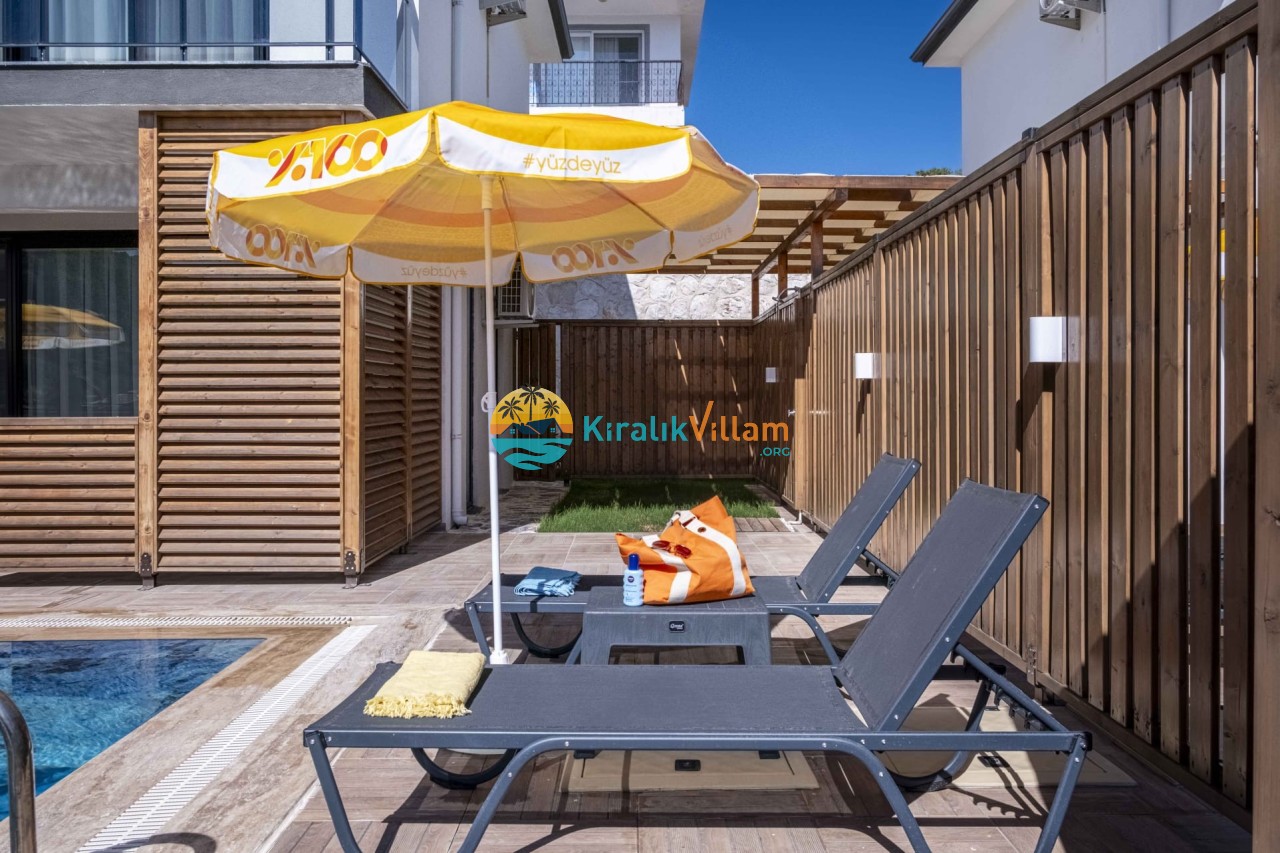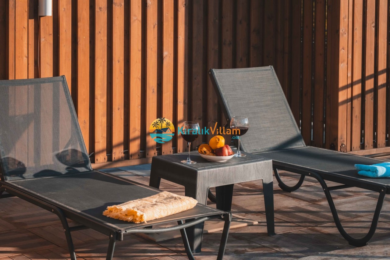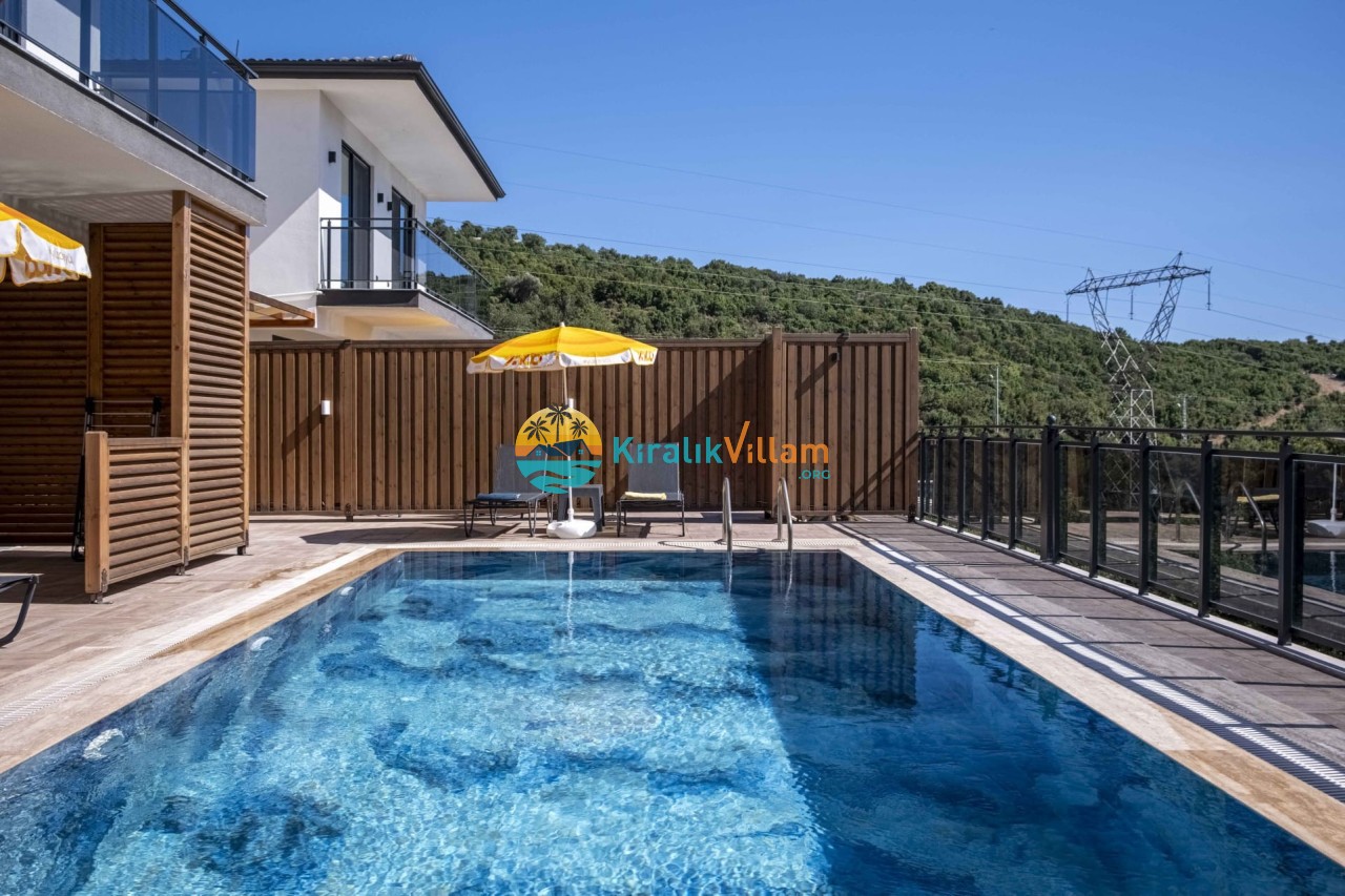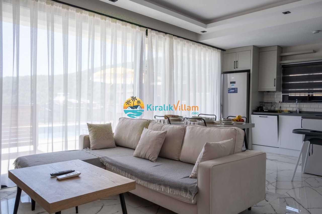 Salon : Modern ve lüks dizayna sahip salon içerisinde konforlu oturma grubu, TV, DVD oynatıcı, klima ve internet yer almaktadır. Salondan havuz terasına geçiş vardır.