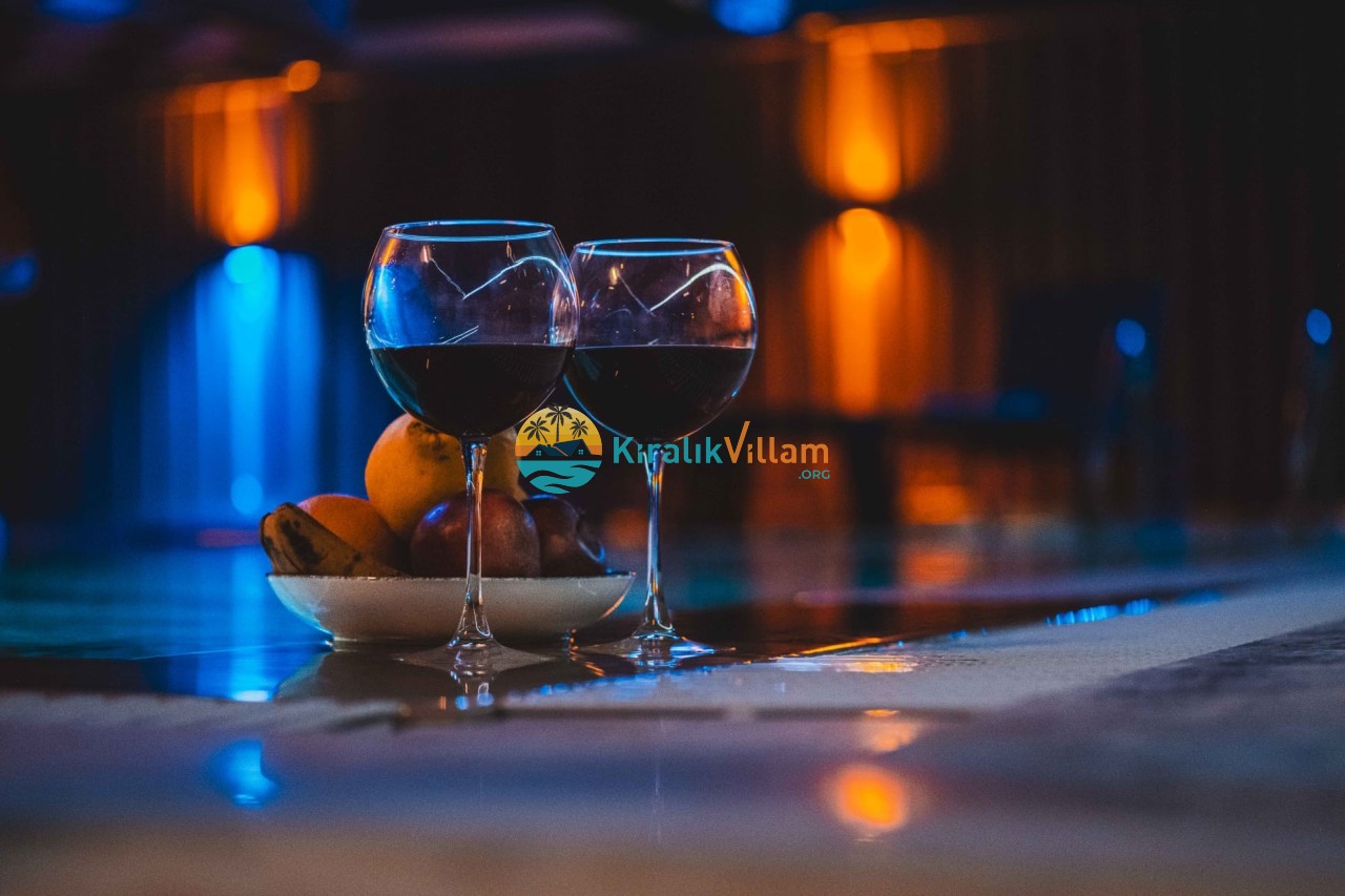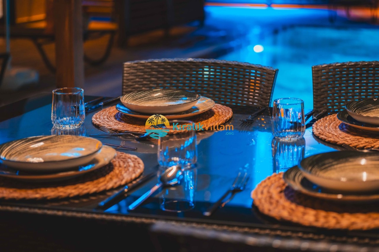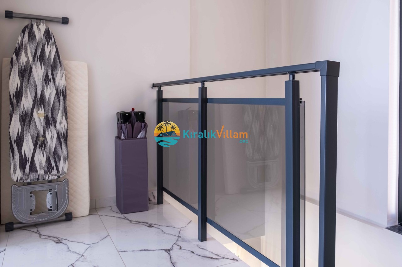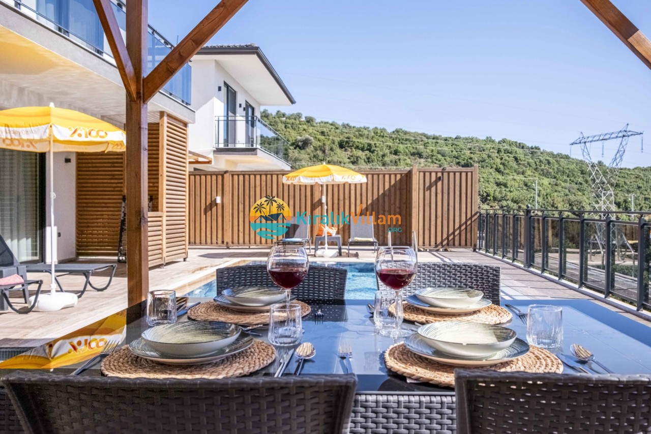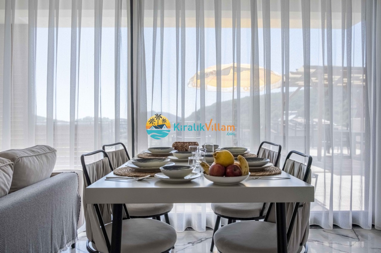 Salon : Modern ve lüks dizayna sahip salon içerisinde konforlu oturma grubu, TV, DVD oynatıcı, klima ve internet yer almaktadır. Salondan havuz terasına geçiş vardır.