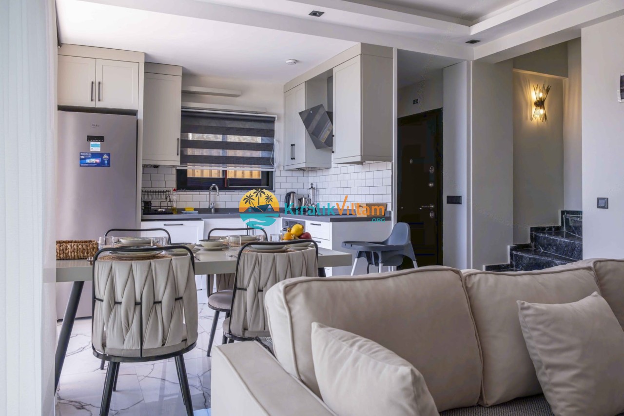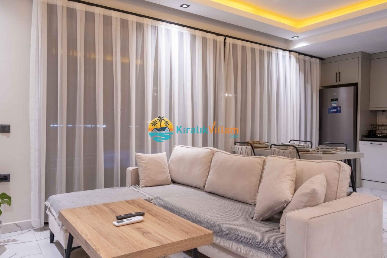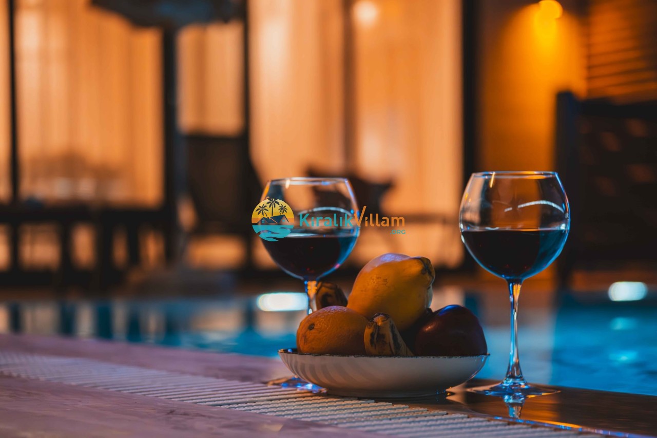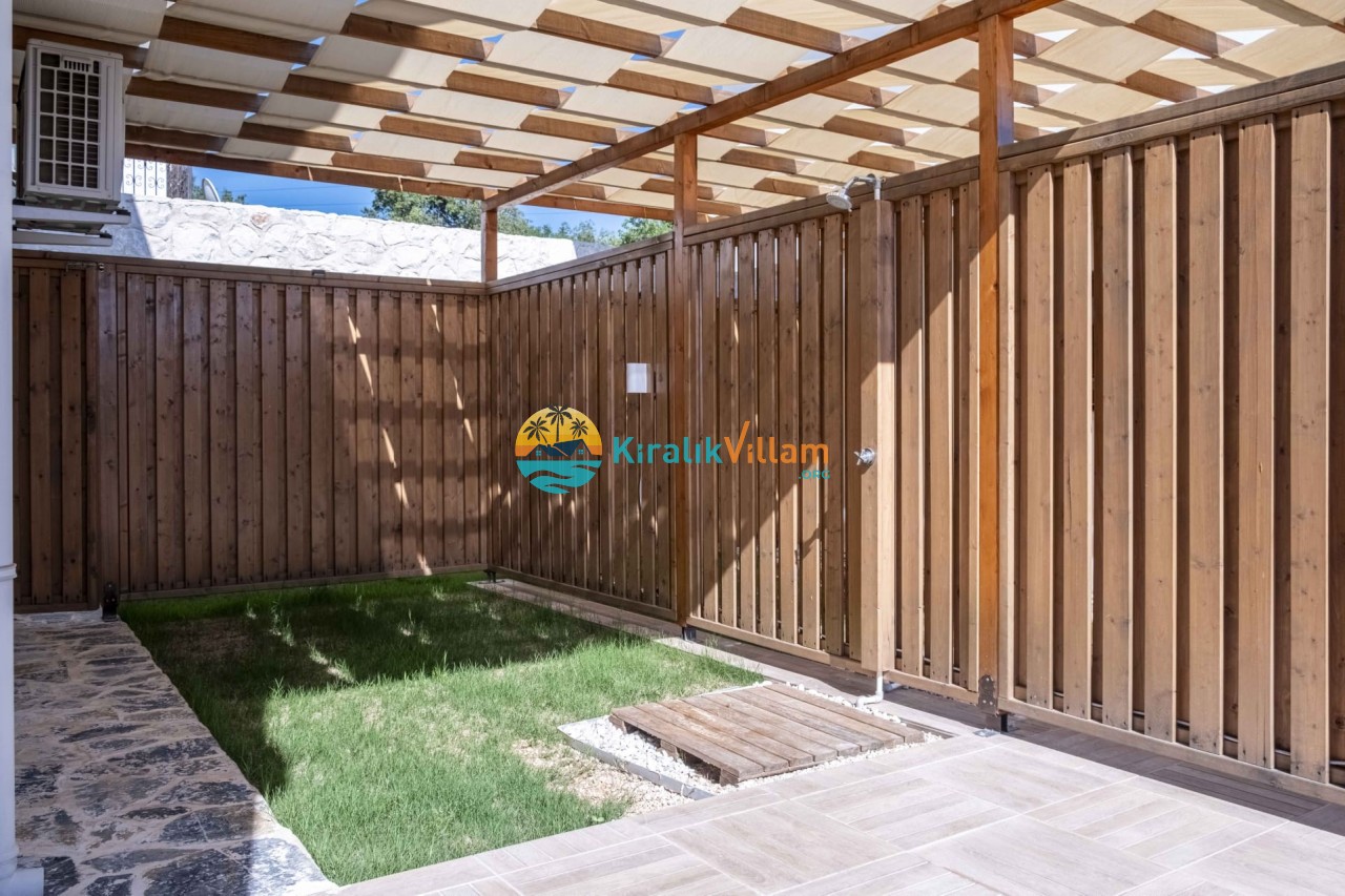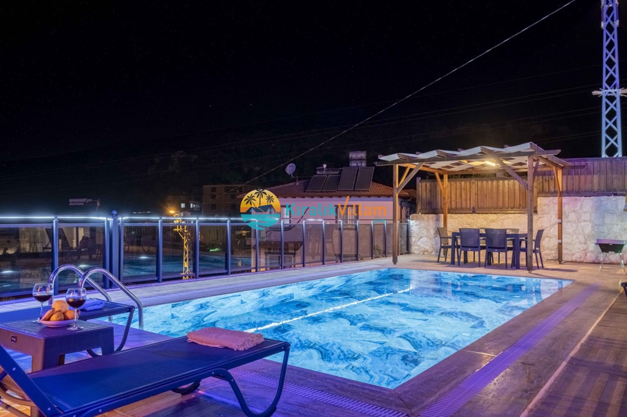 Salon : Modern ve lüks dizayna sahip salon içerisinde konforlu oturma grubu, TV, DVD oynatıcı, klima ve internet yer almaktadır. Salondan havuz terasına geçiş vardır.