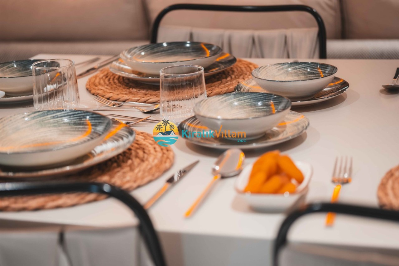 Mutfak : Evizinizin mutfağını aratmayacak Amerikan mutfak içerisinde buzdolabıü bulşaık makinesii çamaşır makinesi, ocak, fırın, su ısıtıcısı, tost makinesi, yemek masası, yemek takımı ve yemek pişirme araç gereçleri yer almaktadır.