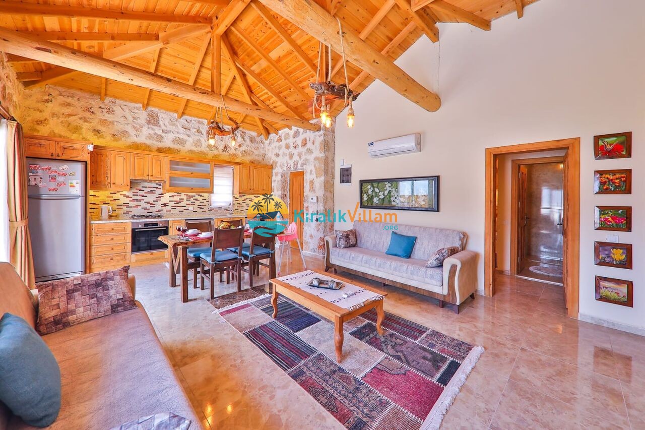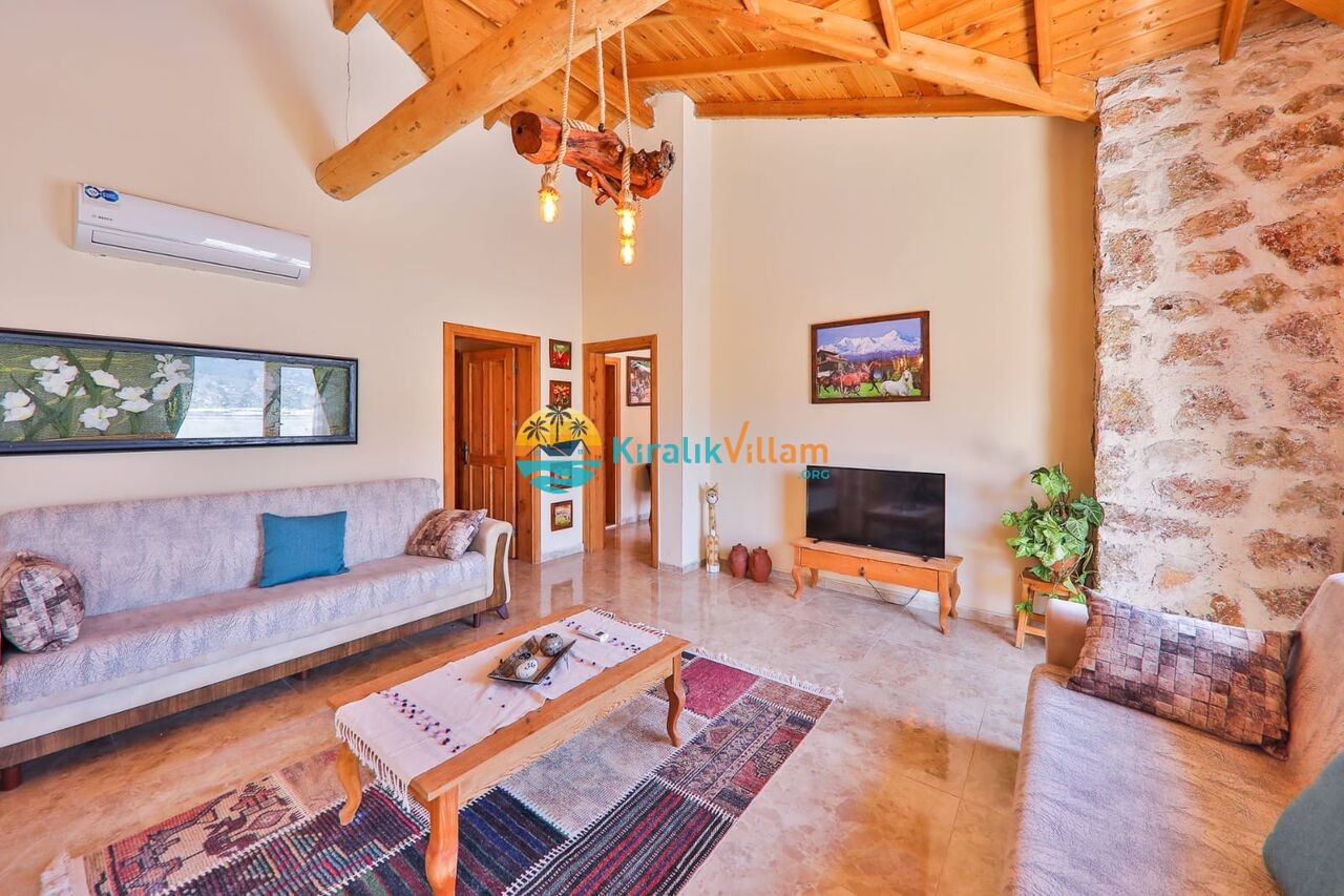 Taş ve ahşap mimarinin hakim olduğu salonda konforlu oturma grubu, TV, DVD oynatıcı, uydu alıcısı, orta sehpa ve klima yer almaktadır. Salondan havuz terasına geçiş vardır.